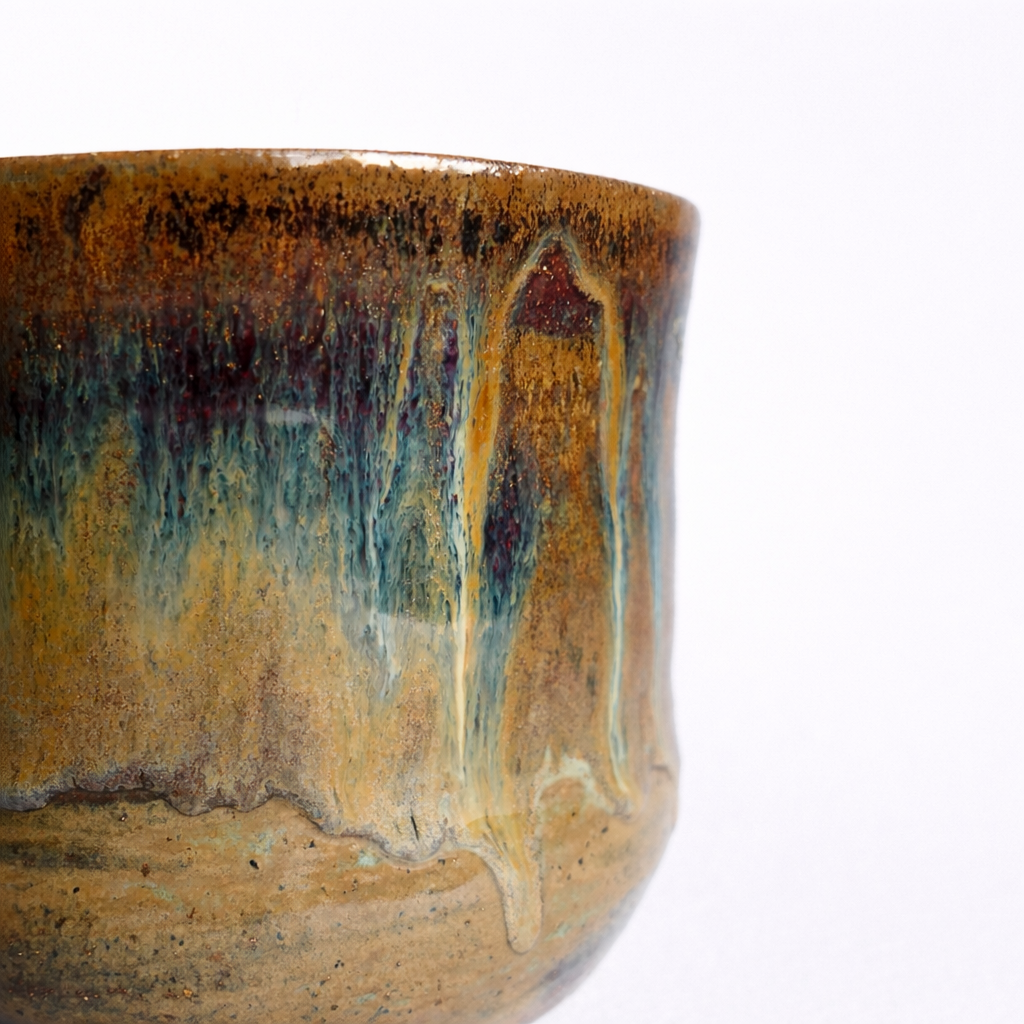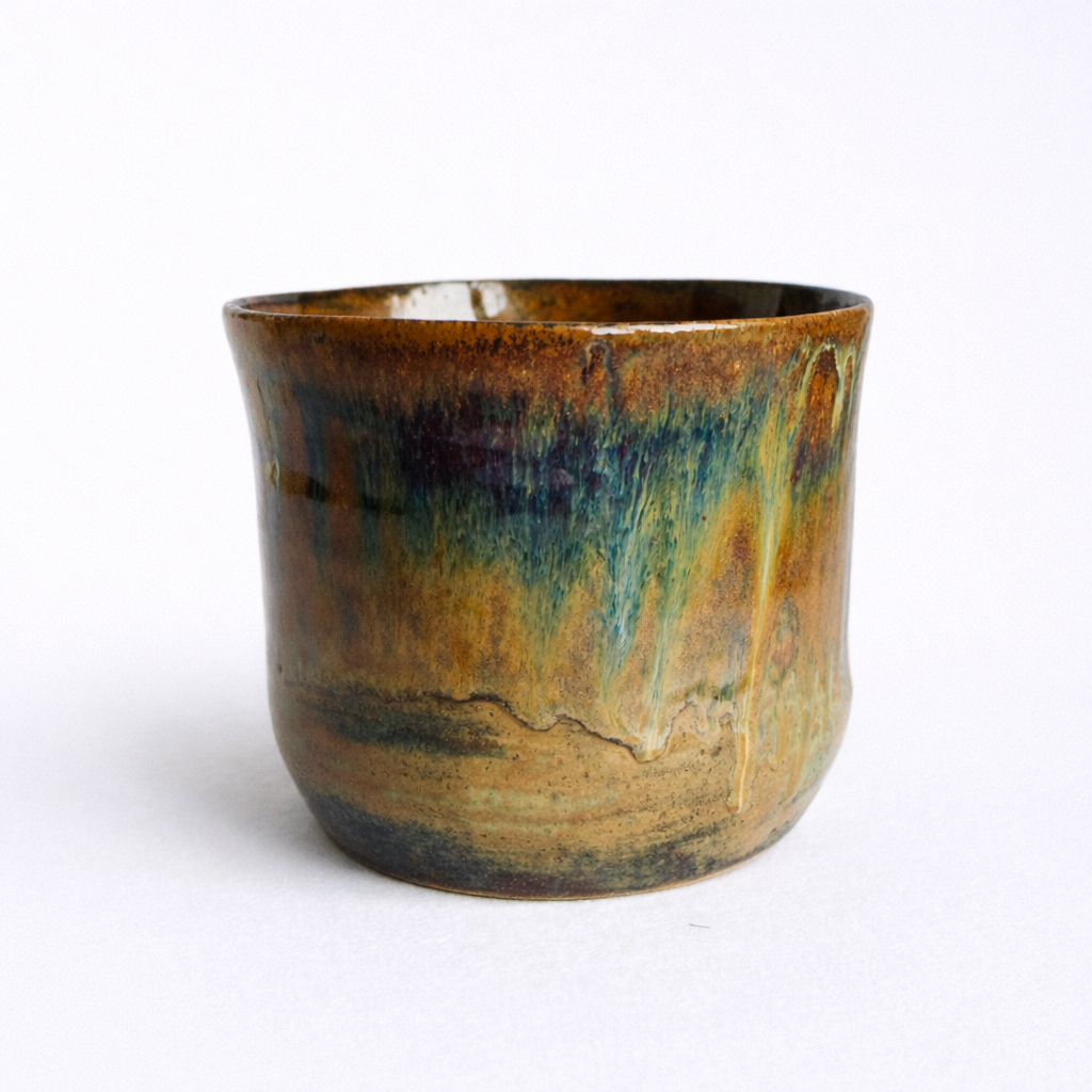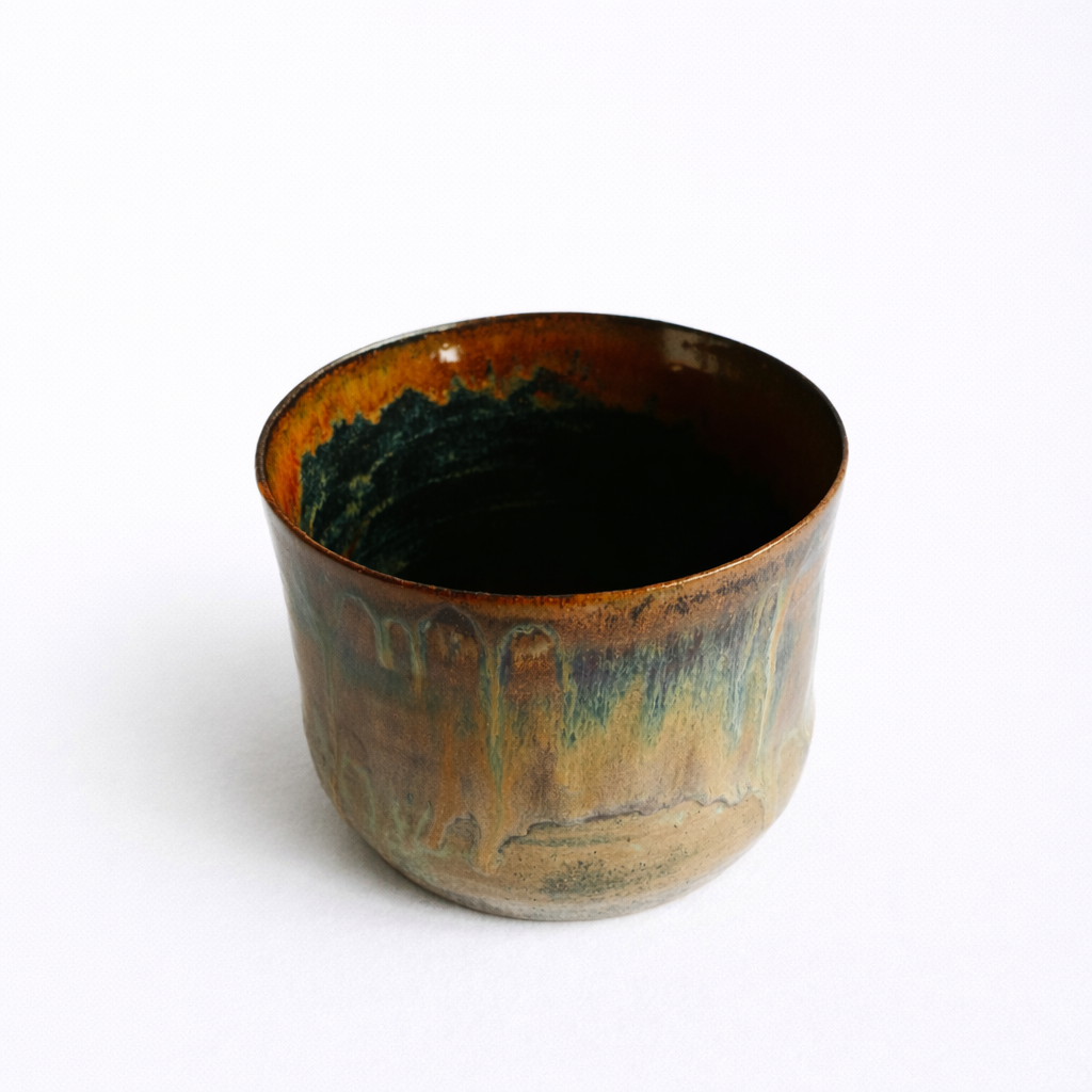 Denne håndlagde keramiske blomsterpotten har en elegant, tidløs form med en svakt utvidet toppkant som gir et balansert uttrykk. Glasuren er en vakker kombinasjon av varme jordtoner og dype blågrønne nyanser, som flyter sammen i et organisk mønster. De naturlige fargeovergangene og drypp-effekten skaper et unikt preg. Potten er perfekt for mellomstore planter, og tilfører en kunstnerisk og organisk følelse til ethvert rom.