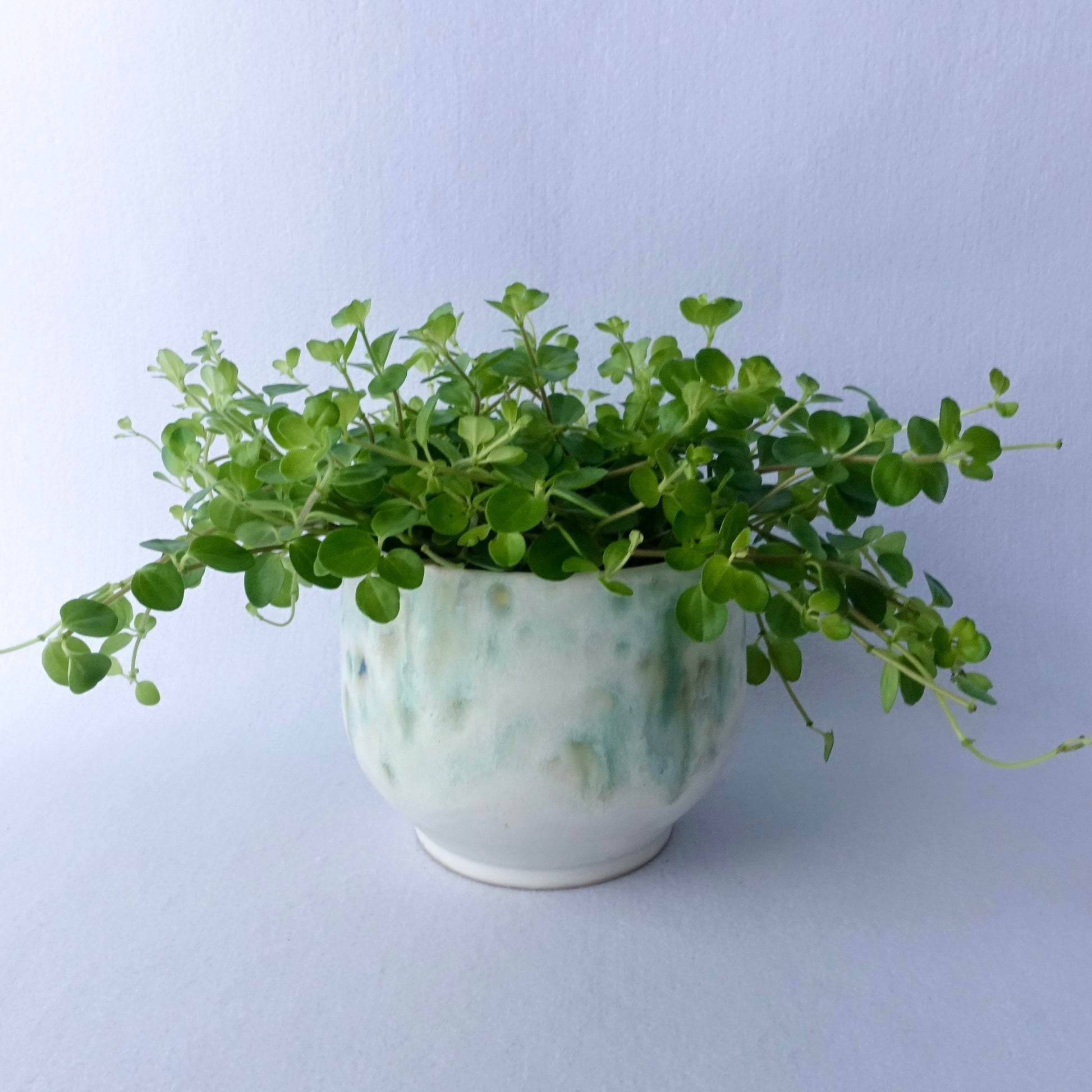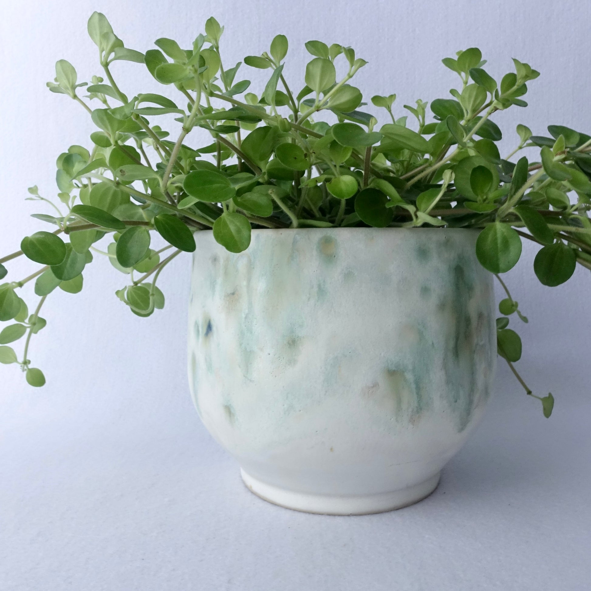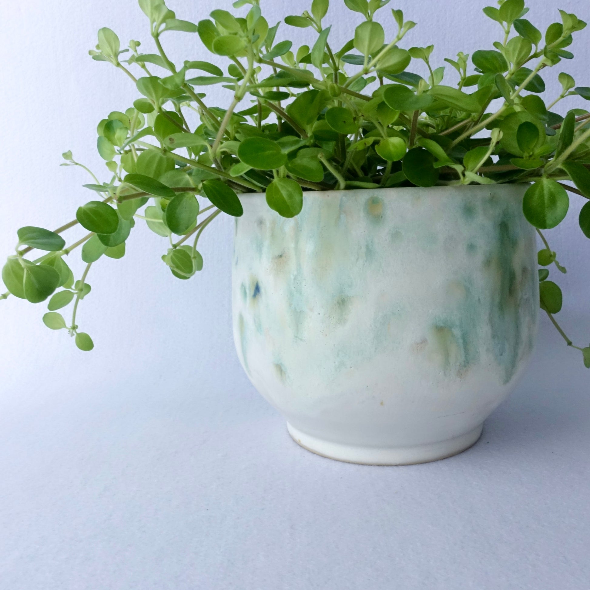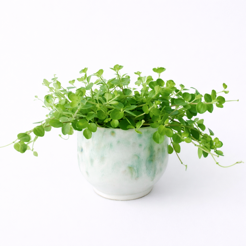 En myk og levende glasur i grønntoner gir denne håndlagde potten et naturlig og rolig uttrykk. Den organiske formen og den lyse bunnfargen lar plantene komme i fokus, samtidig som potten tilfører rommet et unikt preg. Passer like fint til grønne planter som til en bukett blomster.
