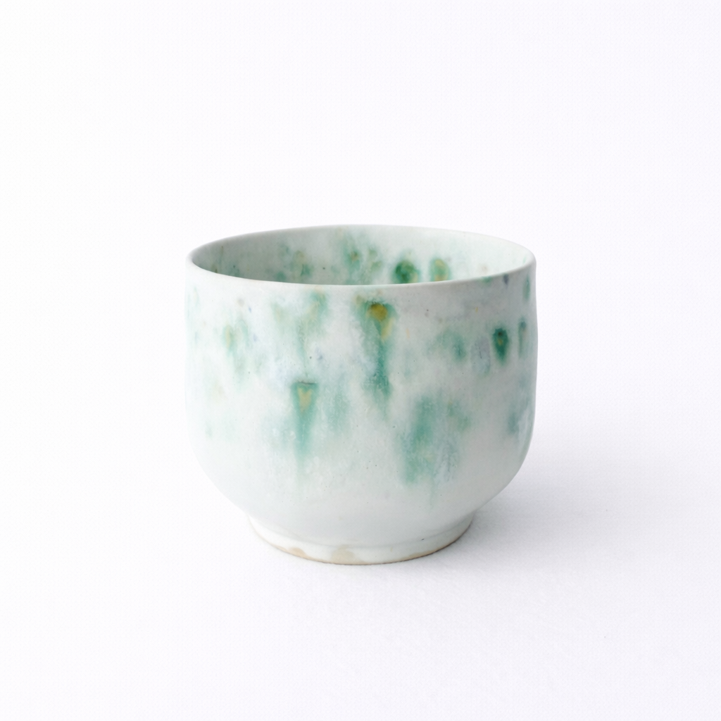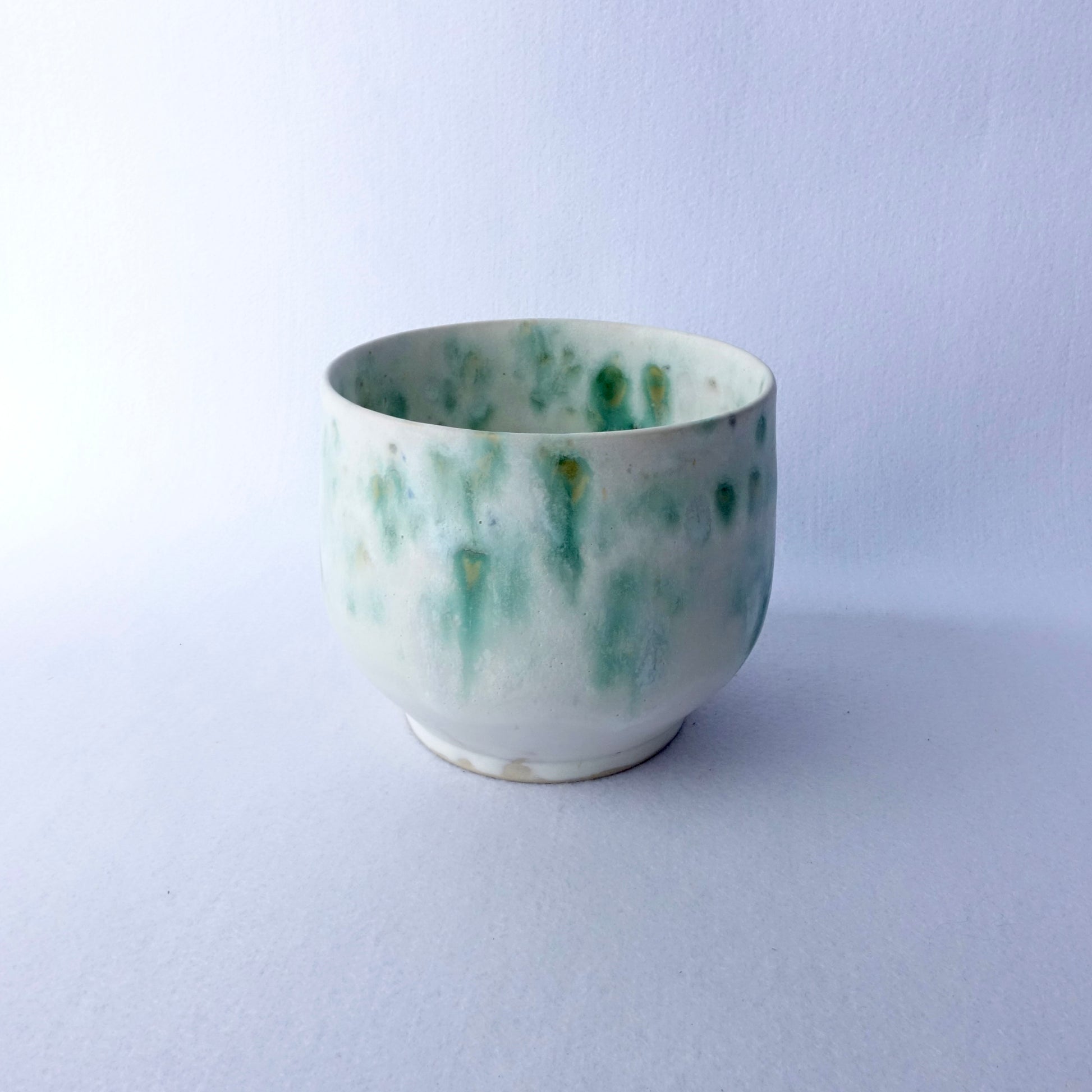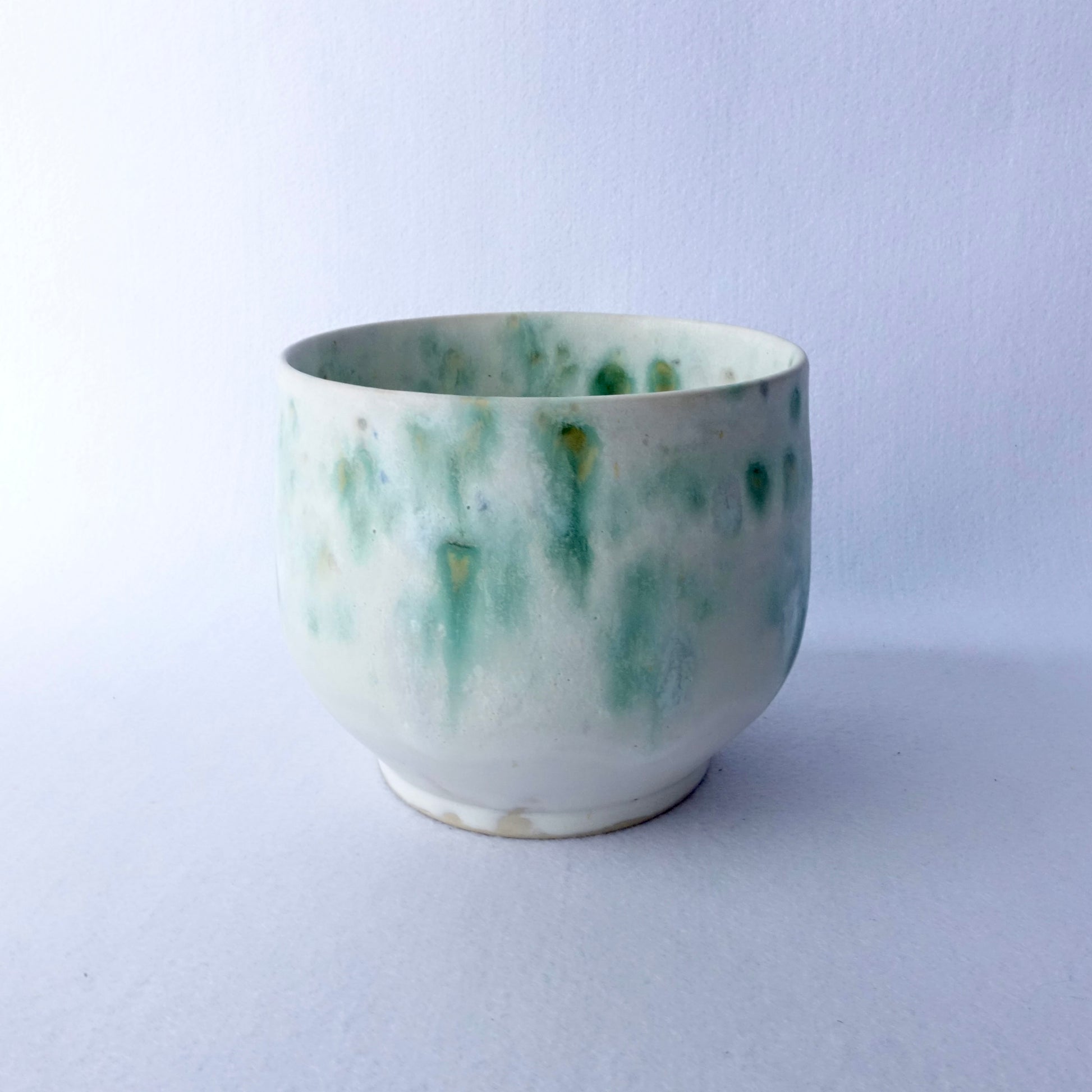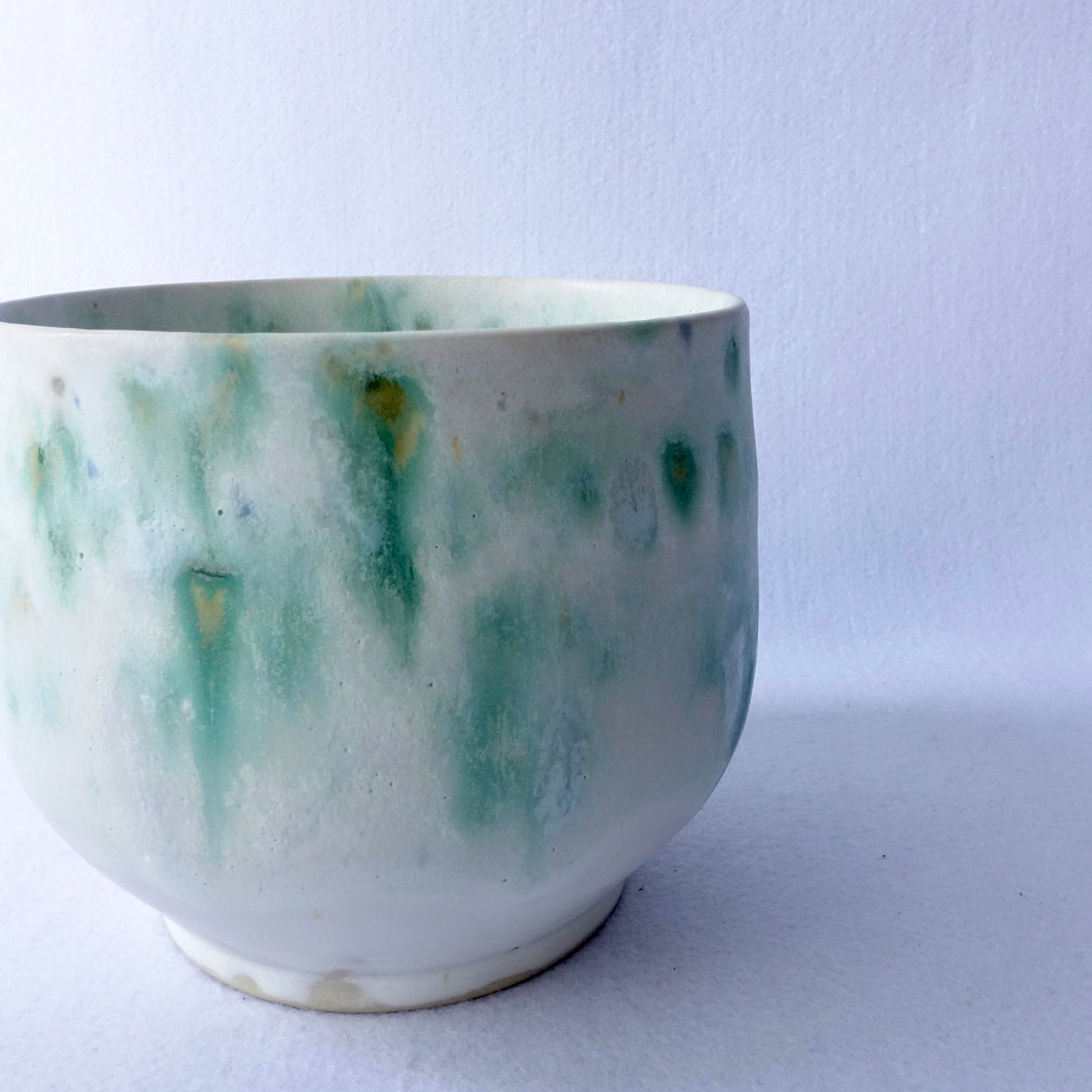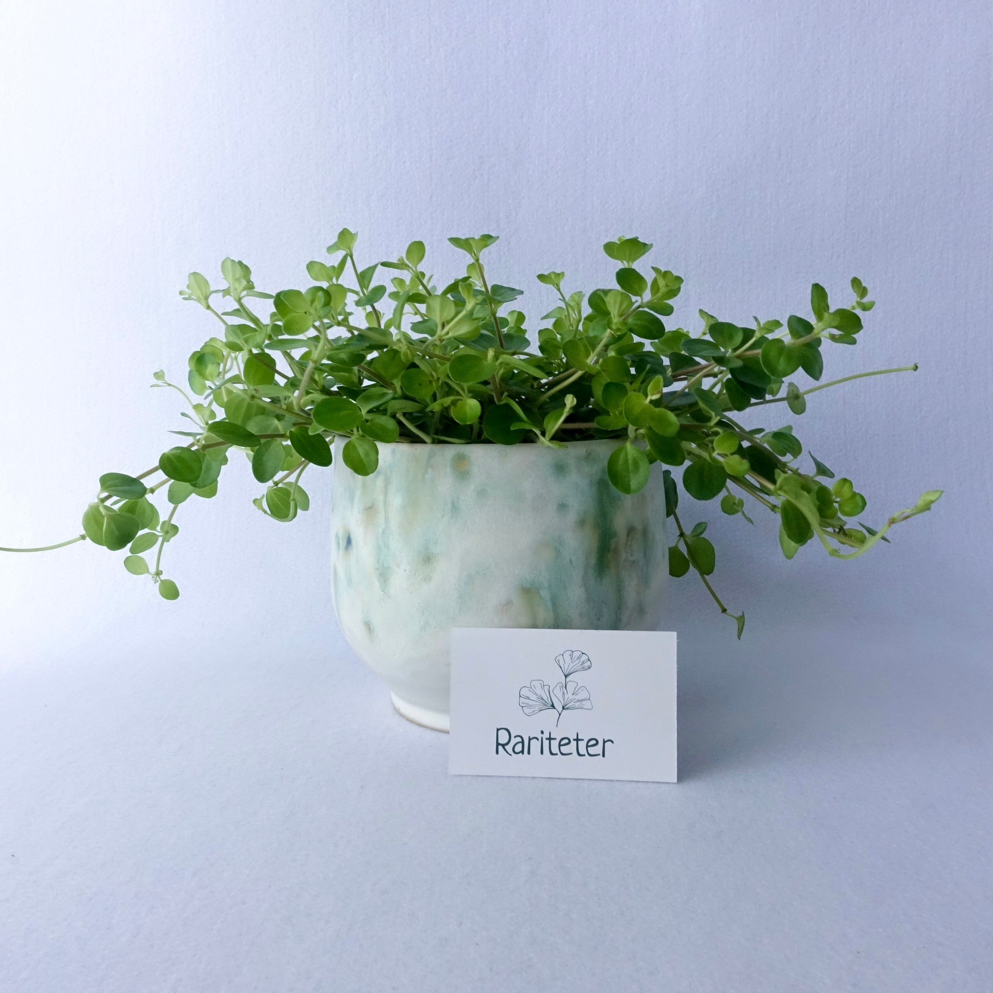 En myk og levende glasur i grønntoner gir denne håndlagde potten et naturlig og rolig uttrykk. Den organiske formen og den lyse bunnfargen lar plantene komme i fokus, samtidig som potten tilfører rommet et unikt preg. Passer like fint til grønne planter som til en bukett blomster.