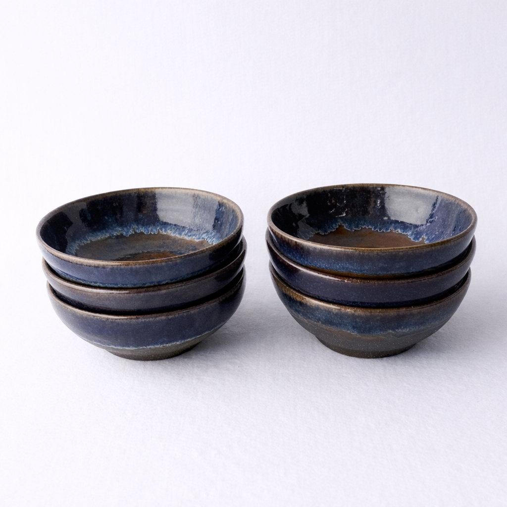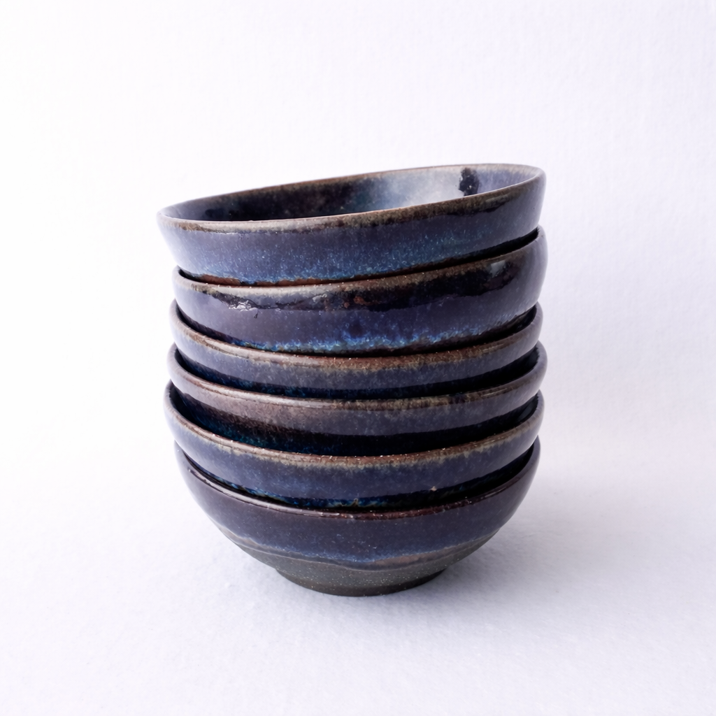 Disse håndlagde skålene kombinerer funksjon og poesi. Den mørke glasuren flyter som nattens himmel, med et spill av blåtoner som gir hver skål et unikt uttrykk. Perfekte til frokostblanding, yoghurt eller en liten suppe – like vakre på frokostbordet som til kveldsservering.