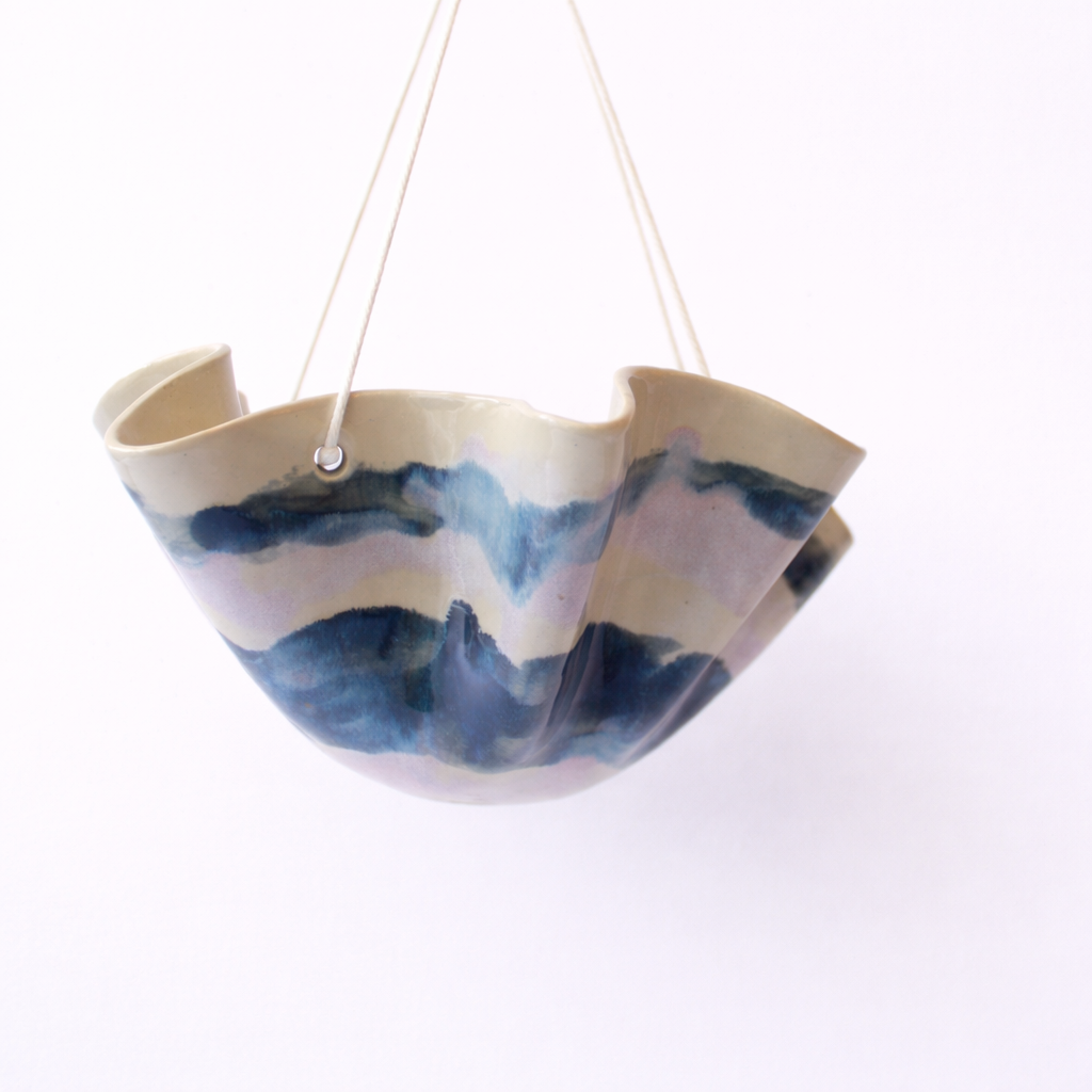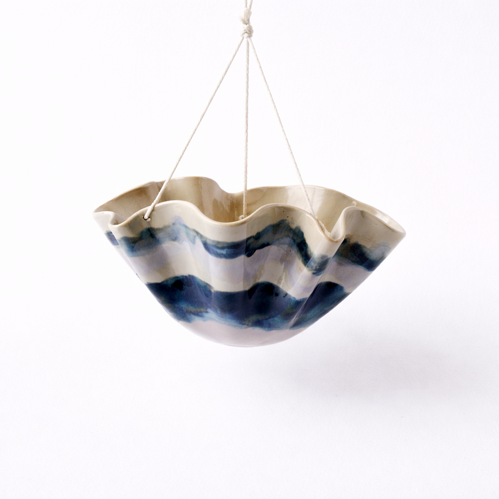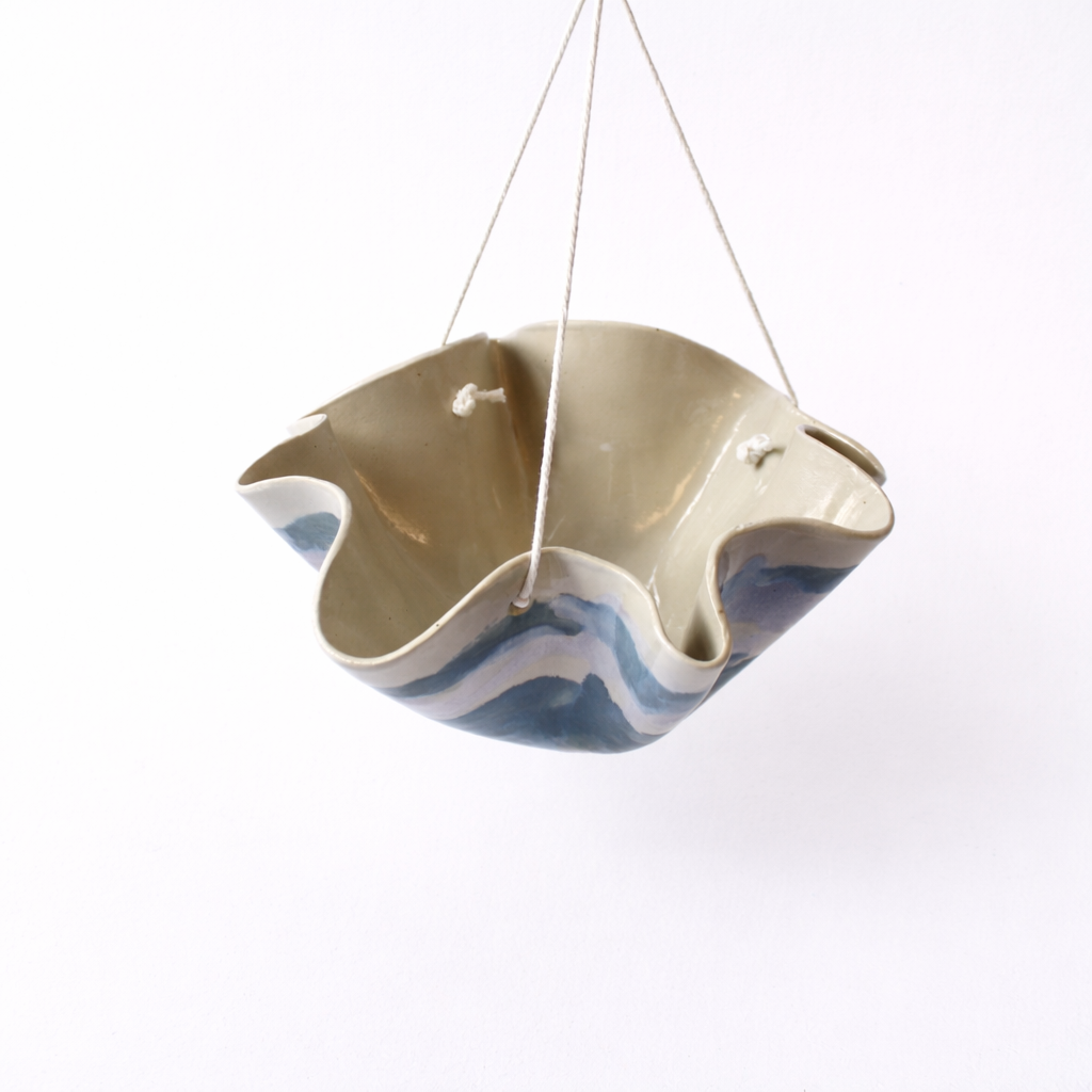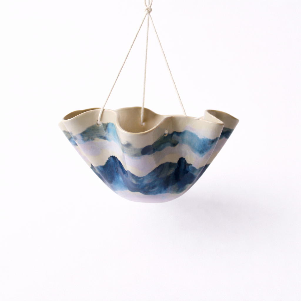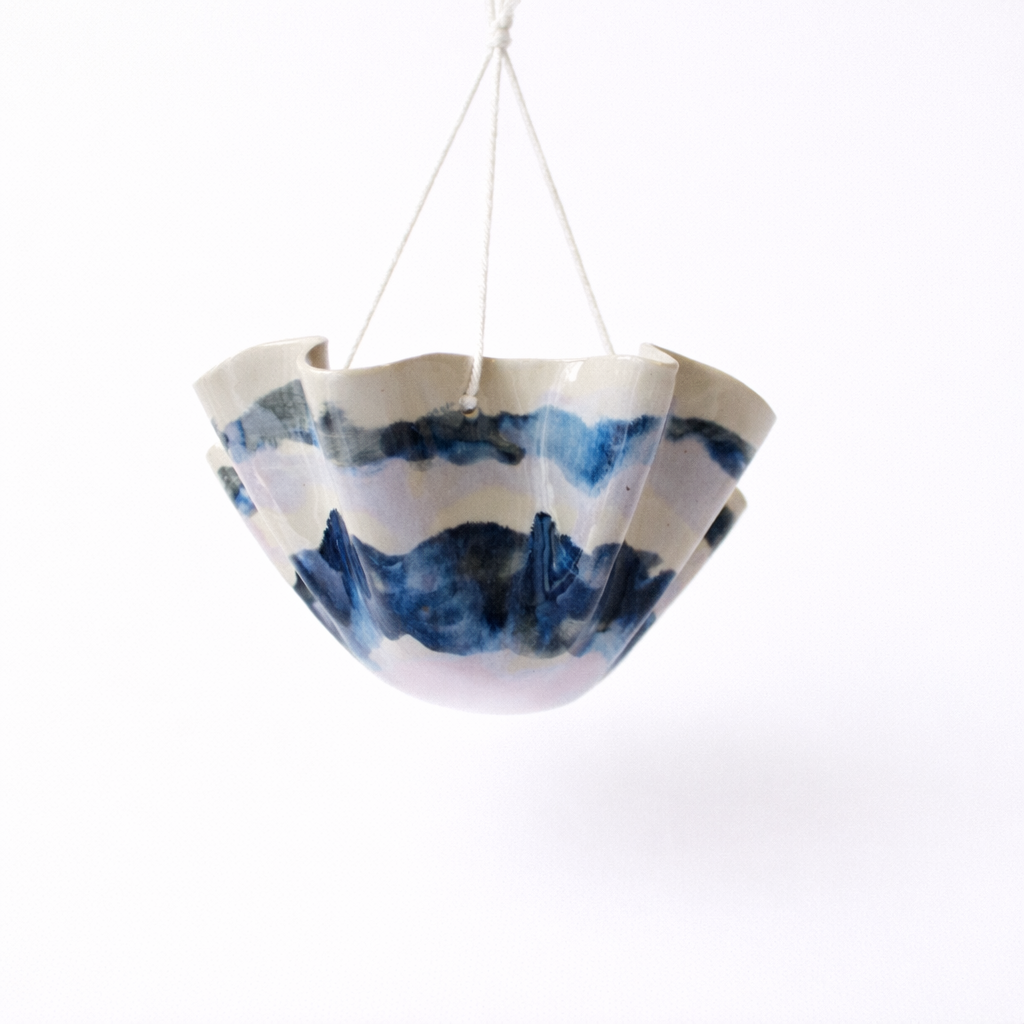 Håndlaget hengende keramikkpotte med myke, organiske former og blå, hvit, lilla glasurtoner. Et unikt blikkfang som løfter rommet og gir plantene dine en vakker, skulpturell ramme.