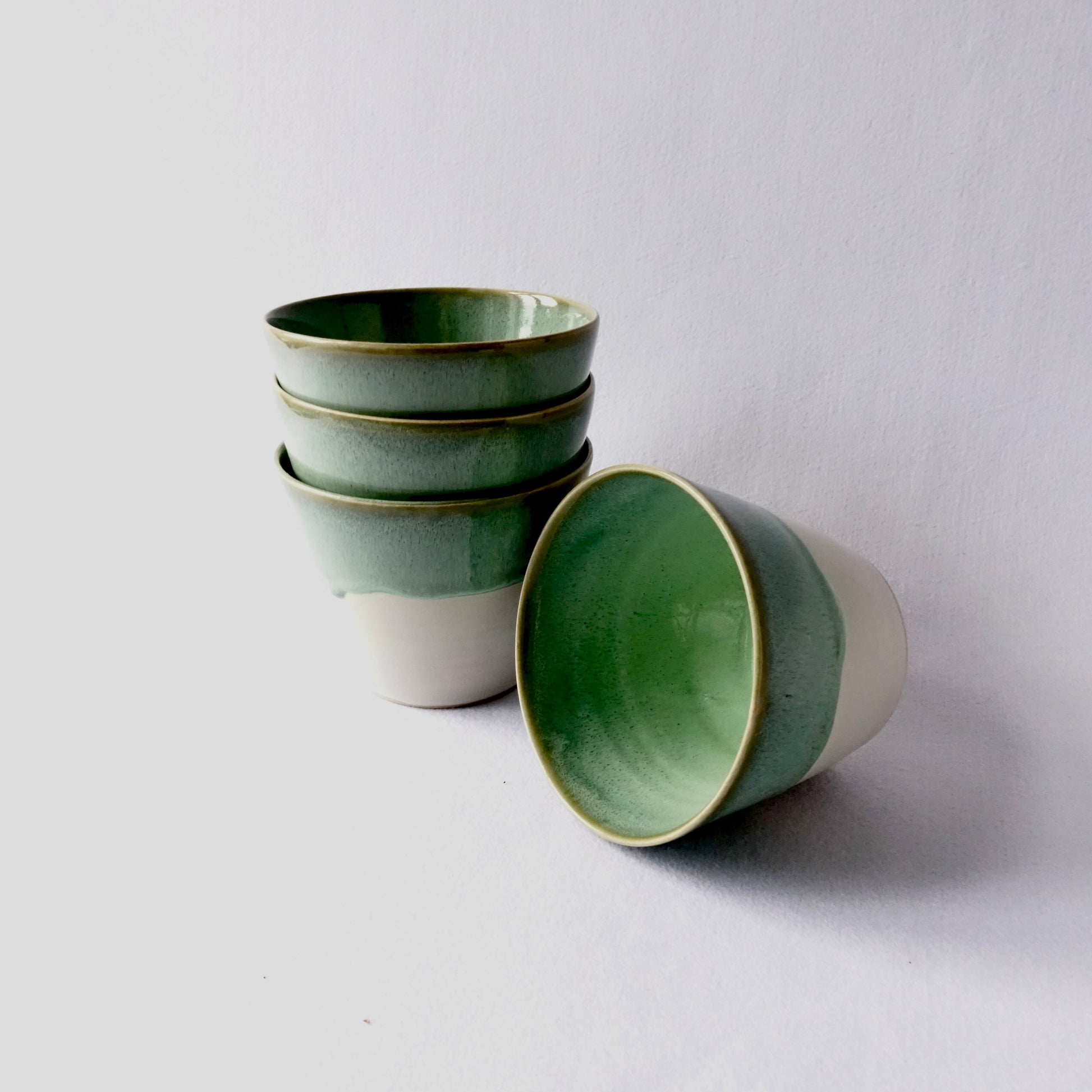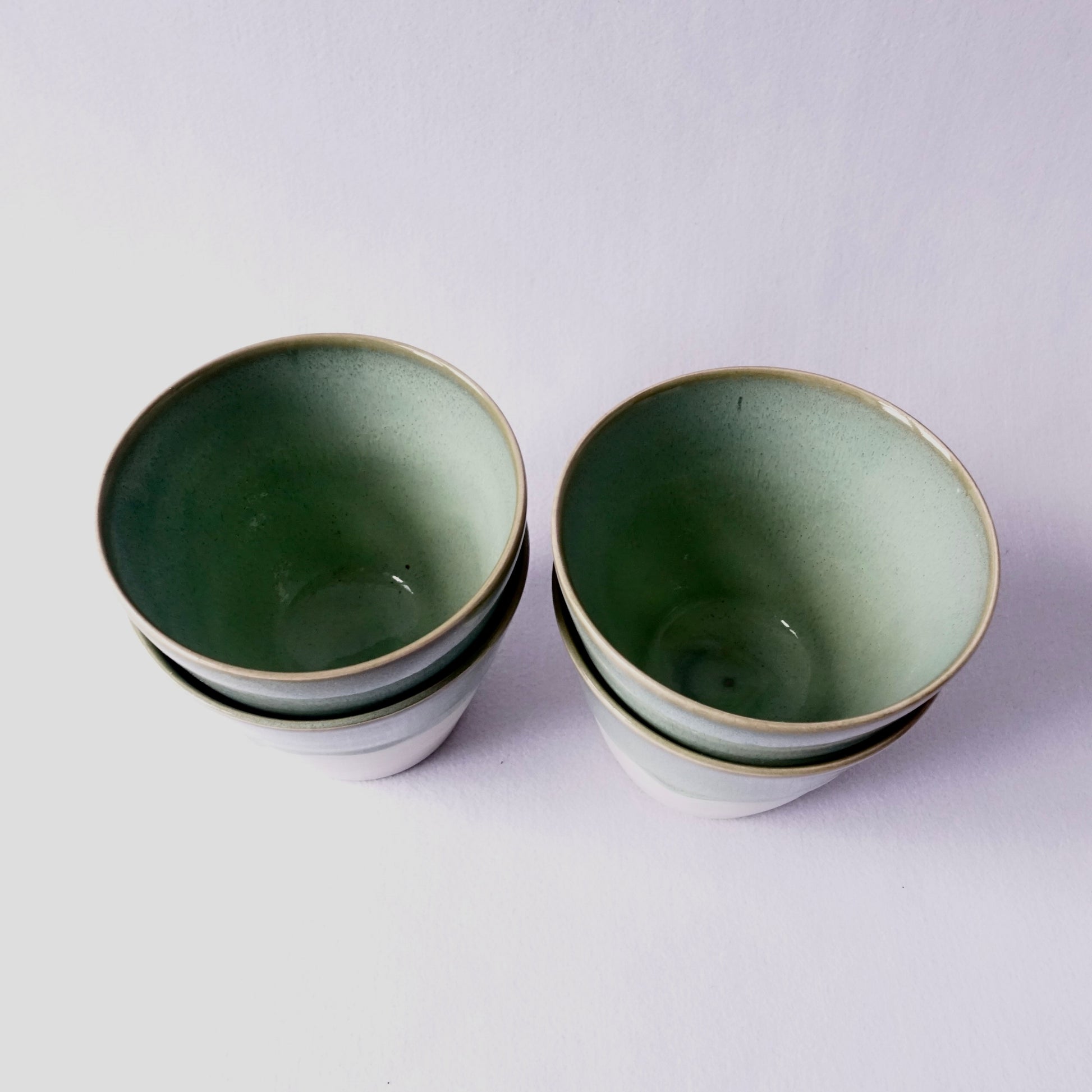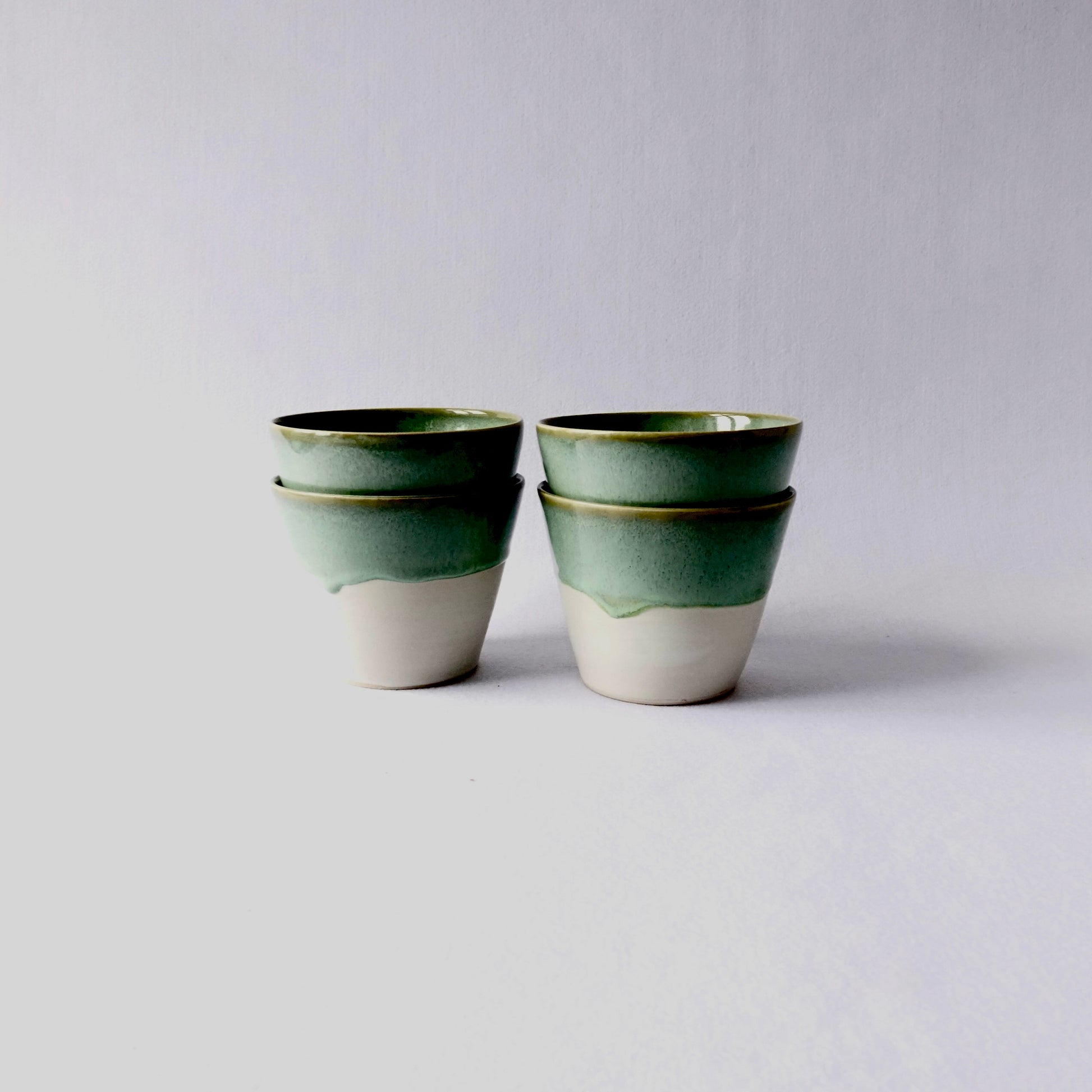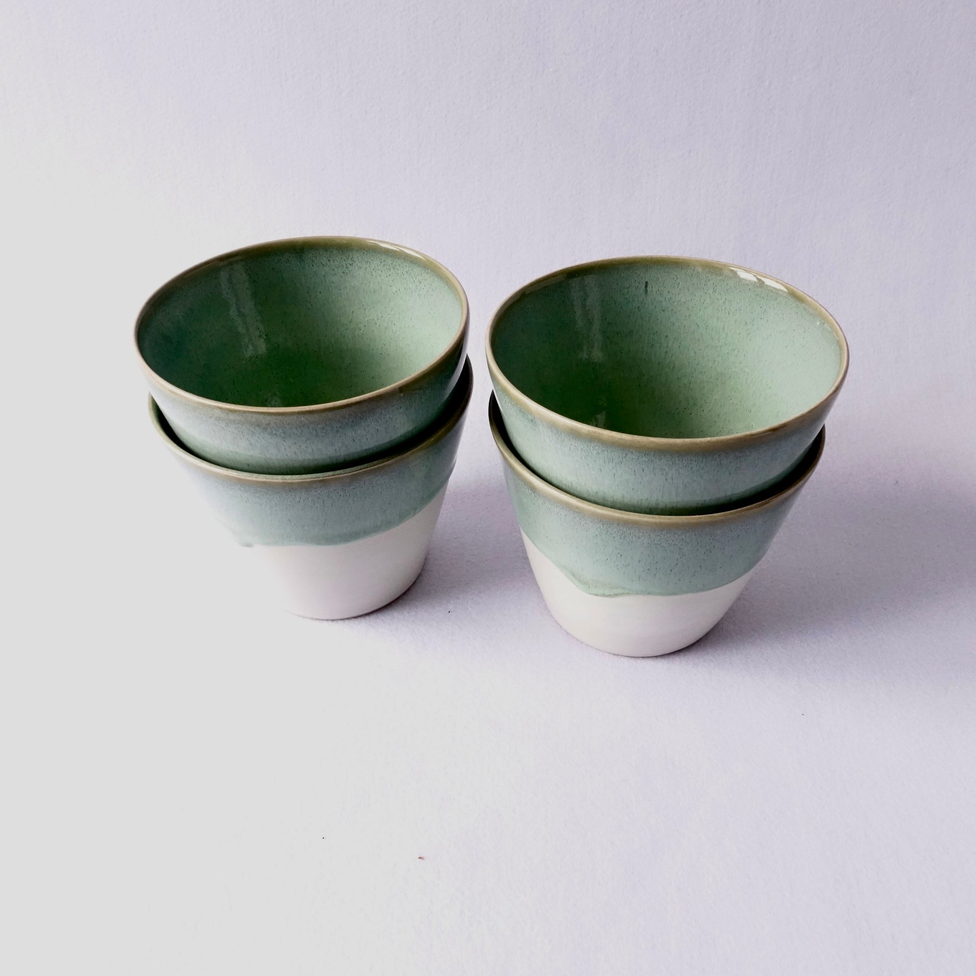 Håndlagde keramiske kopper med myk grønn glasur og lys, uglasert bunn som gir et rolig og balansert uttrykk. Enkle og tidløse i formen, perfekte til kaffe, te eller små serveringer.