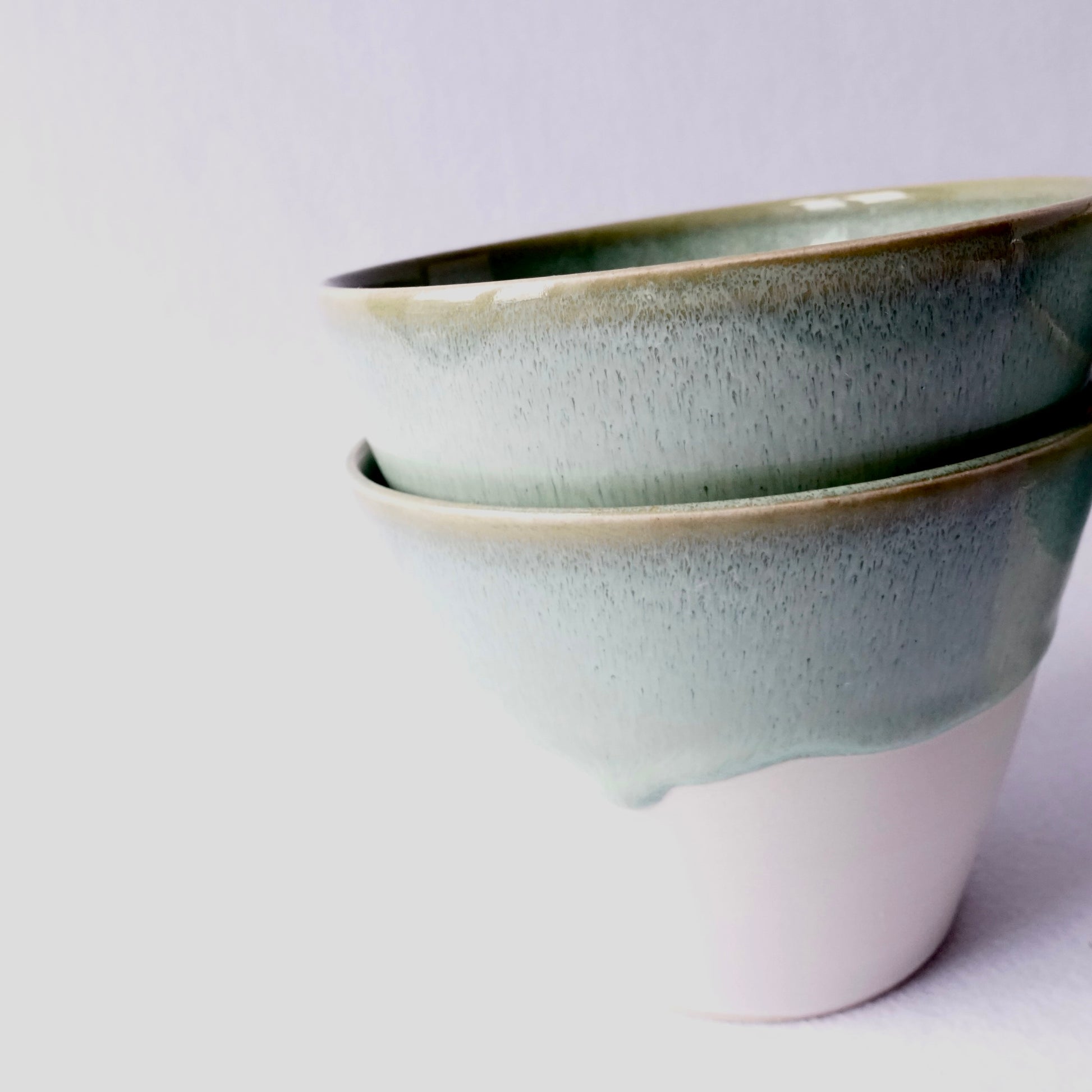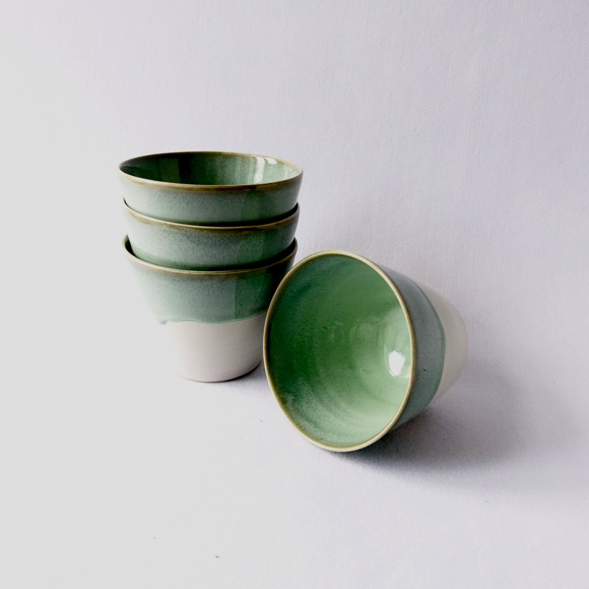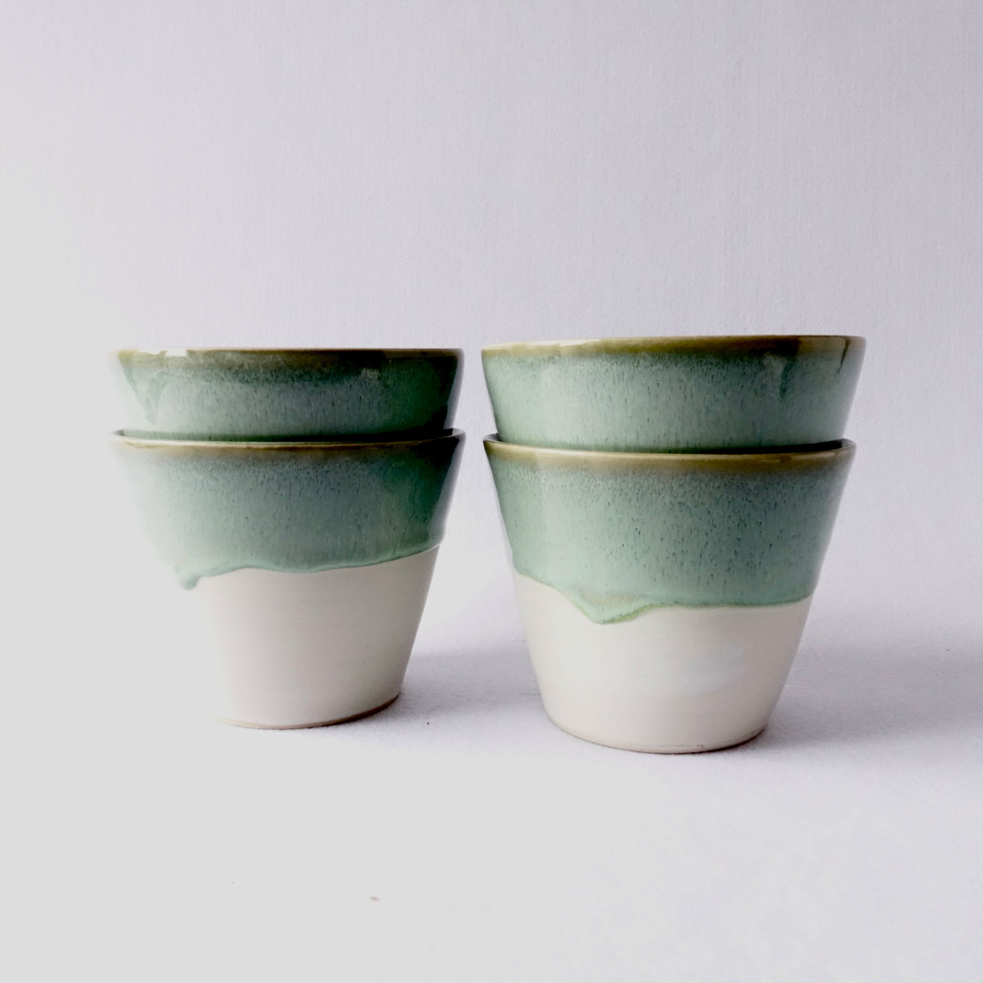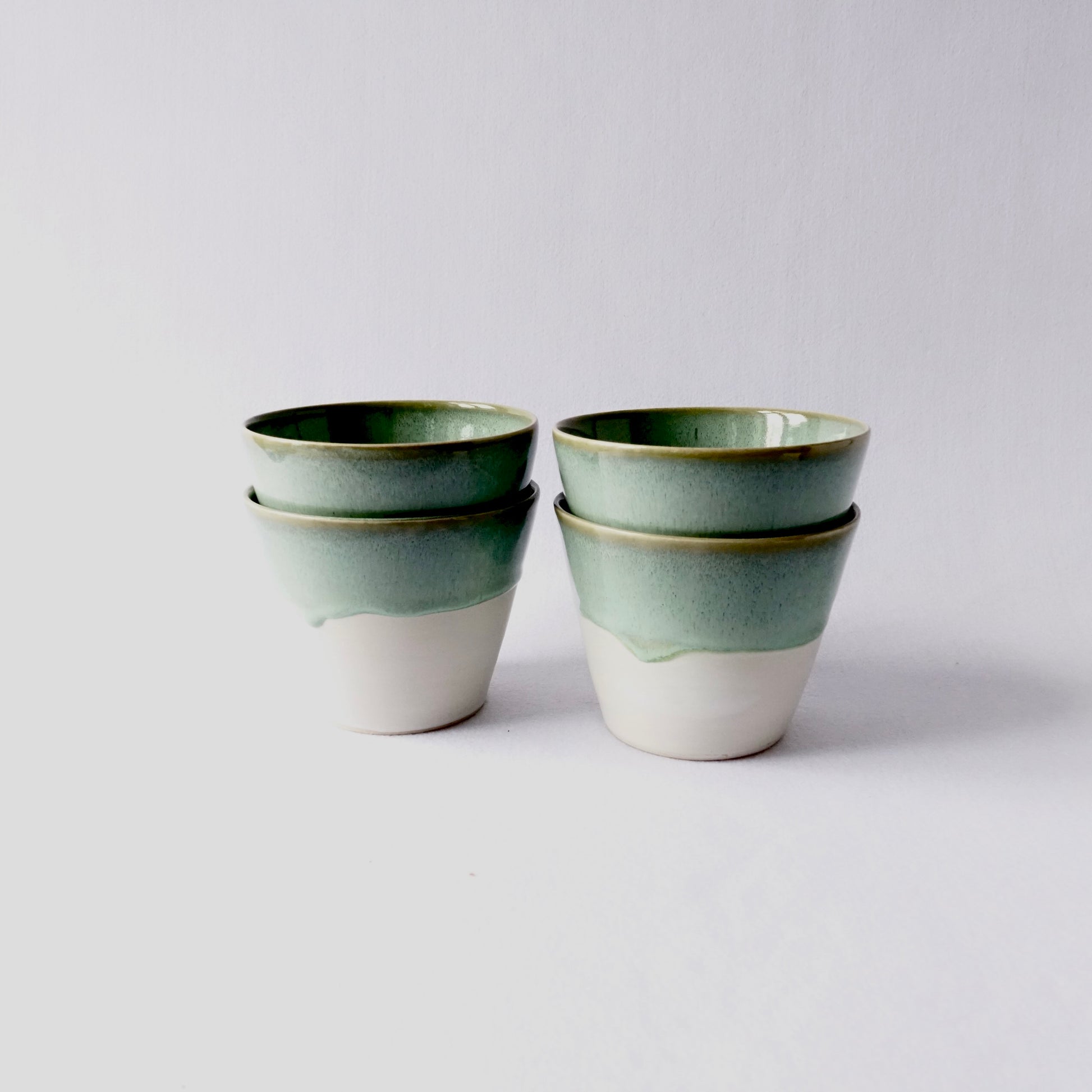 Håndlagde keramiske kopper med myk grønn glasur og lys, uglasert bunn som gir et rolig og balansert uttrykk. Enkle og tidløse i formen, perfekte til kaffe, te eller små serveringer.