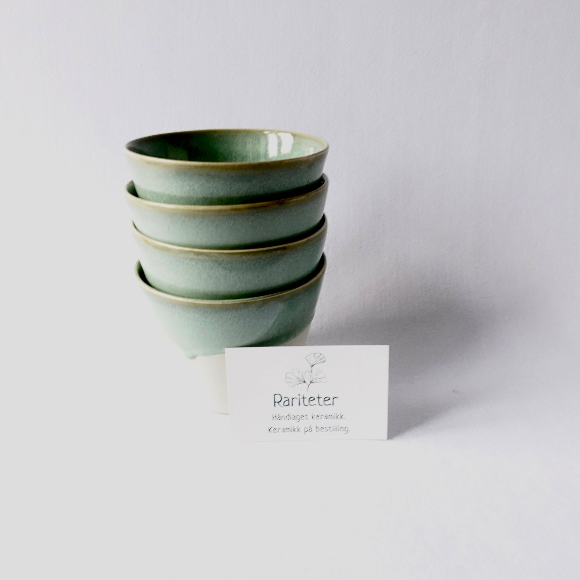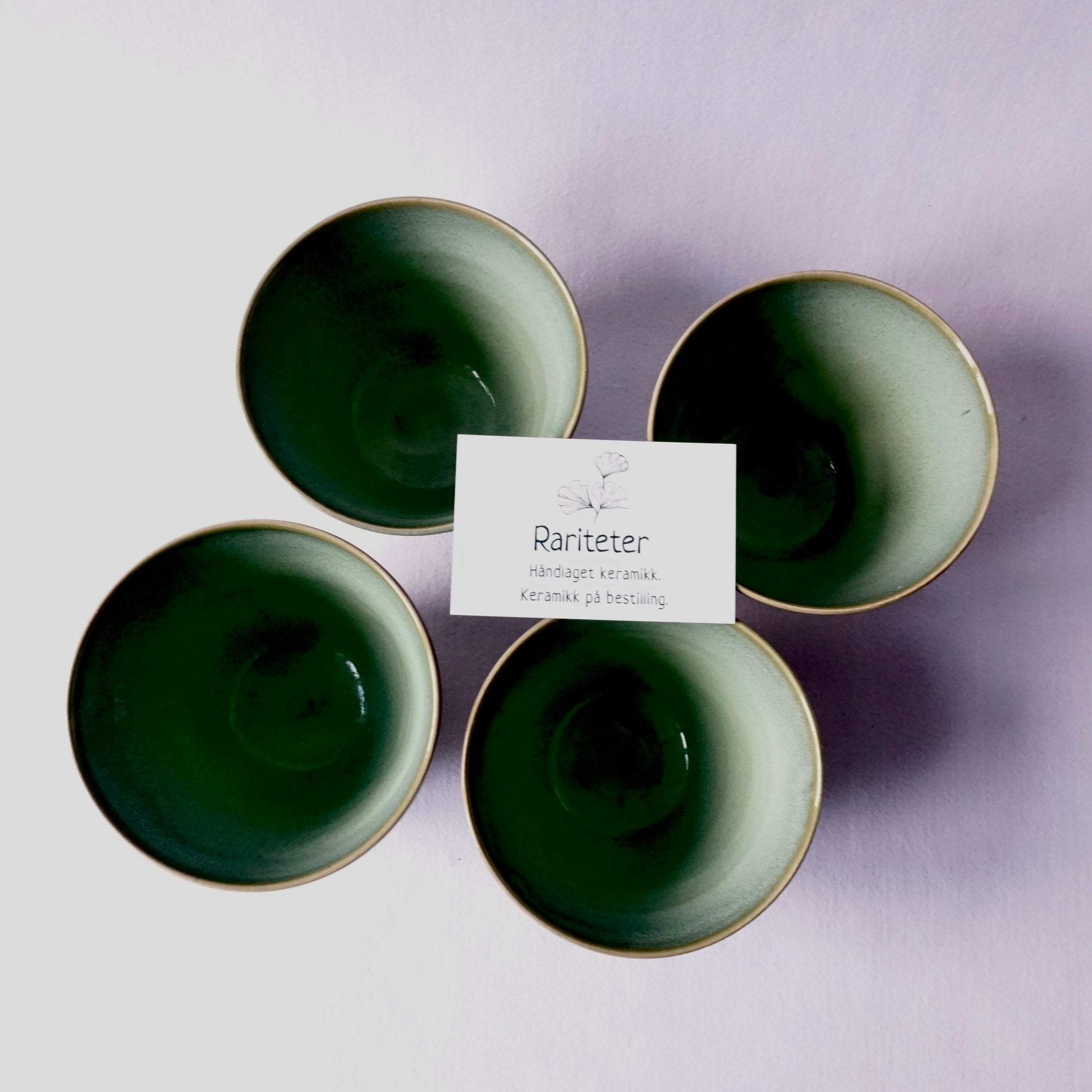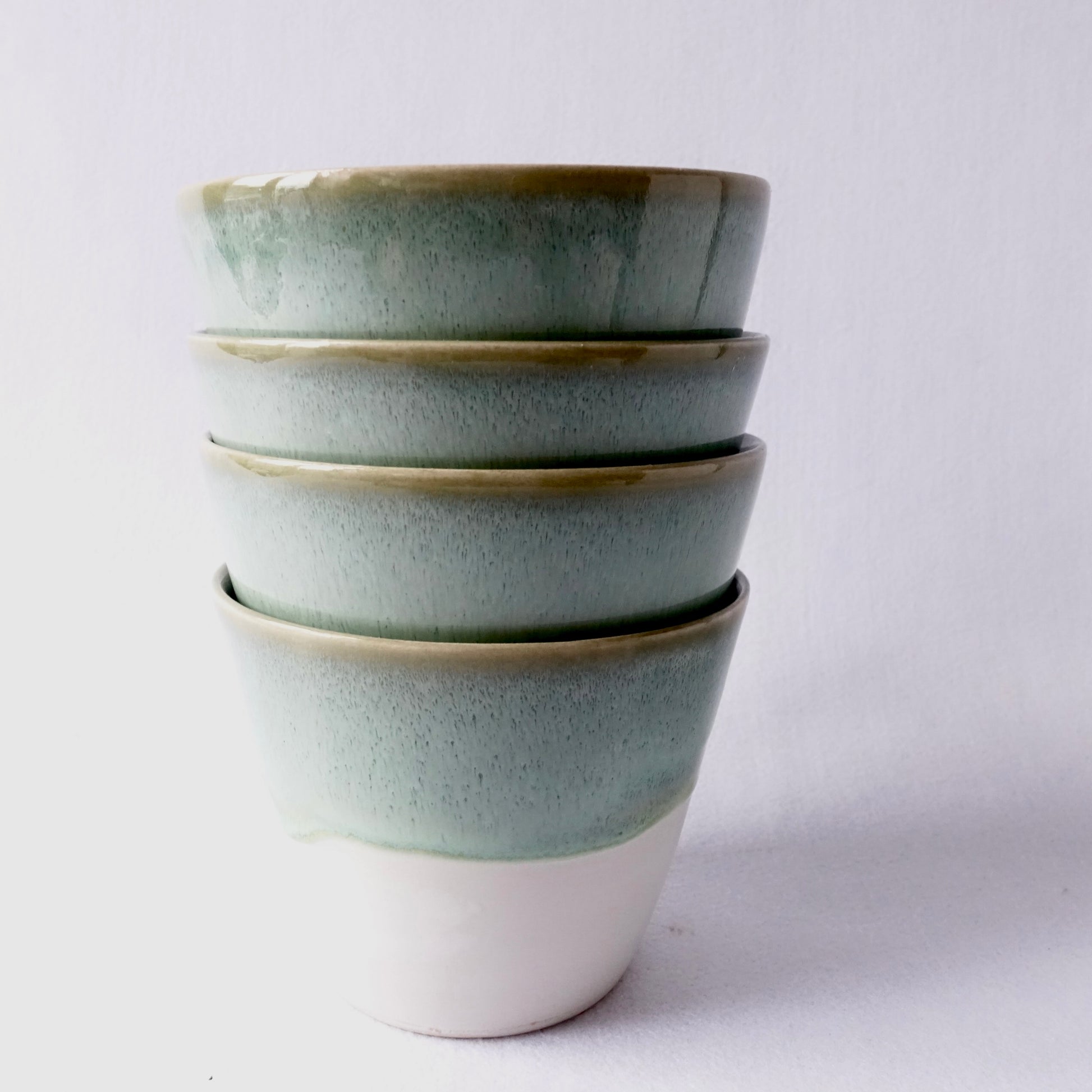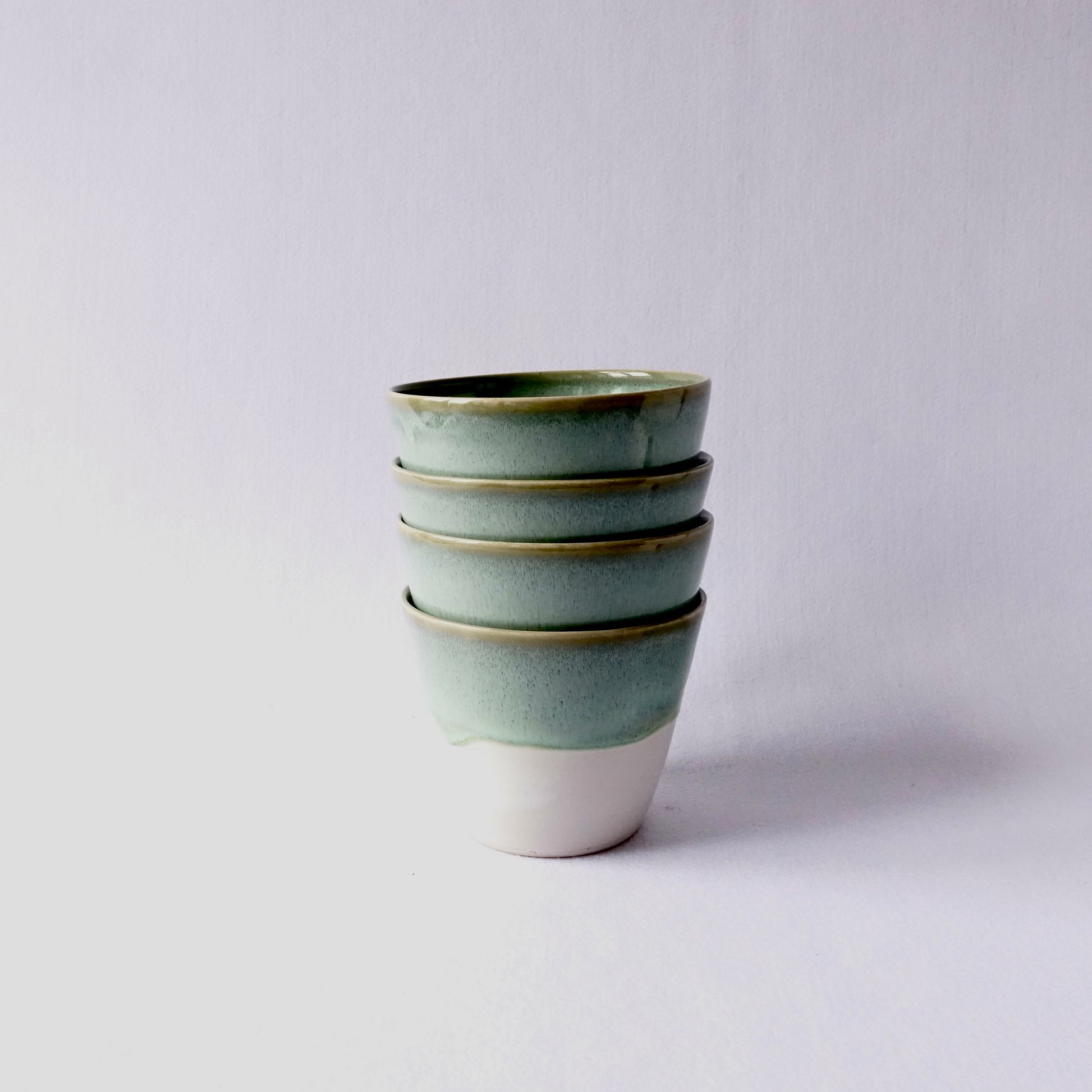 Håndlagde keramiske kopper med myk grønn glasur og lys, uglasert bunn som gir et rolig og balansert uttrykk. Enkle og tidløse i formen, perfekte til kaffe, te eller små serveringer.