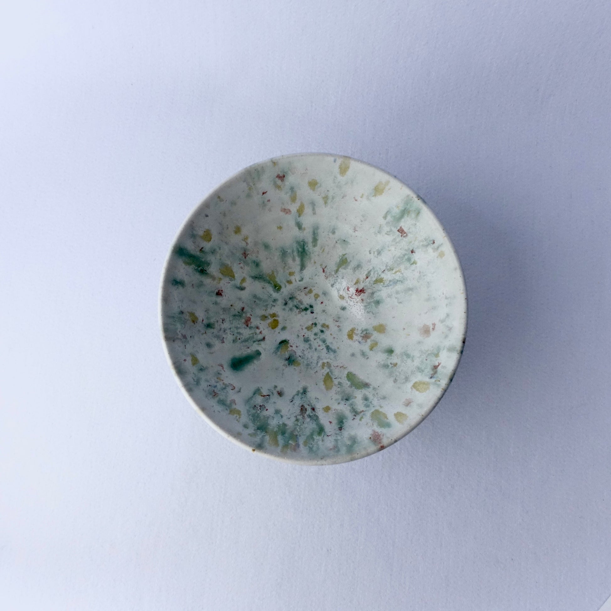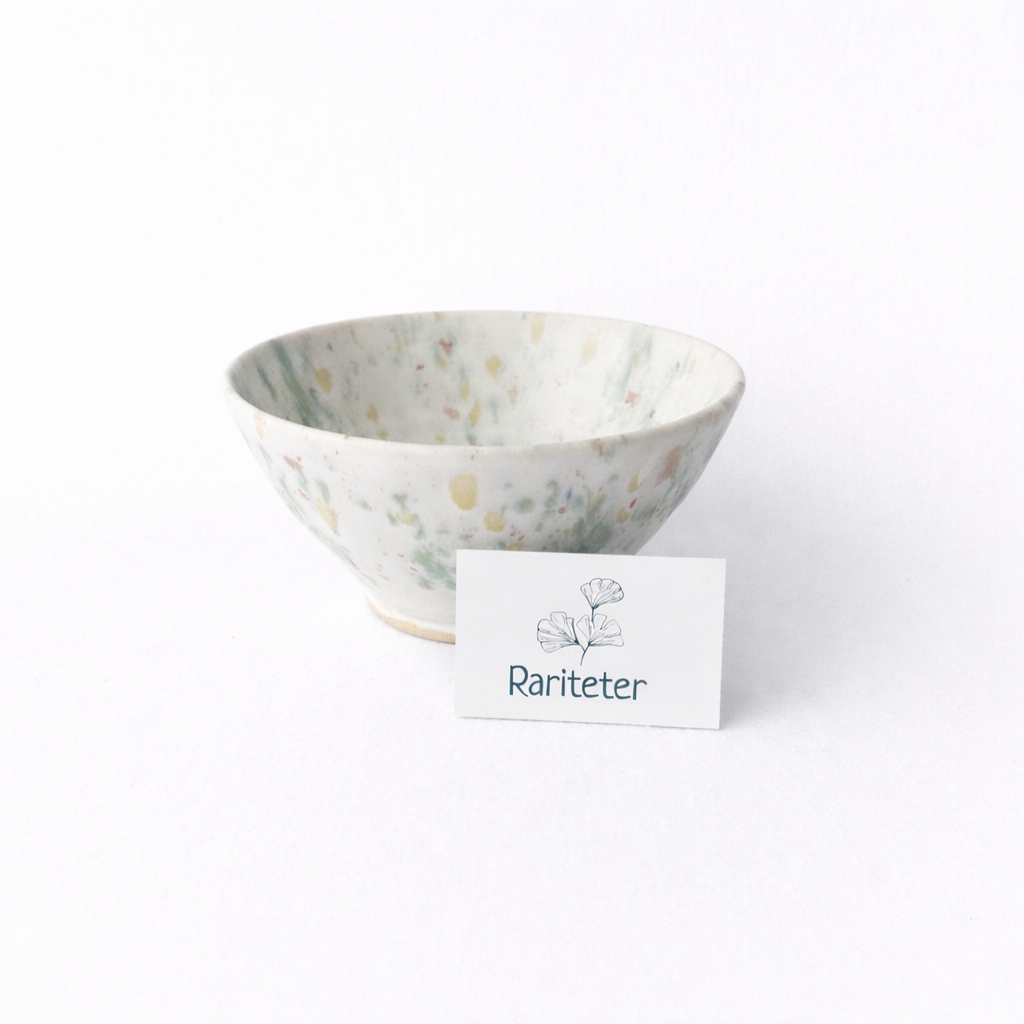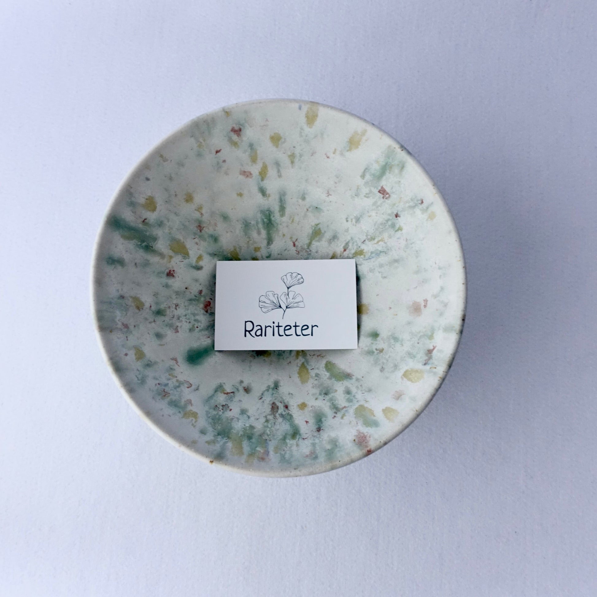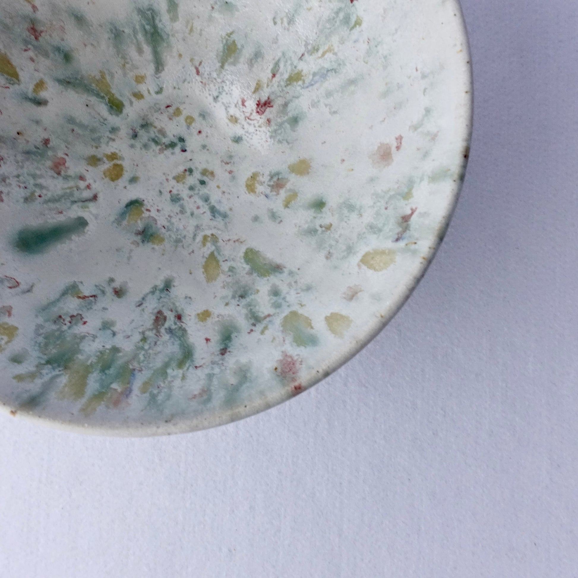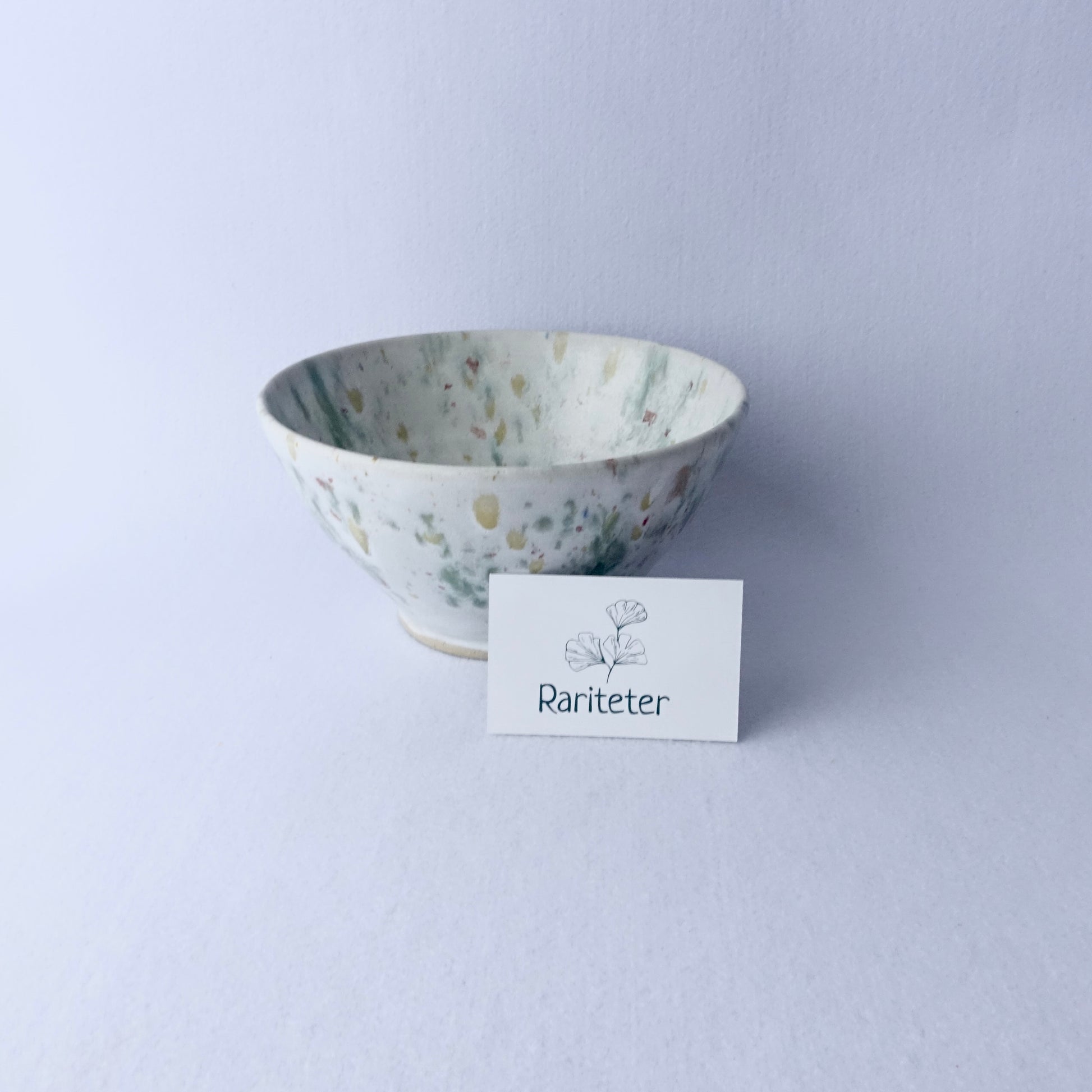 En hånddreid bolle med et lyst, levende uttrykk. Den matte glasuren er dekorert med myke drypp i grønne, gule og rosa toner – som små spor av vår i keramikken. Perfekt til friske salater, frukt eller som et dekorativt innslag på bordet.