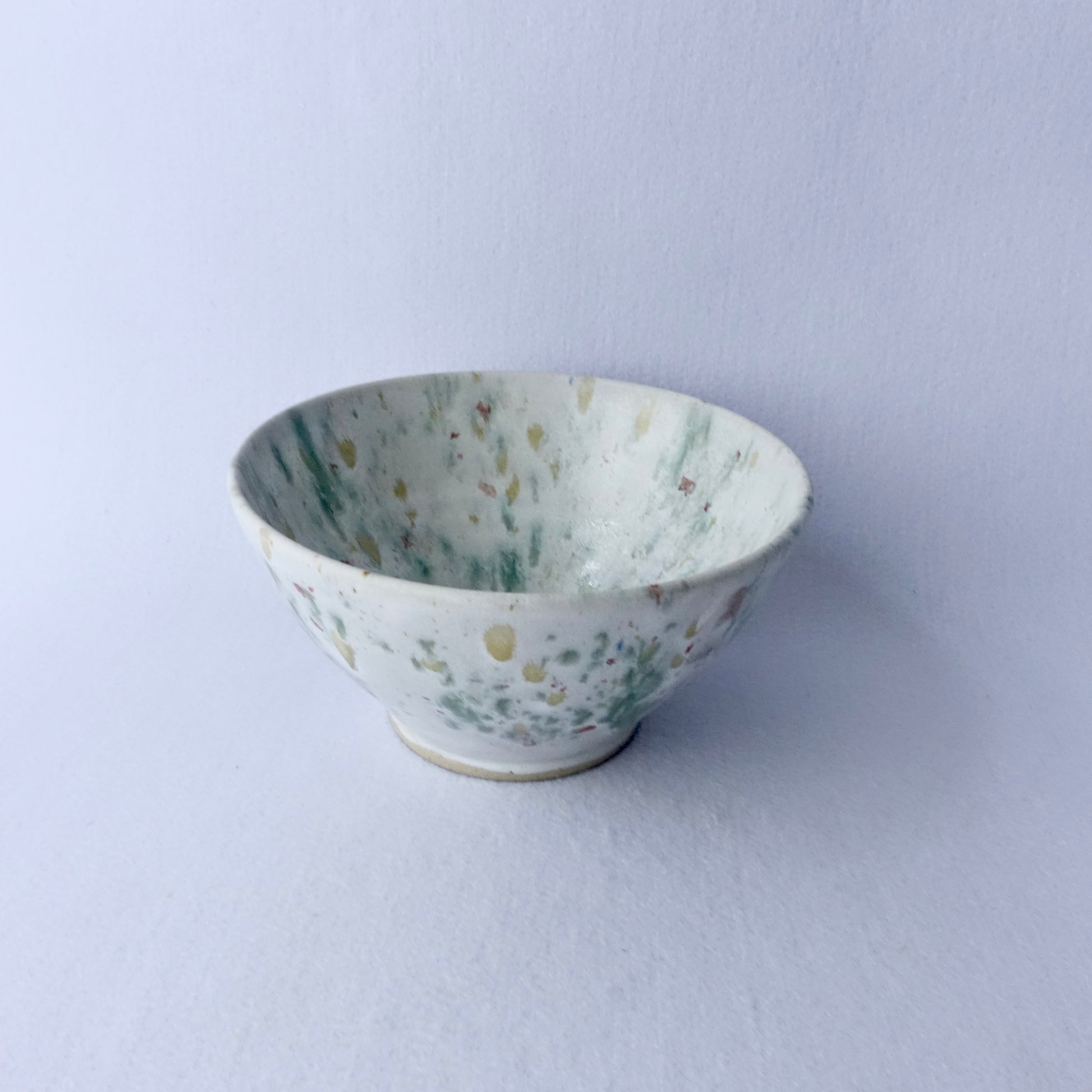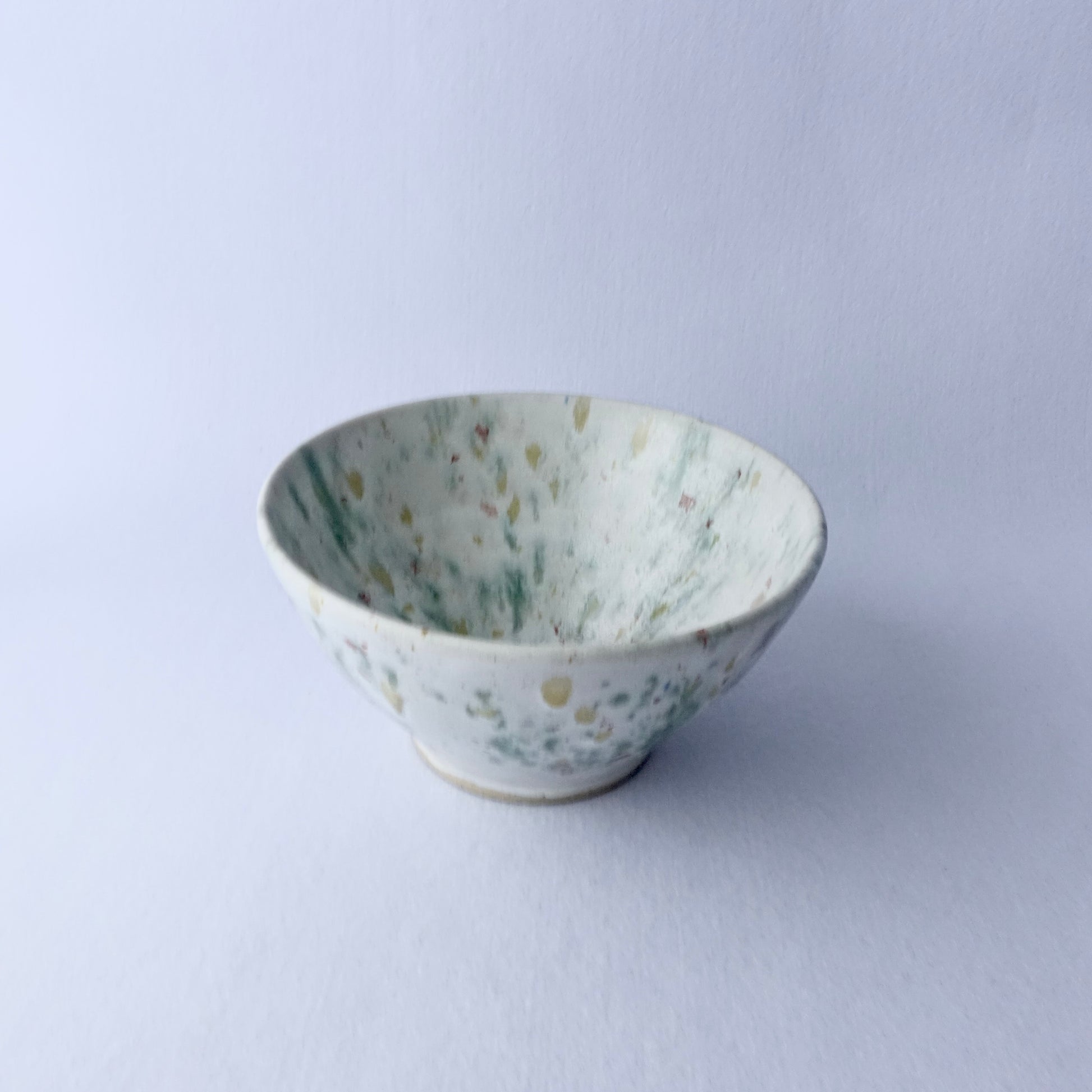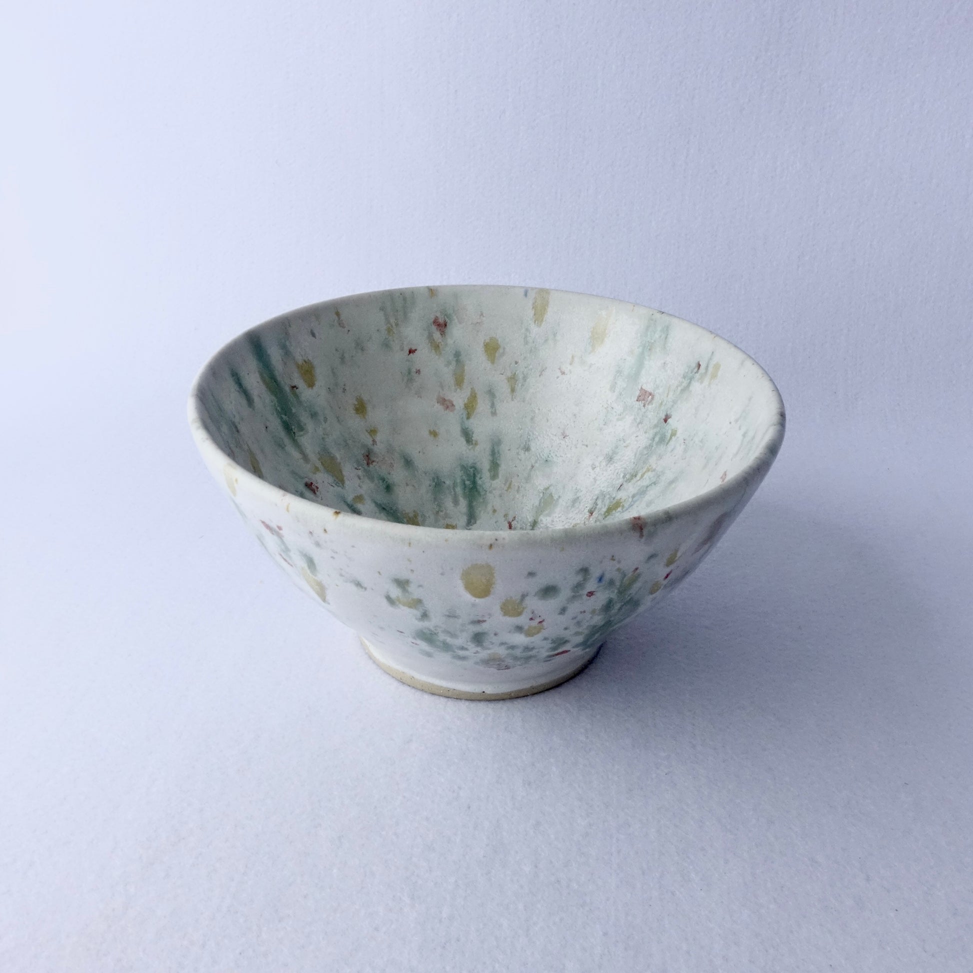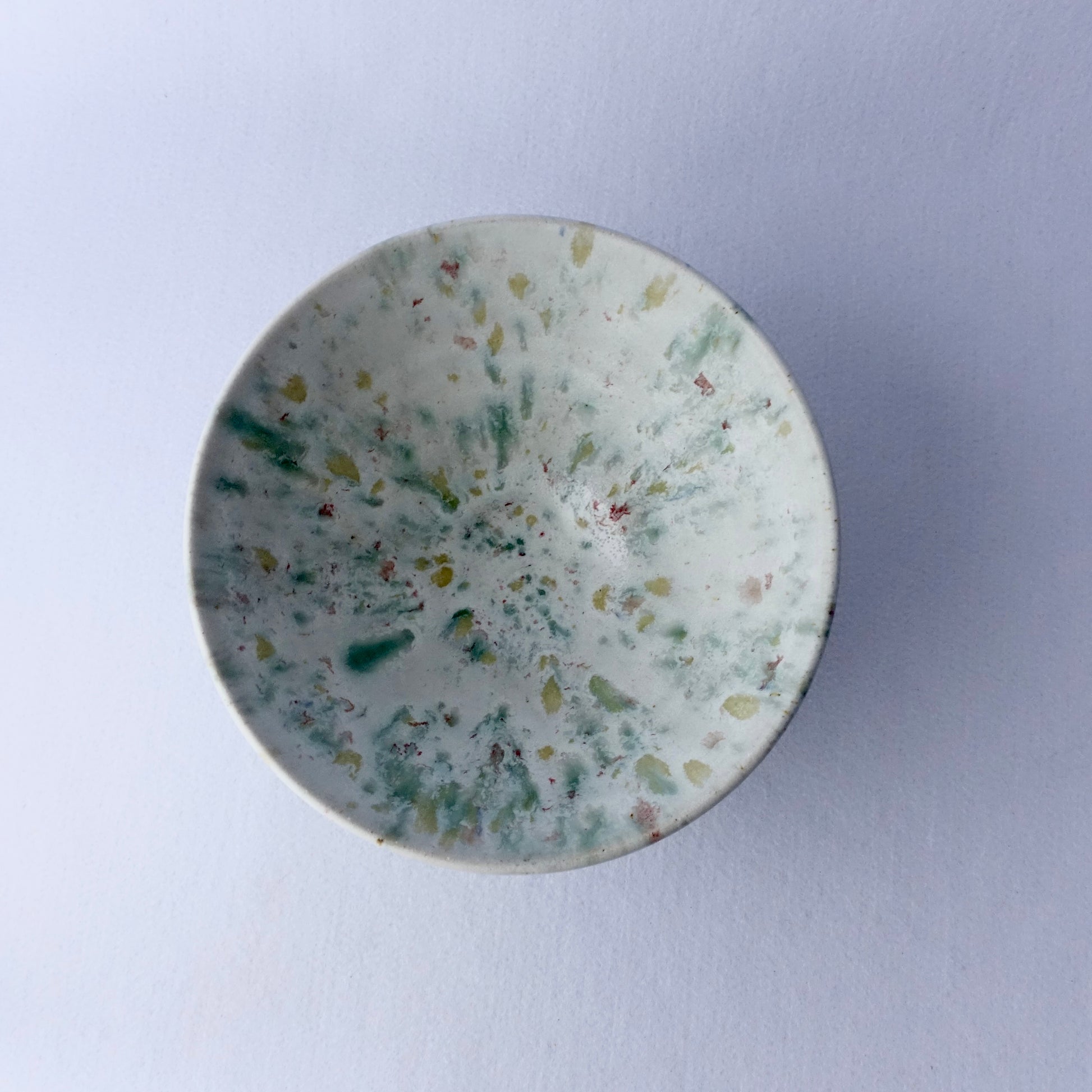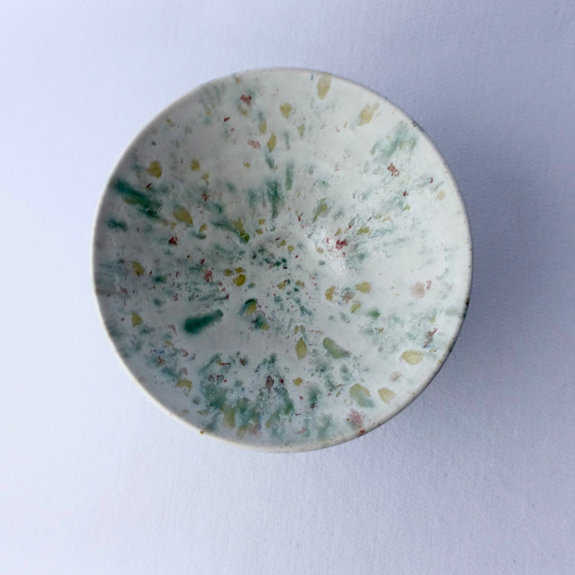 En hånddreid bolle med et lyst, levende uttrykk. Den matte glasuren er dekorert med myke drypp i grønne, gule og rosa toner – som små spor av vår i keramikken. Perfekt til friske salater, frukt eller som et dekorativt innslag på bordet.