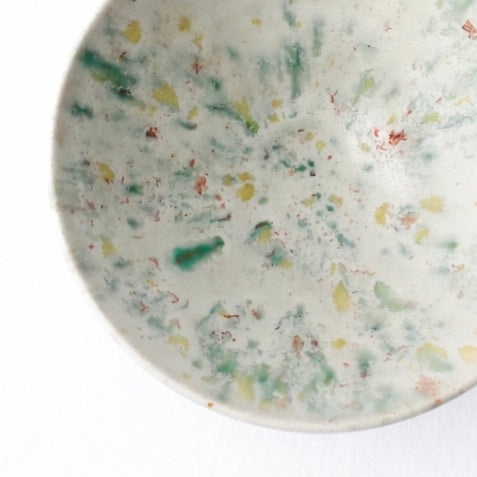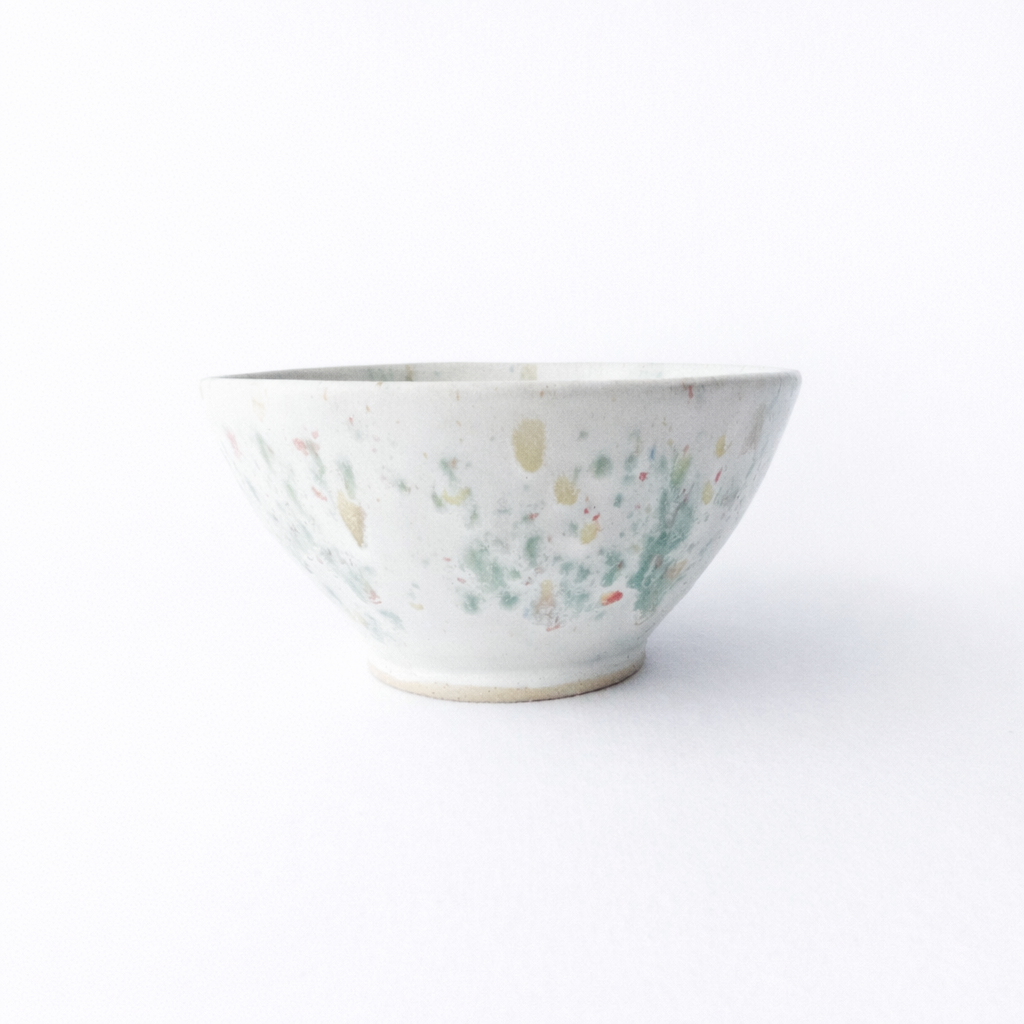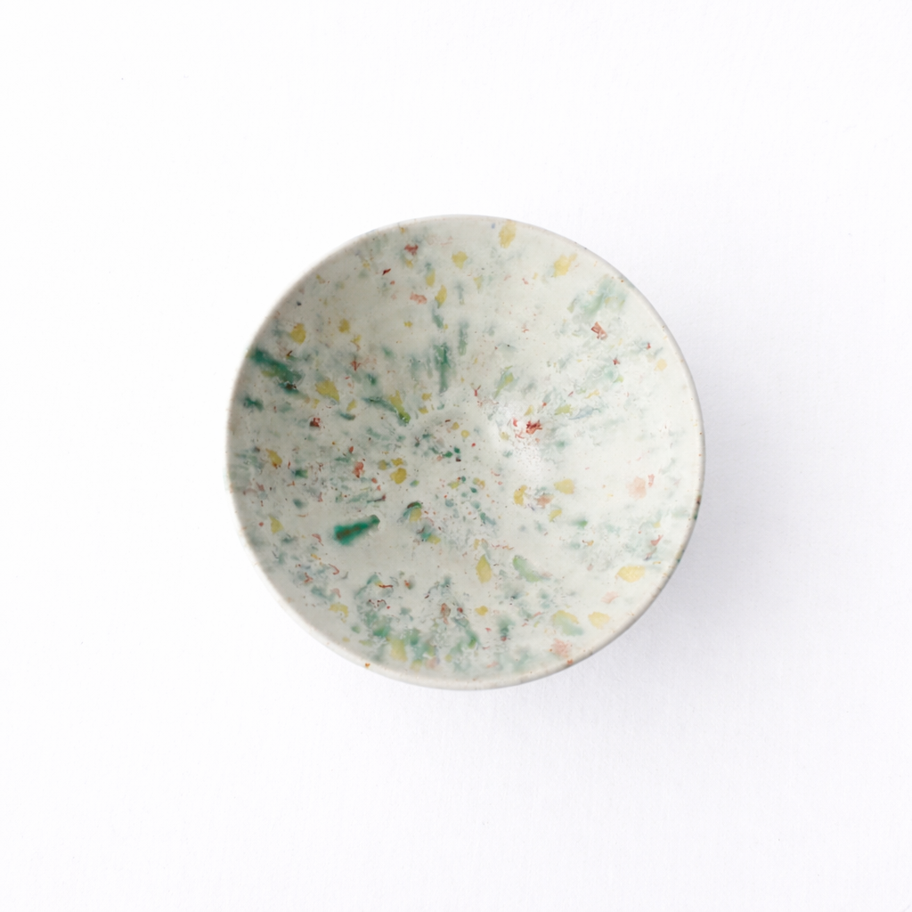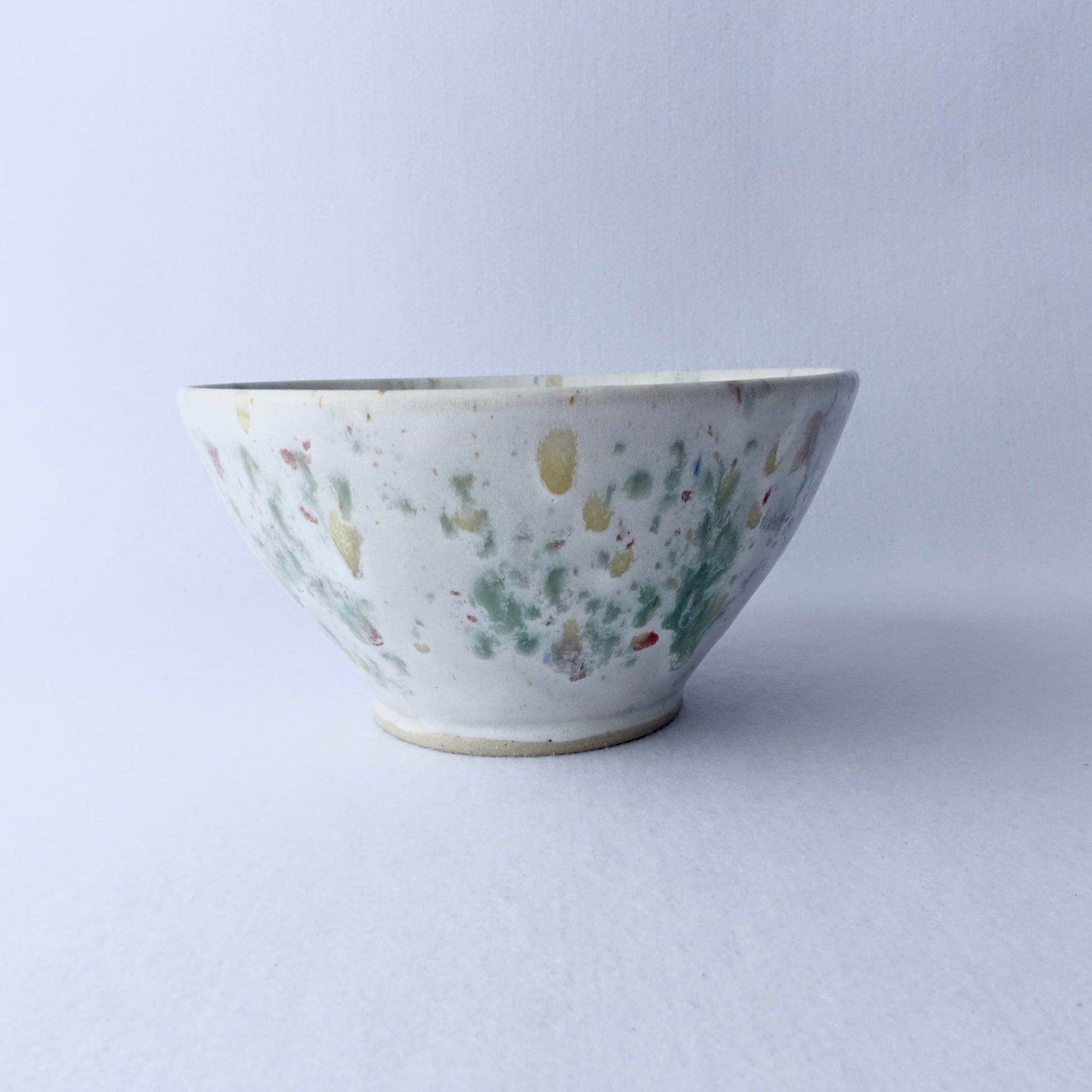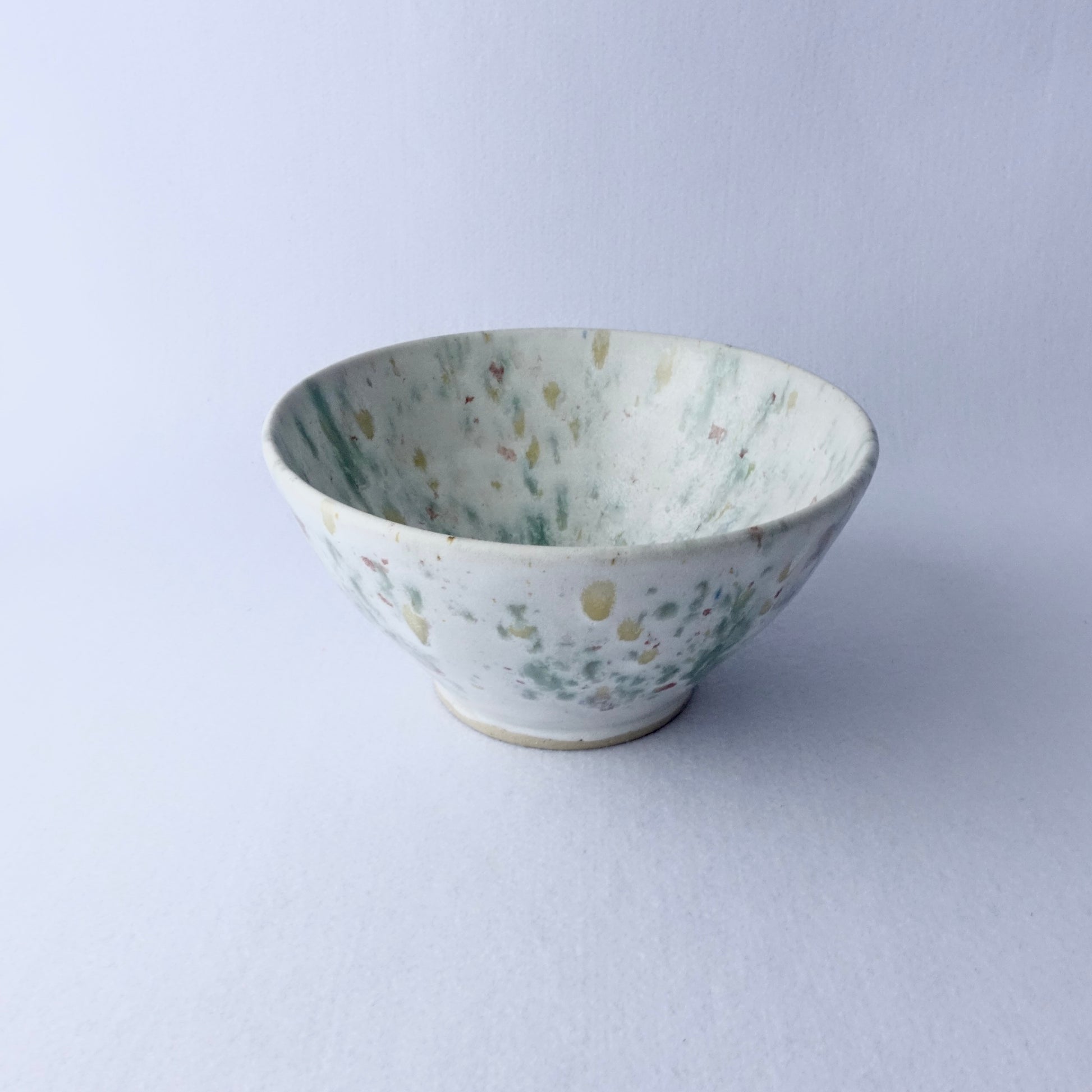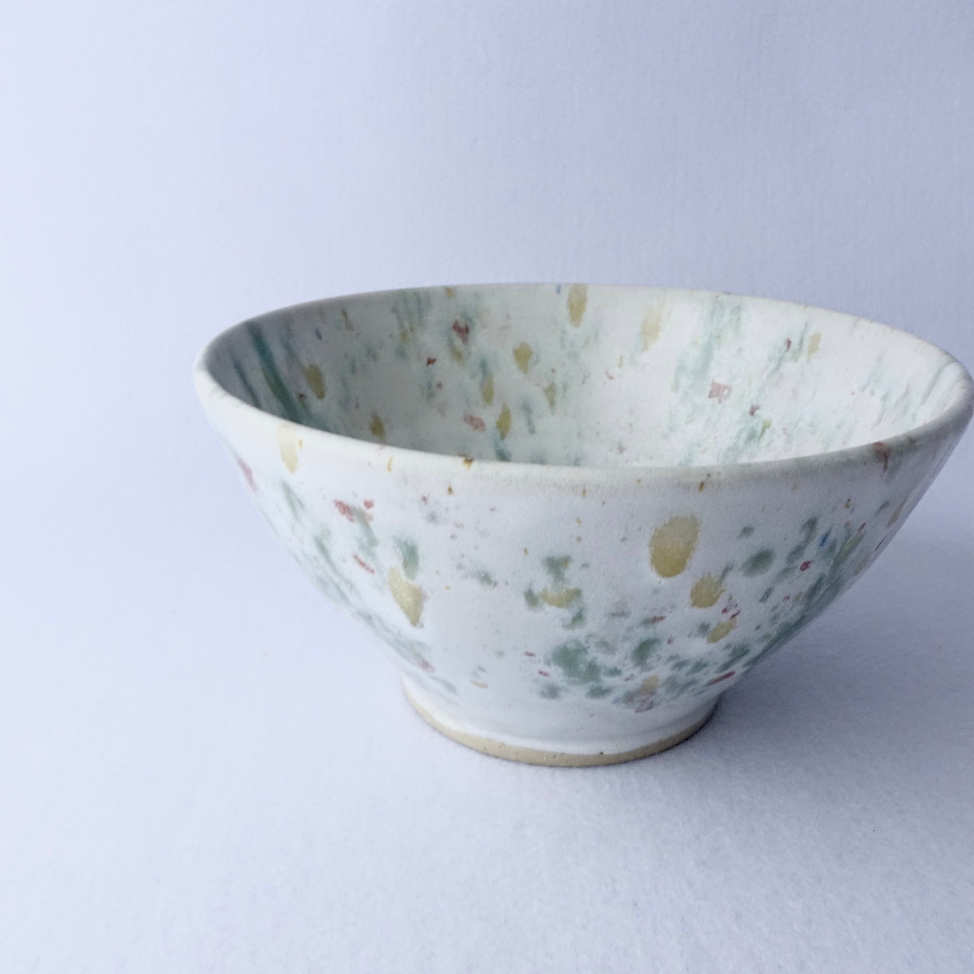 En hånddreid bolle med et lyst, levende uttrykk. Den matte glasuren er dekorert med myke drypp i grønne, gule og rosa toner – som små spor av vår i keramikken. Perfekt til friske salater, frukt eller som et dekorativt innslag på bordet.