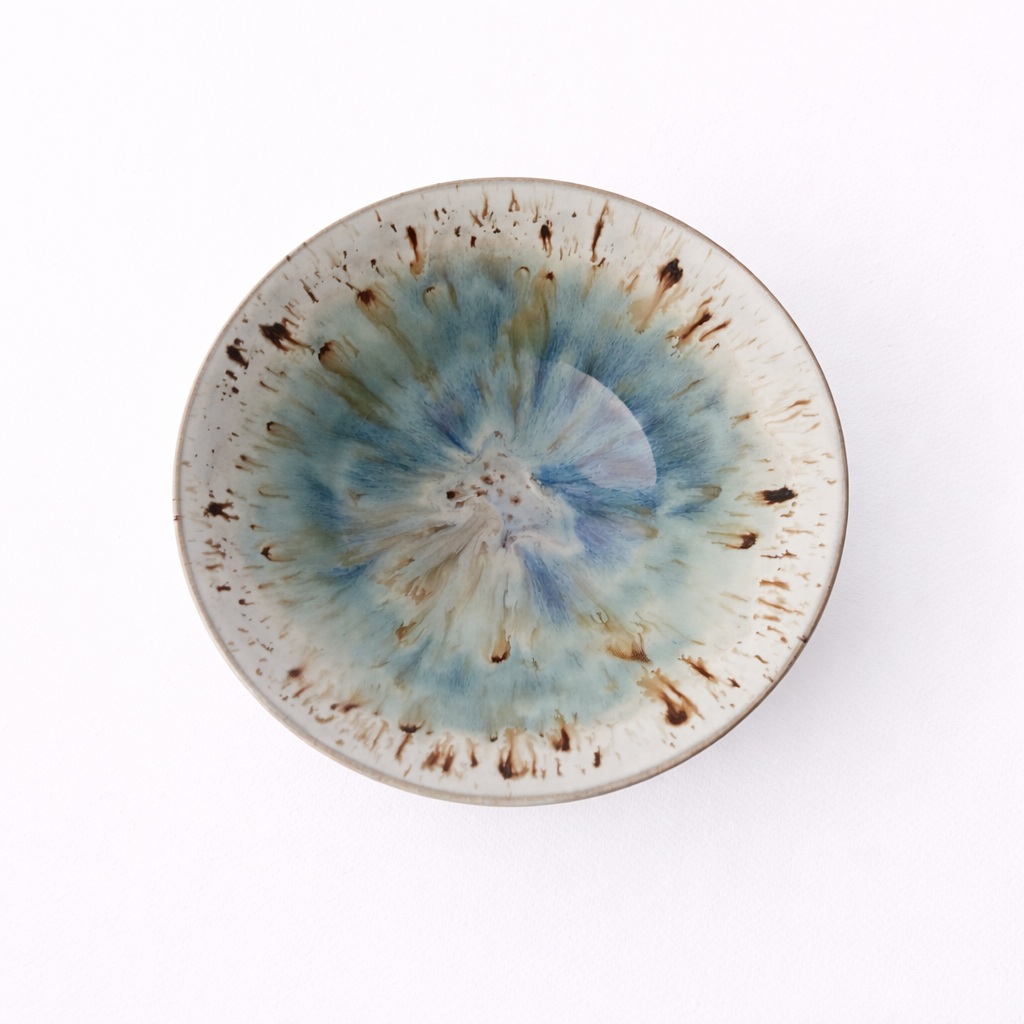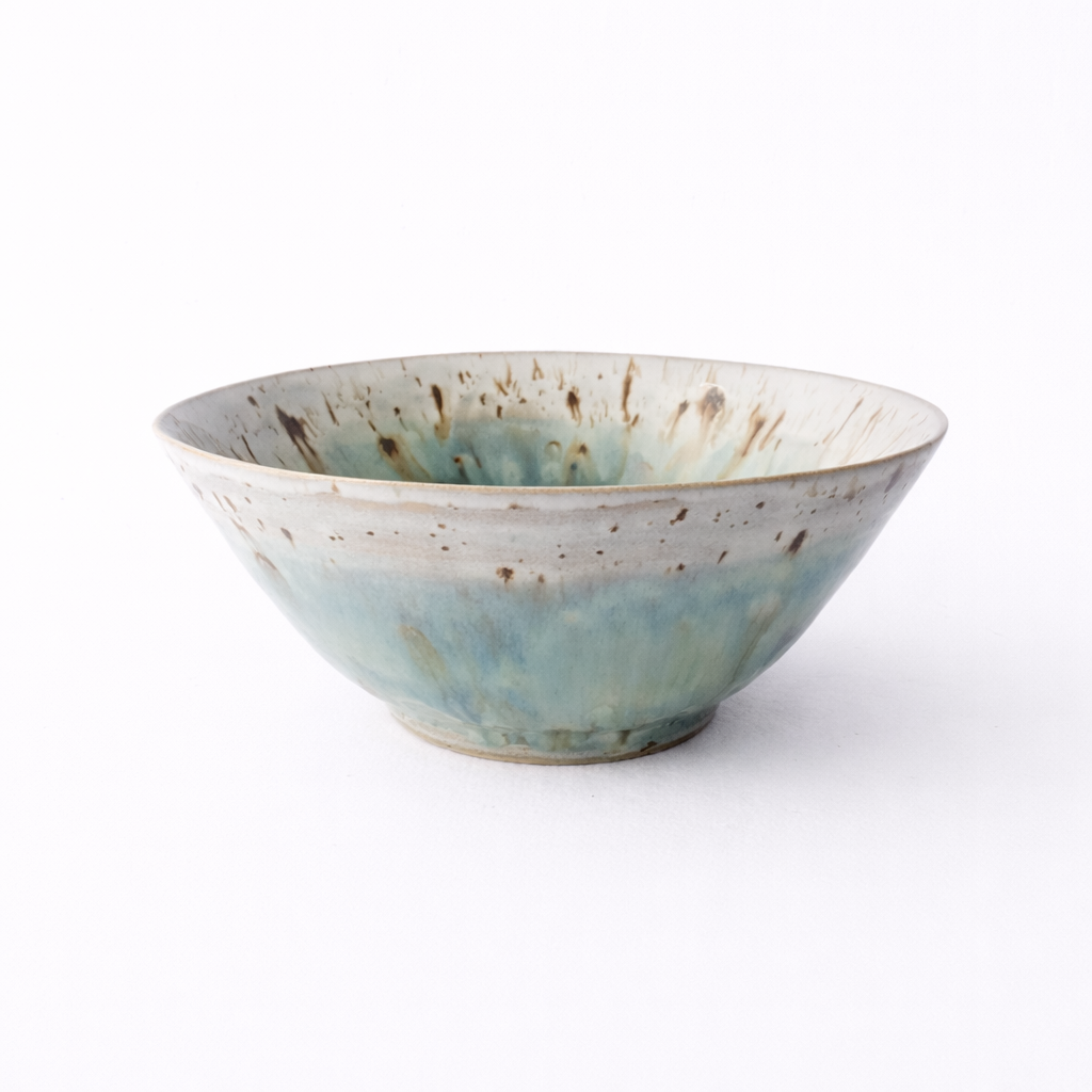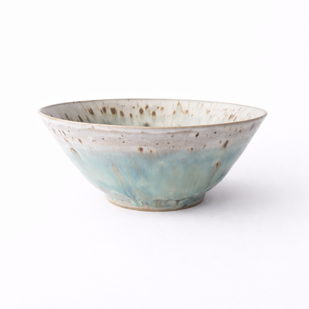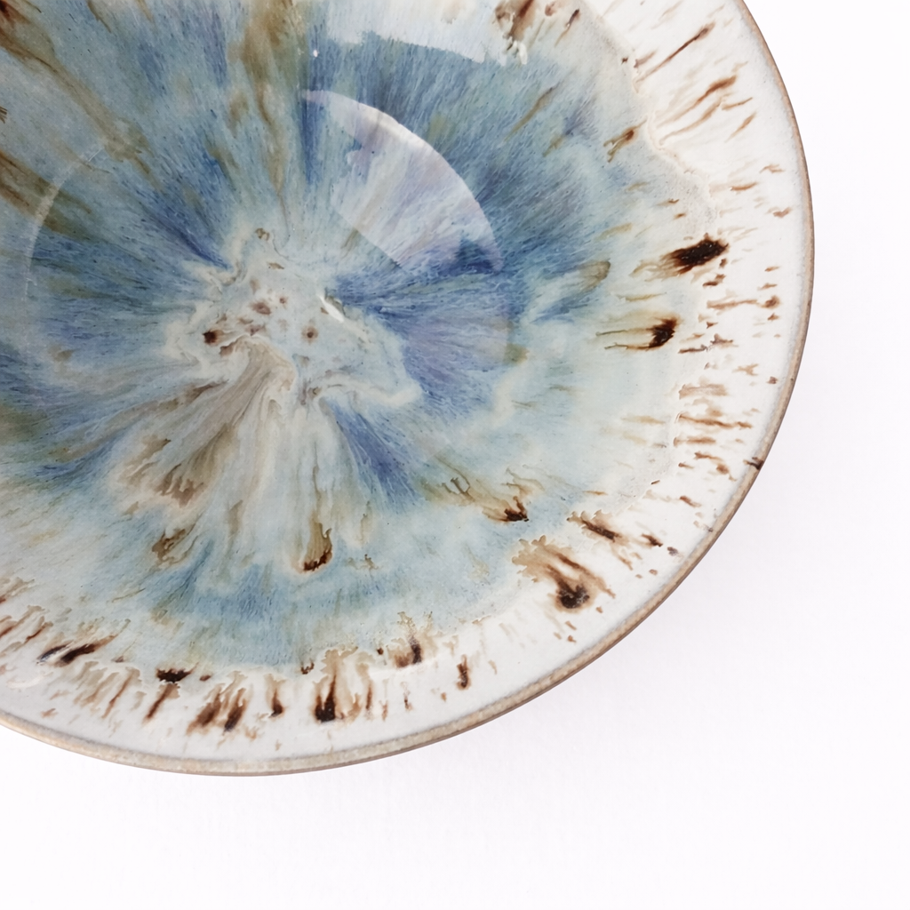 Denne unike keramikkbollen henter inspirasjon fra naturens egne farger og former – som en glitrende isbre i bevegelse. Glasuren flyter i nyanser av turkis, blått og hvitt med dype brune kontraster som minner om smeltende is og jordens spor. Bollen passer perfekt til salater, frukt eller som et vakkert blikkfang i hjemmet. Håndlaget i Oslo, og hver eneste bolle er helt unik.