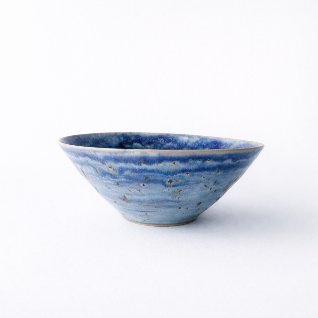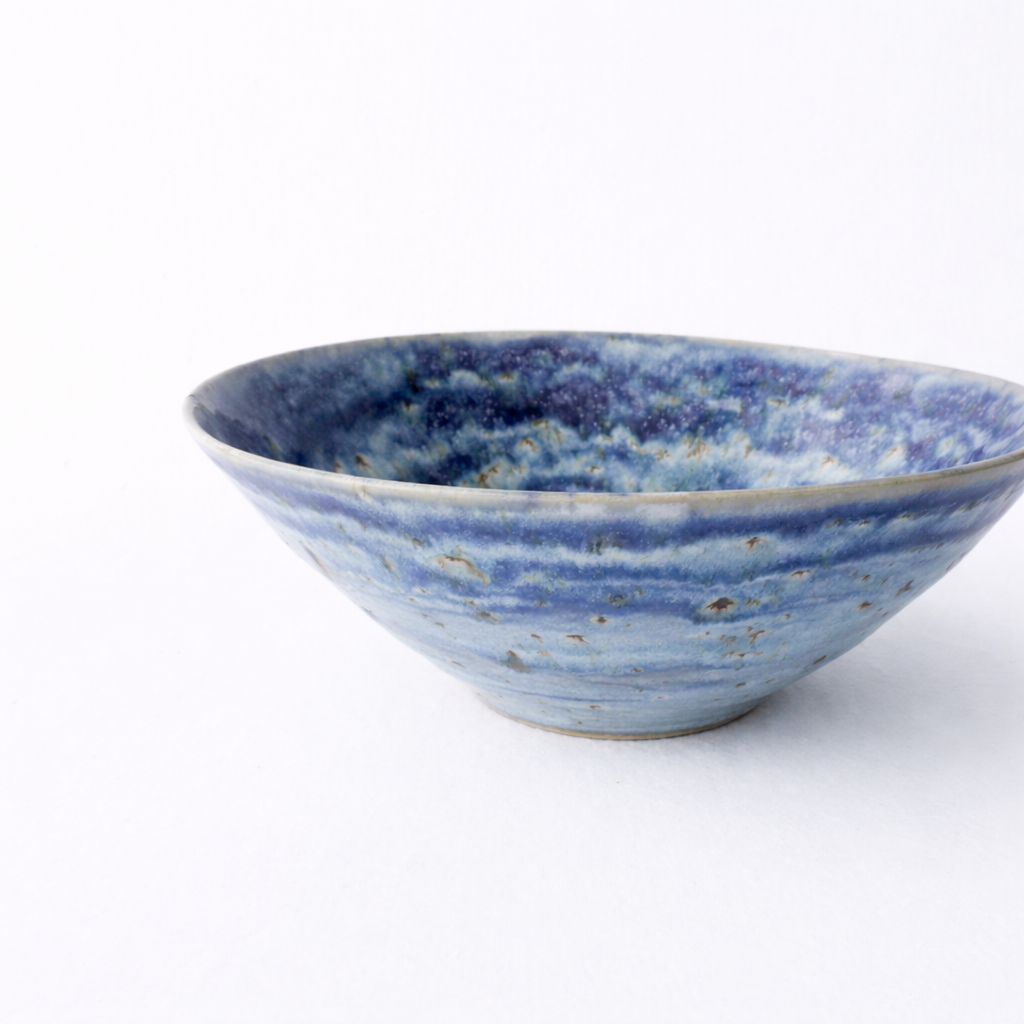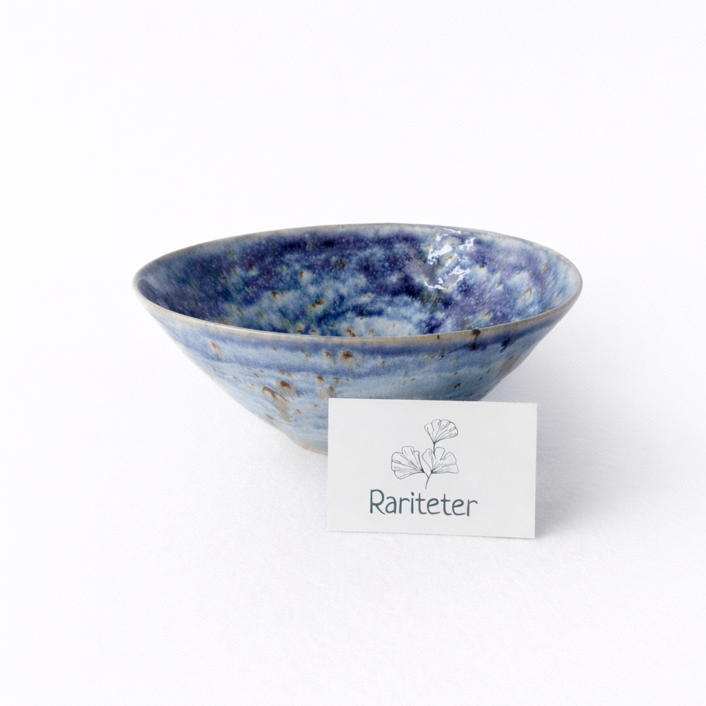 En hånddreid bolle med dyp blå glasur som spiller i ulike nyanser – fra lyse toner til mørkere skygger, som et stille hav. Den romslige formen gjør den perfekt til salater, frukt eller som et dekorativt midtpunkt på bordet. Hver bolle er unik, med sitt eget mønster i glasuren.