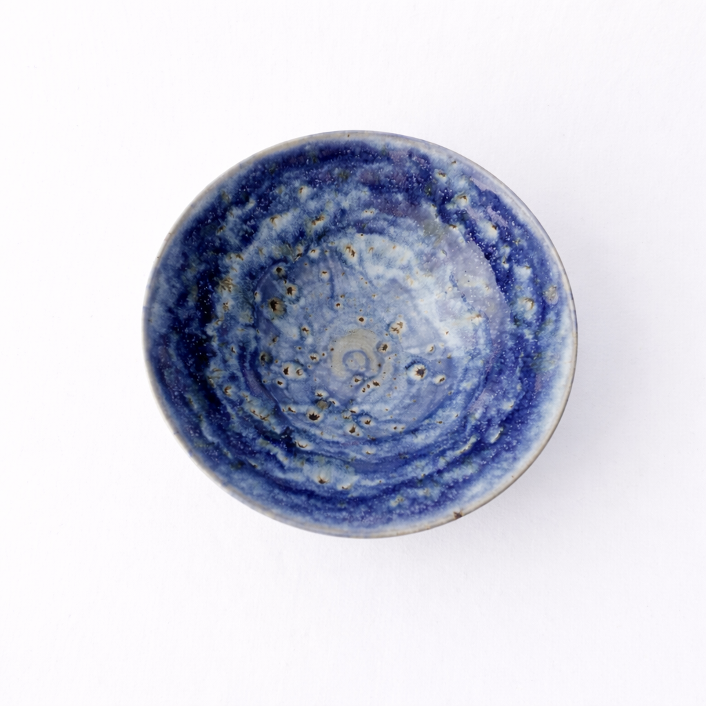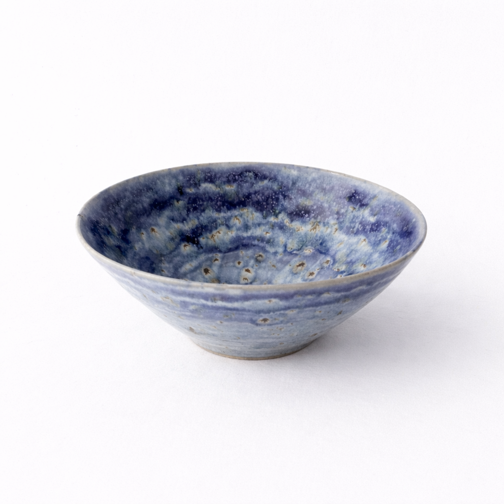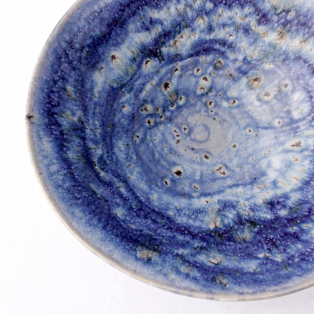 En hånddreid bolle med dyp blå glasur som spiller i ulike nyanser – fra lyse toner til mørkere skygger, som et stille hav. Den romslige formen gjør den perfekt til salater, frukt eller som et dekorativt midtpunkt på bordet. Hver bolle er unik, med sitt eget mønster i glasuren.