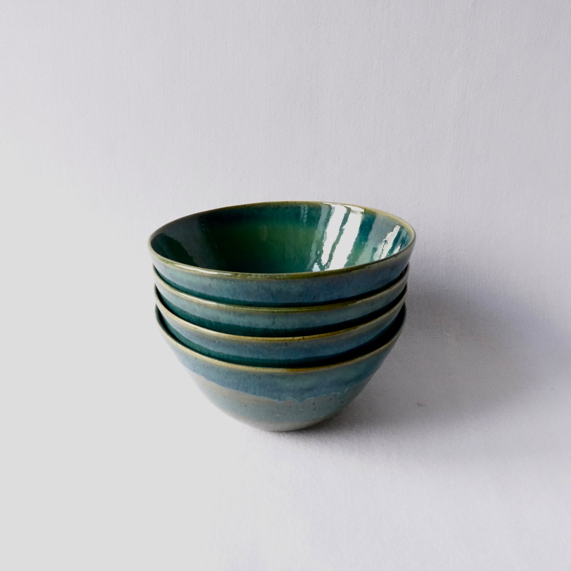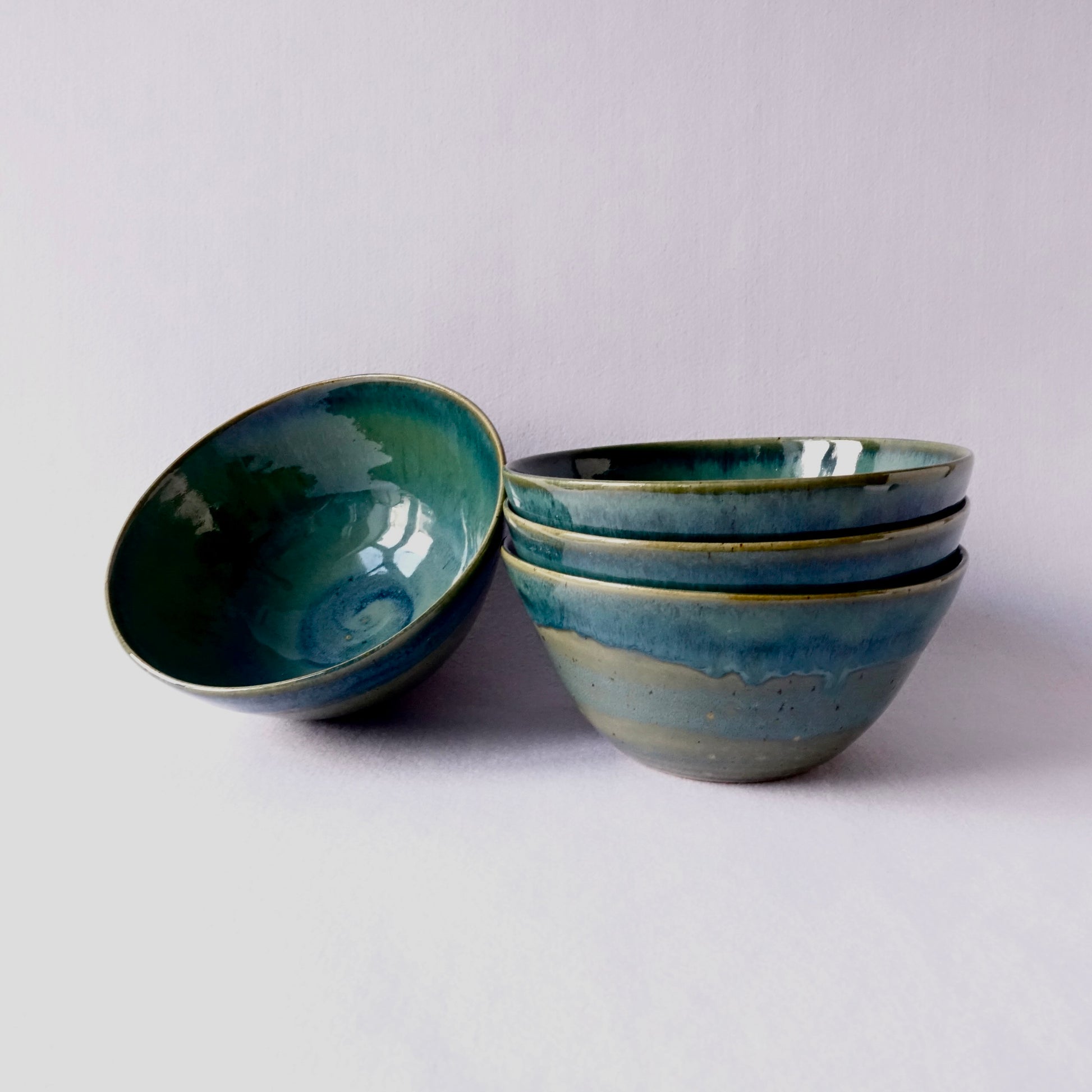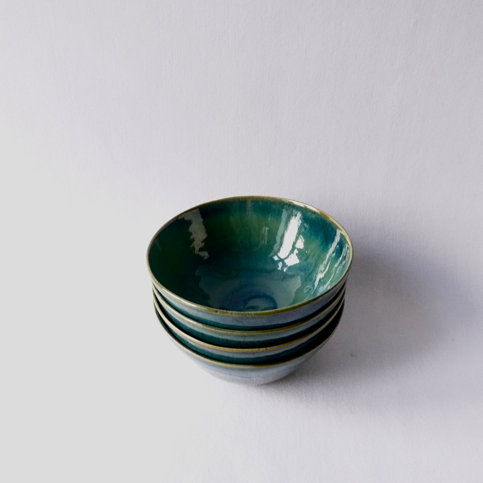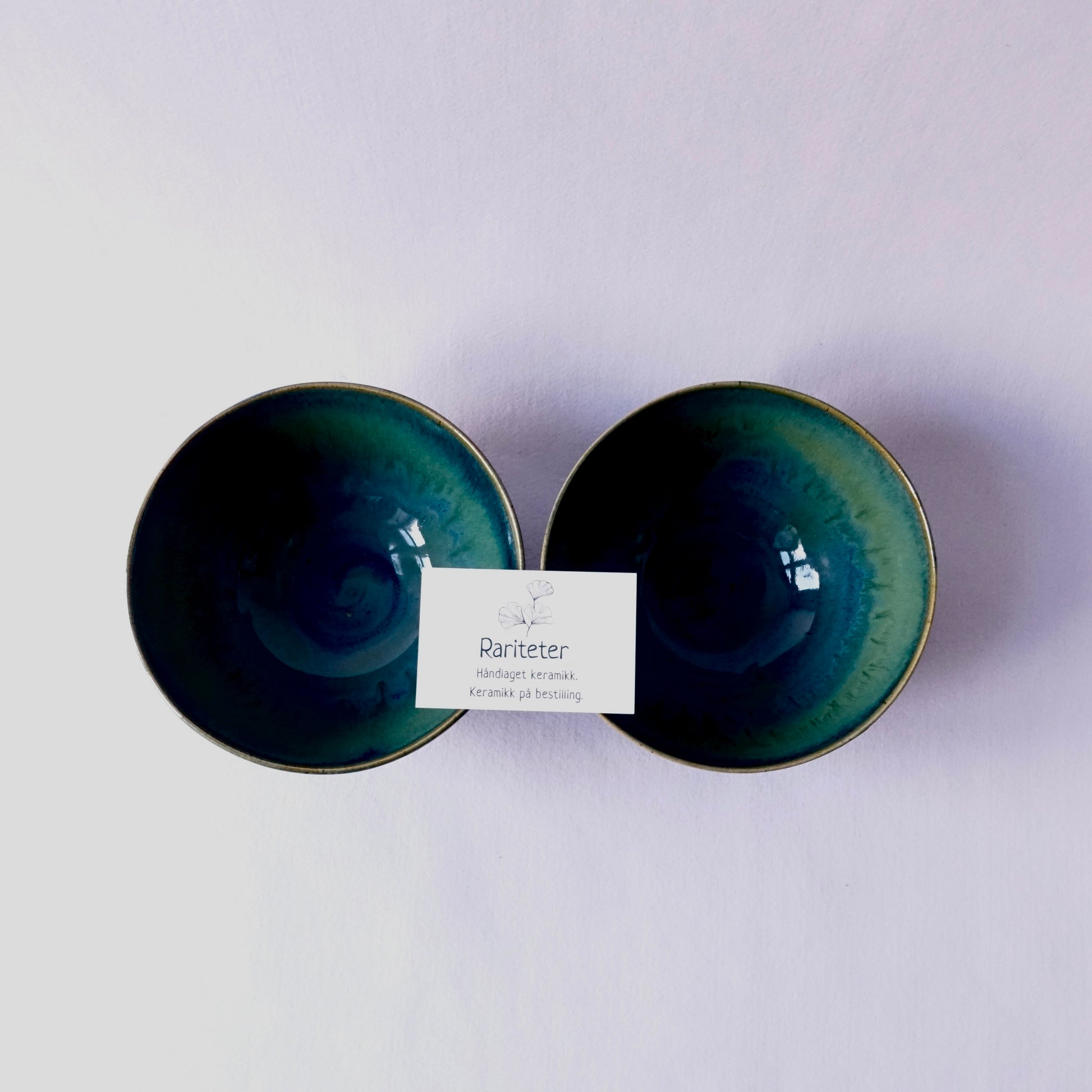 Håndlagde keramiske skåler med dype blå- og grønntoner som flyter sammen i en levende, blank glasur. Fargespillet gir assosiasjoner til hav og landskap, og hver skål får sitt eget unike uttrykk. Perfekte til servering, frokost eller som dekorative objekter – like fine alene som i par.