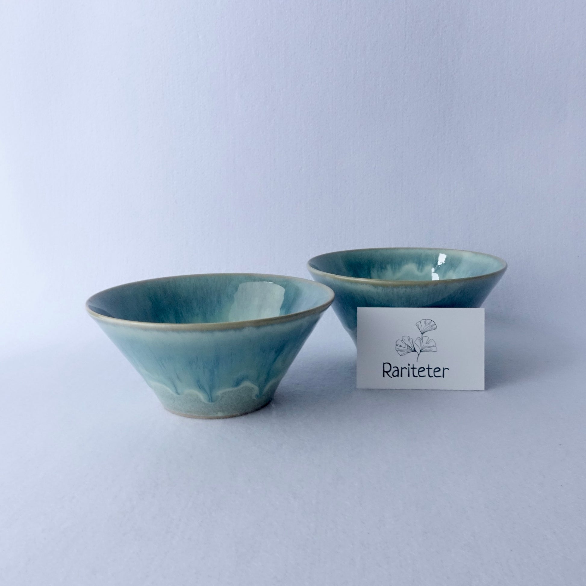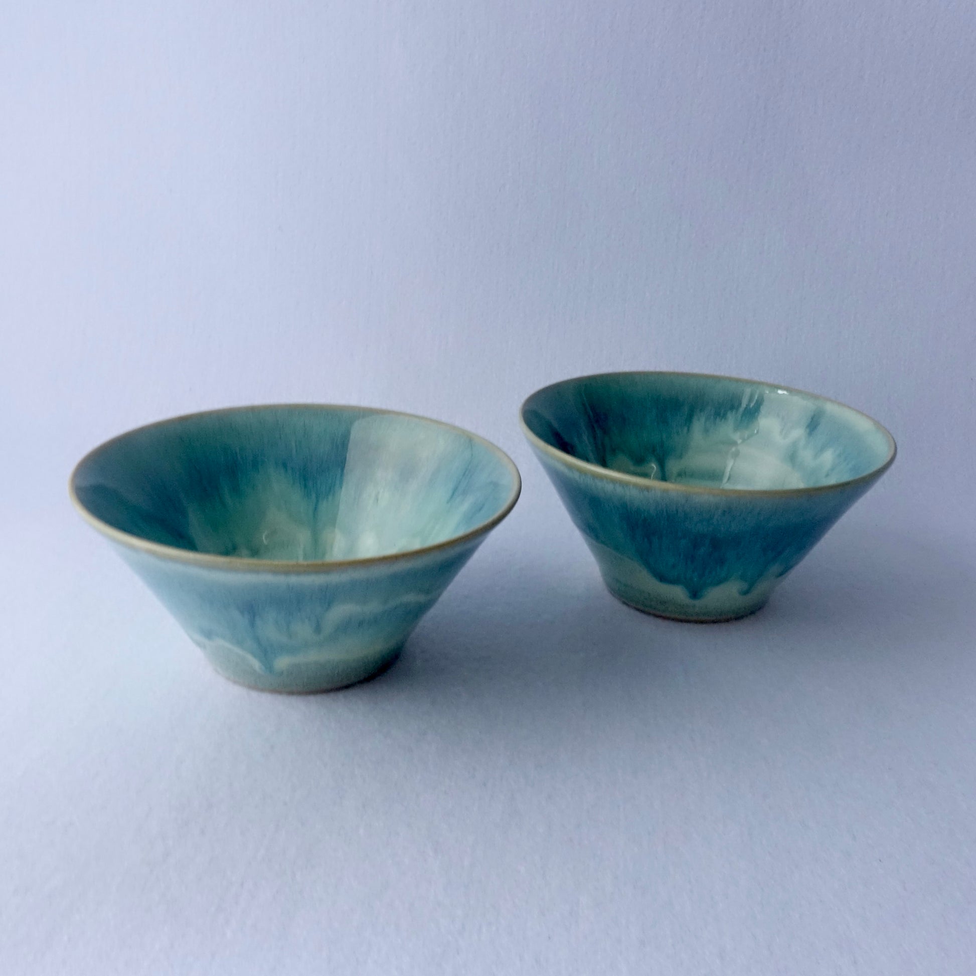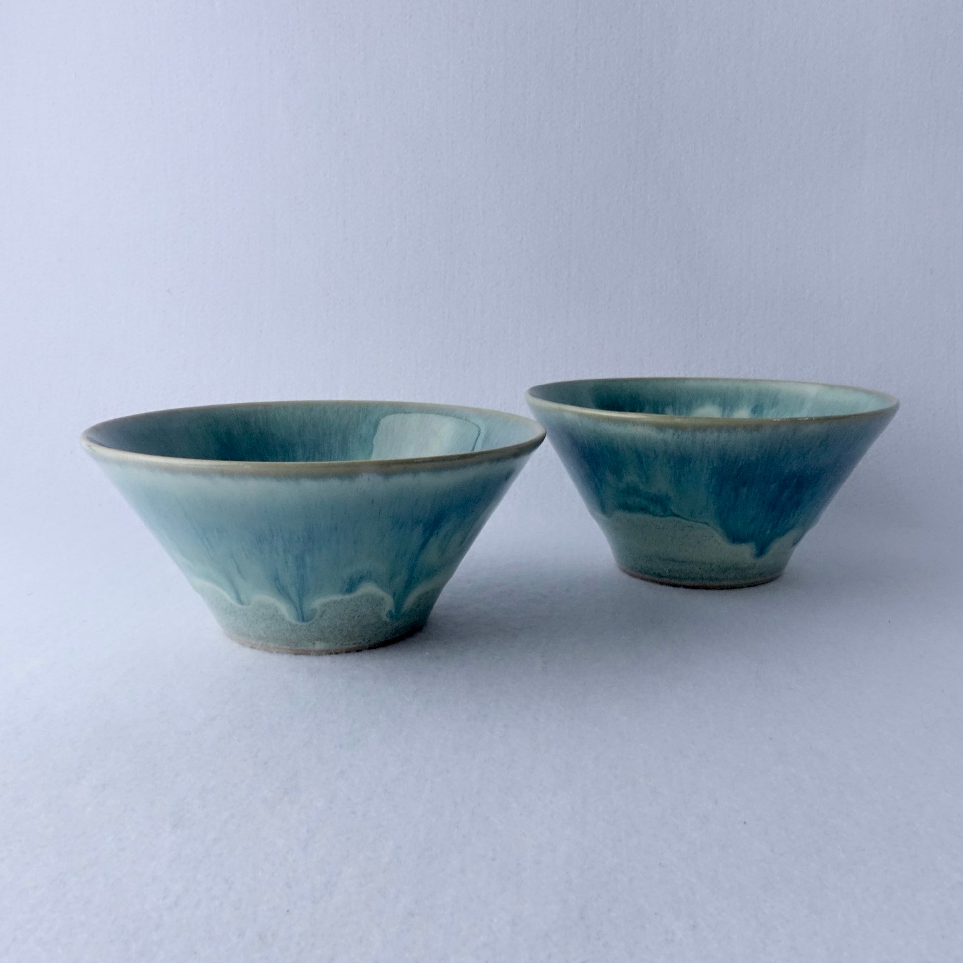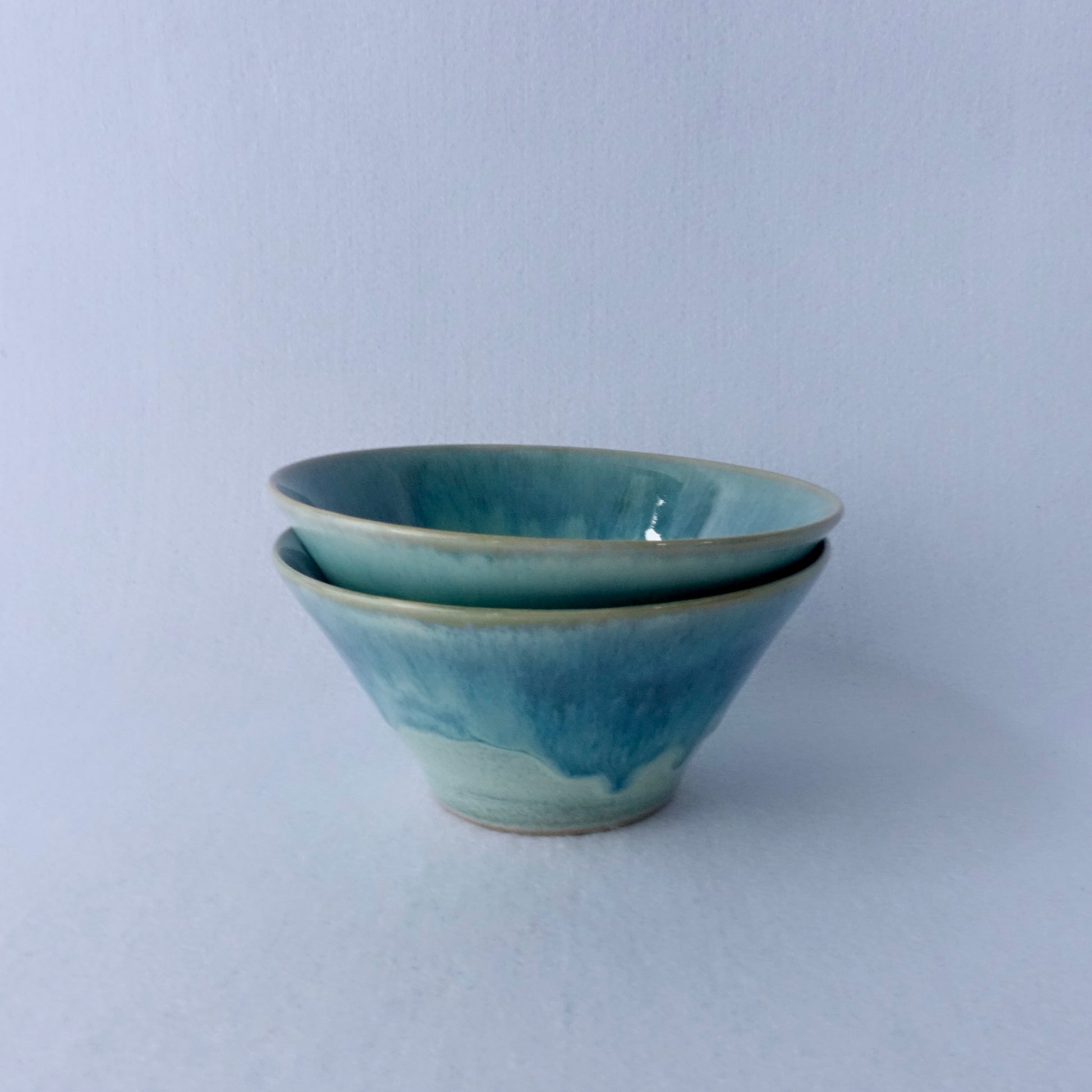 Disse håndlagde skålene har en myk konisk form og en glasur som spiller i blågrønne nyanser, som minner om havets dyp og strandens skiftende lys. Perfekte til en porsjon suppe, ramen eller en frisk salat. Hver skål er unik, med naturlige glasurbevegelser som gir et levende uttrykk.