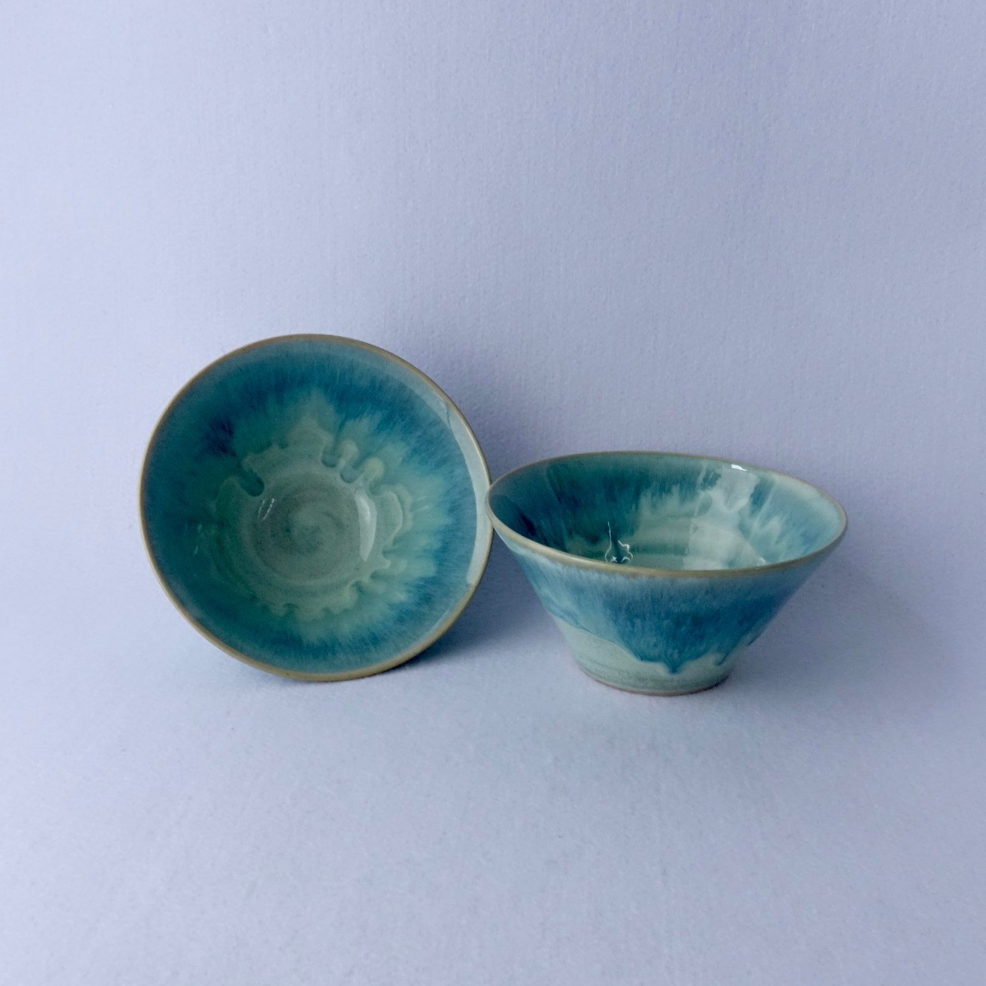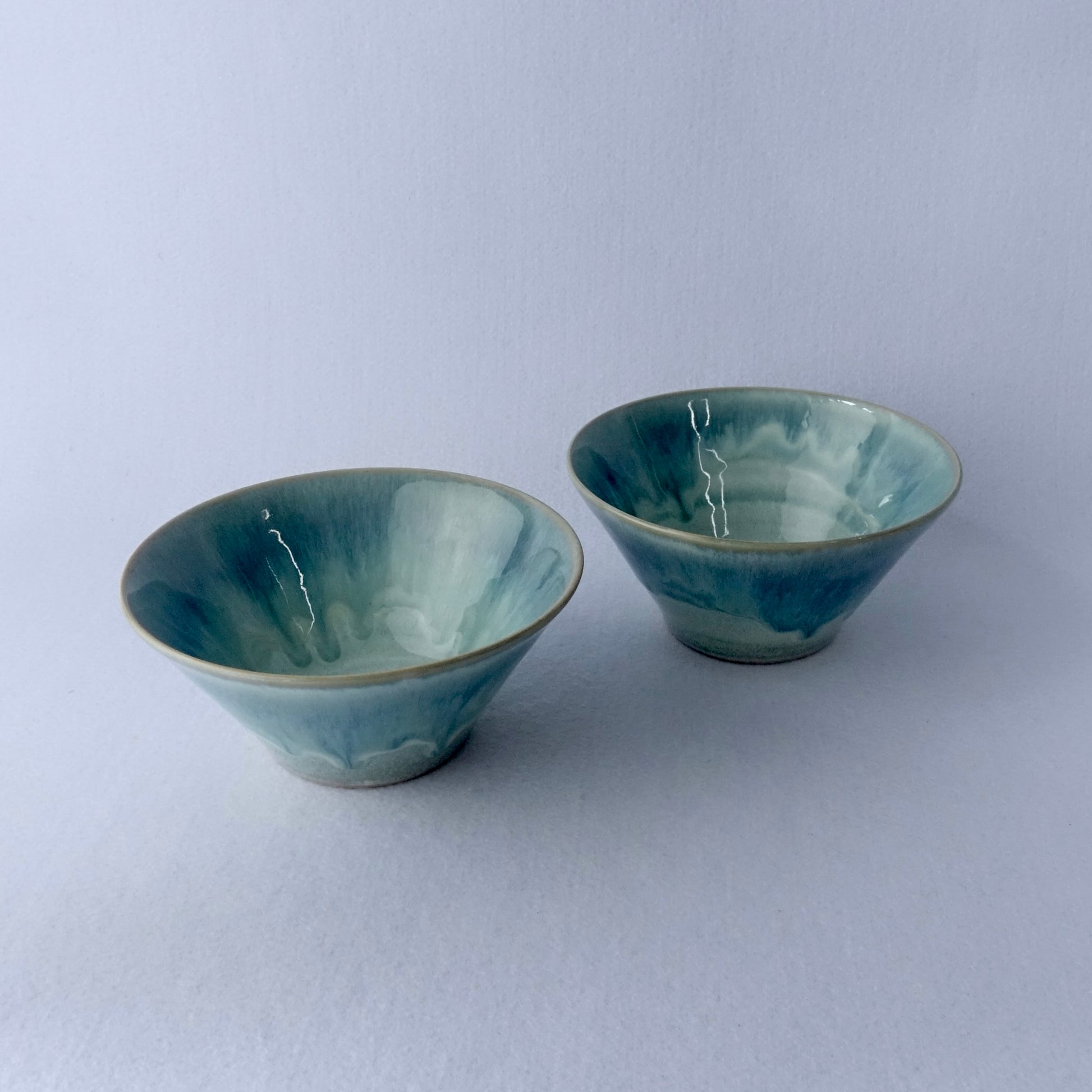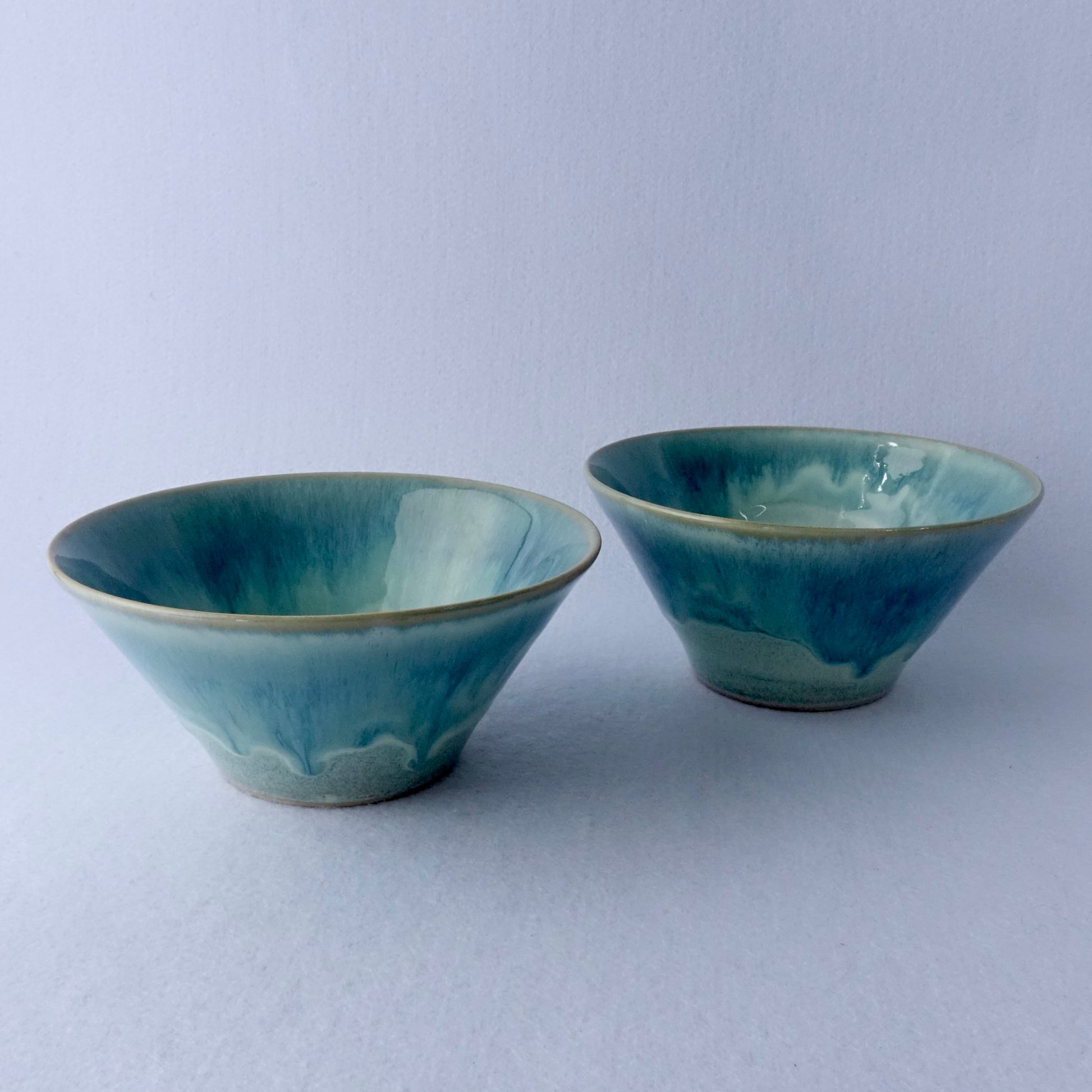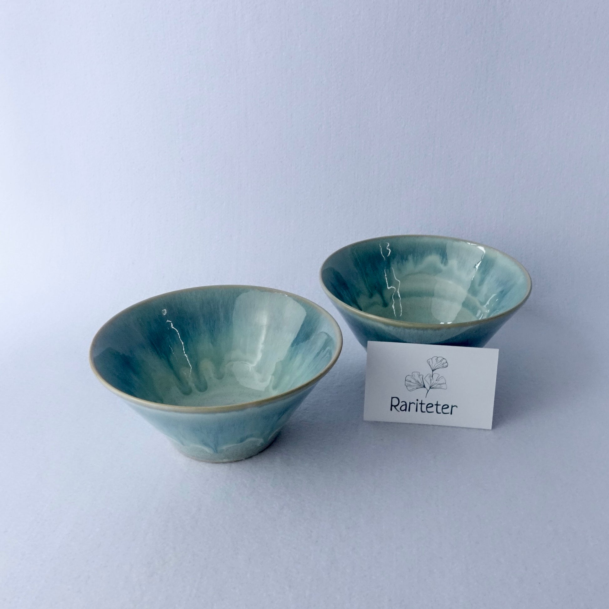 Disse håndlagde skålene har en myk konisk form og en glasur som spiller i blågrønne nyanser, som minner om havets dyp og strandens skiftende lys. Perfekte til en porsjon suppe, ramen eller en frisk salat. Hver skål er unik, med naturlige glasurbevegelser som gir et levende uttrykk.