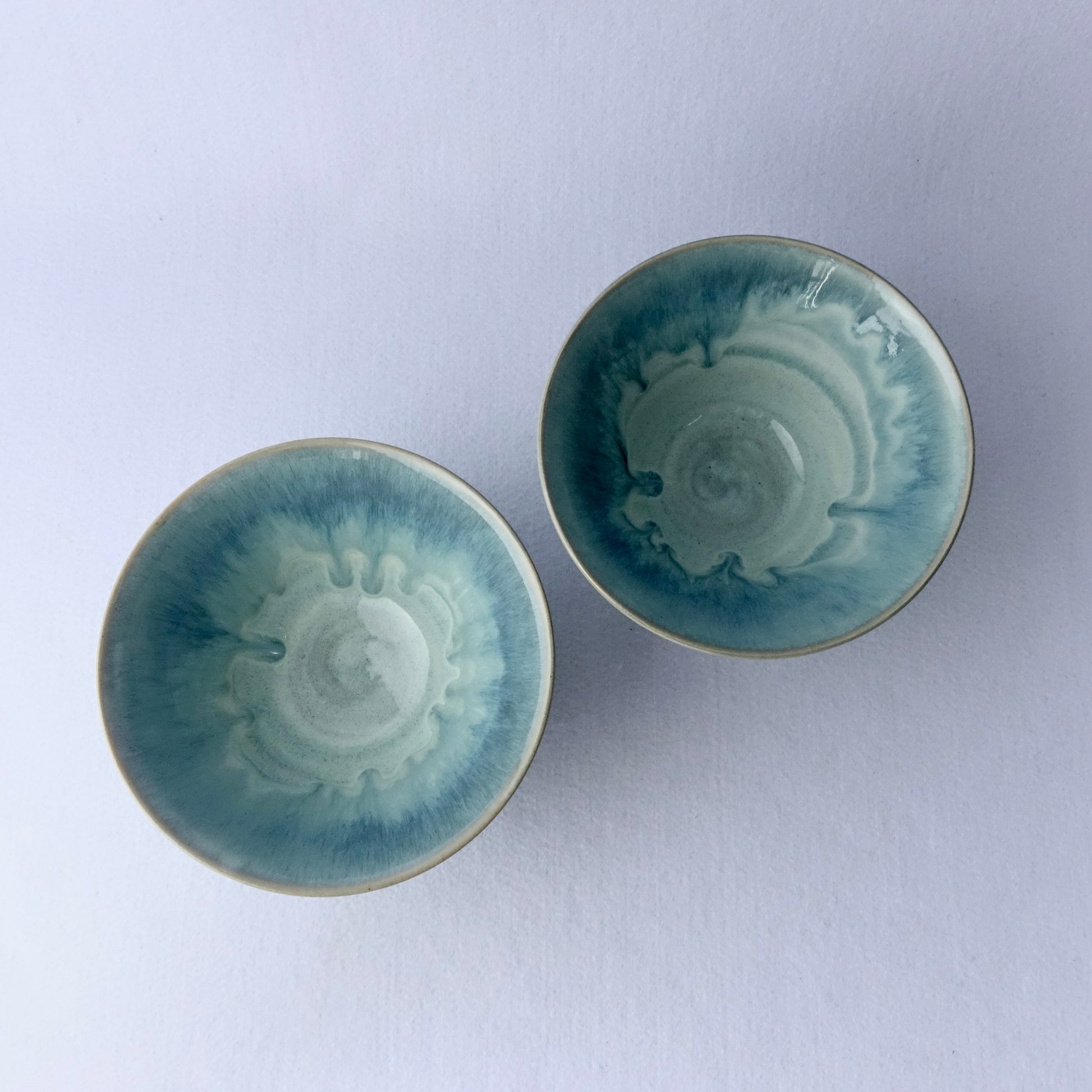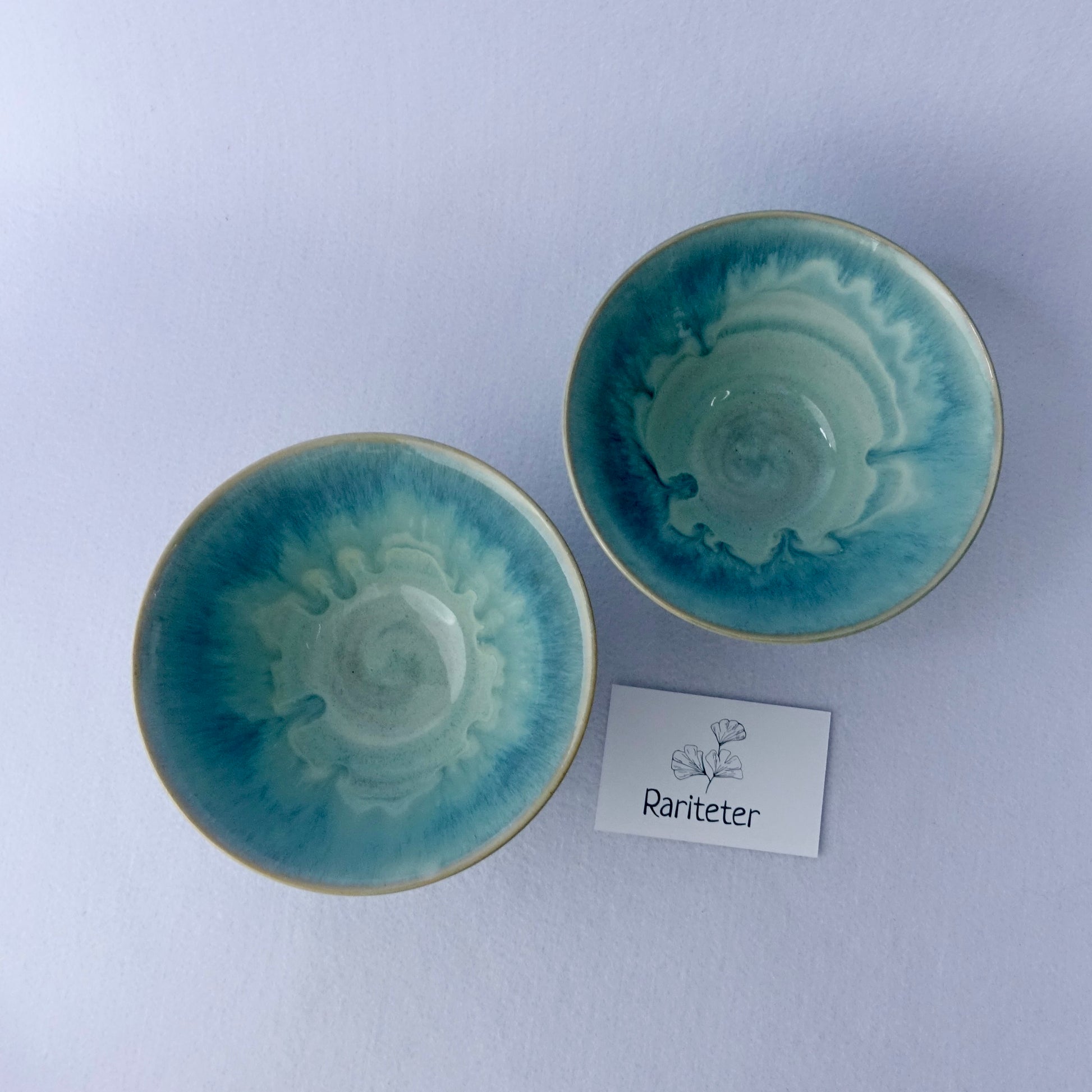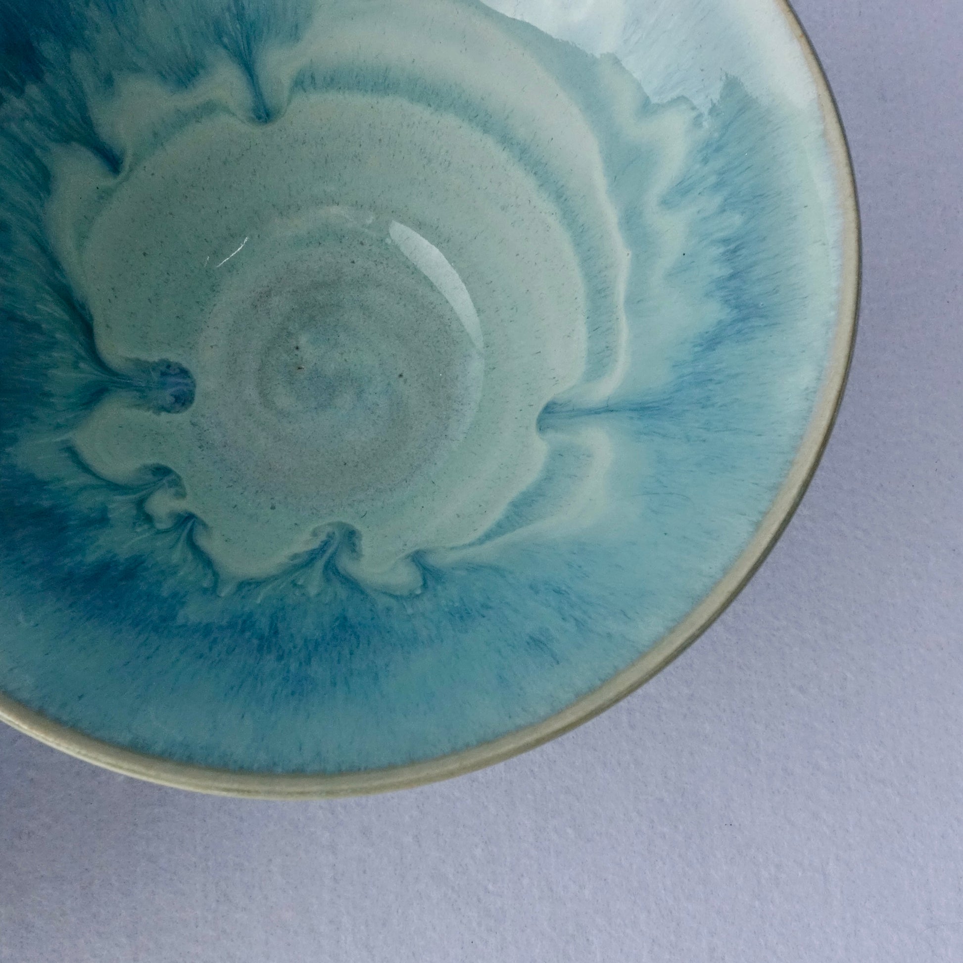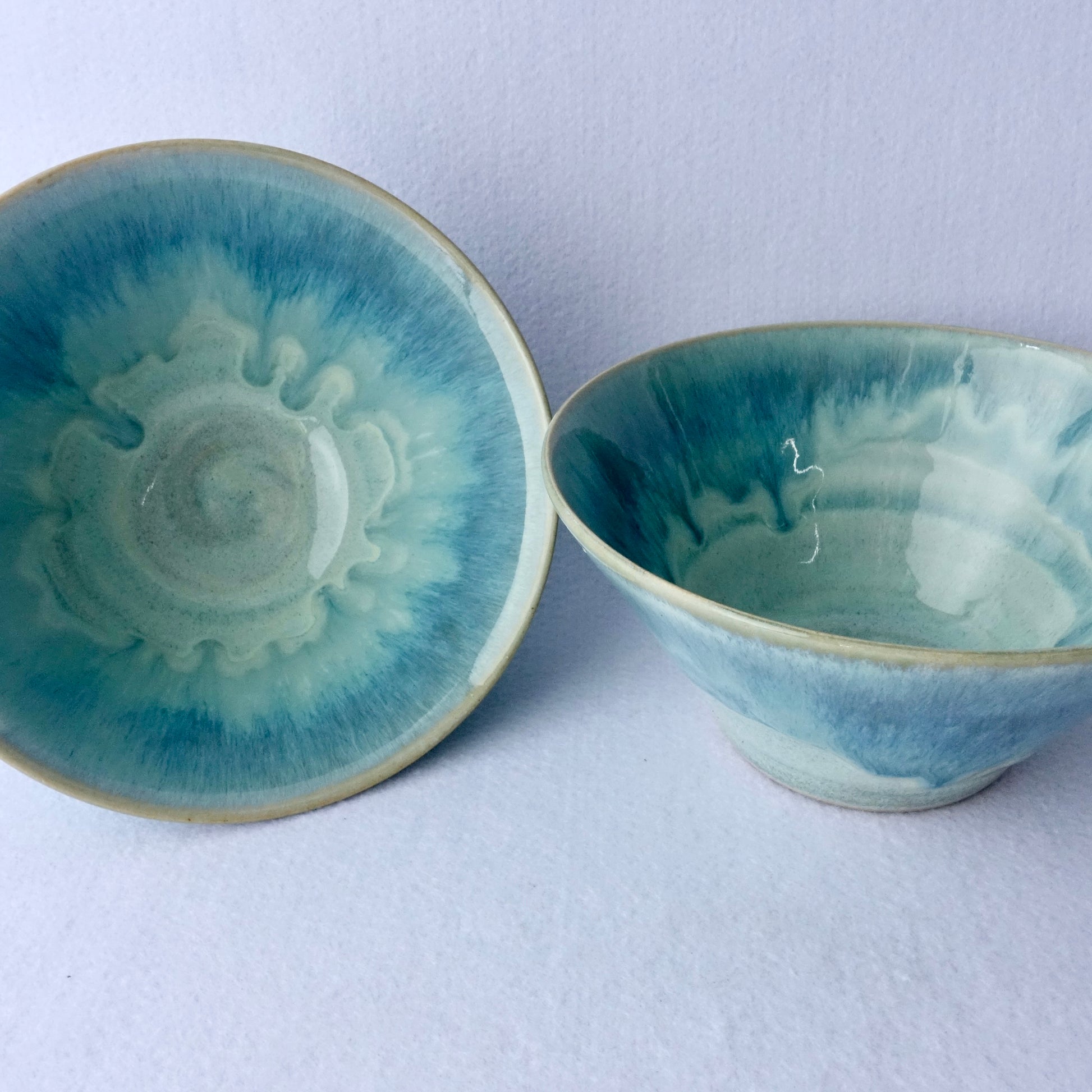 Disse håndlagde skålene har en myk konisk form og en glasur som spiller i blågrønne nyanser, som minner om havets dyp og strandens skiftende lys. Perfekte til en porsjon suppe, ramen eller en frisk salat. Hver skål er unik, med naturlige glasurbevegelser som gir et levende uttrykk.
