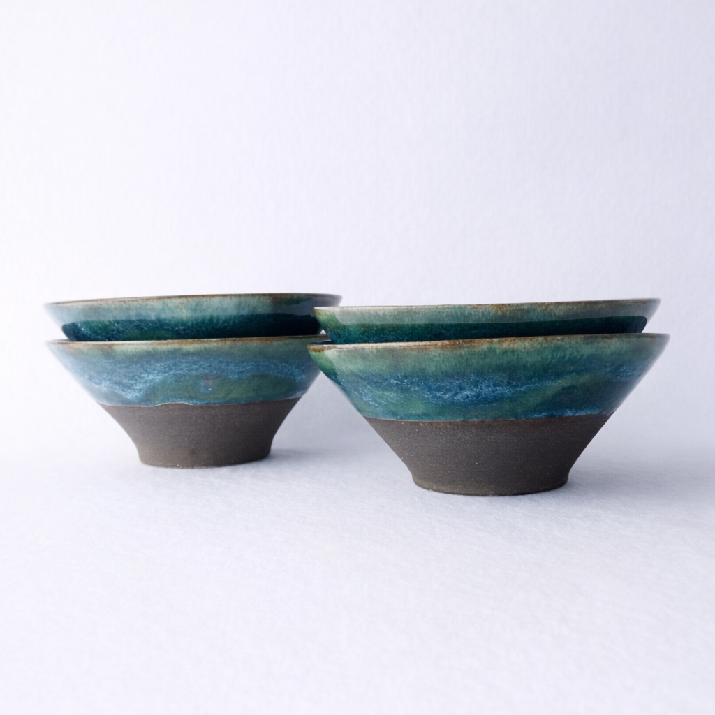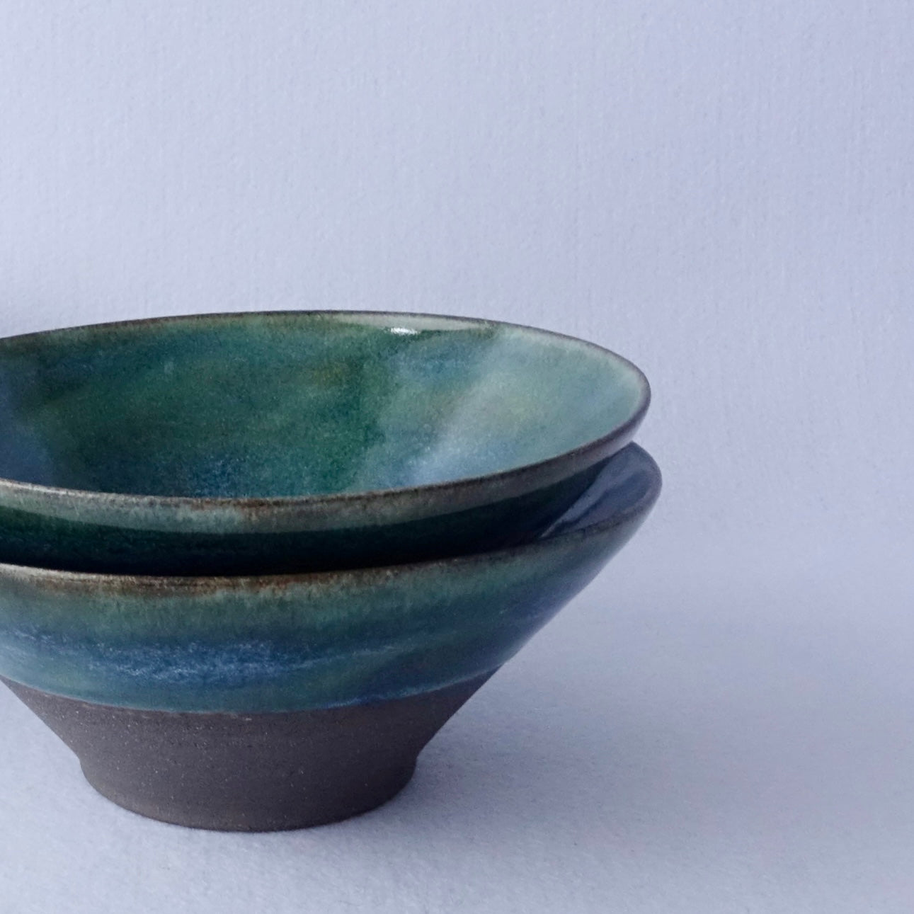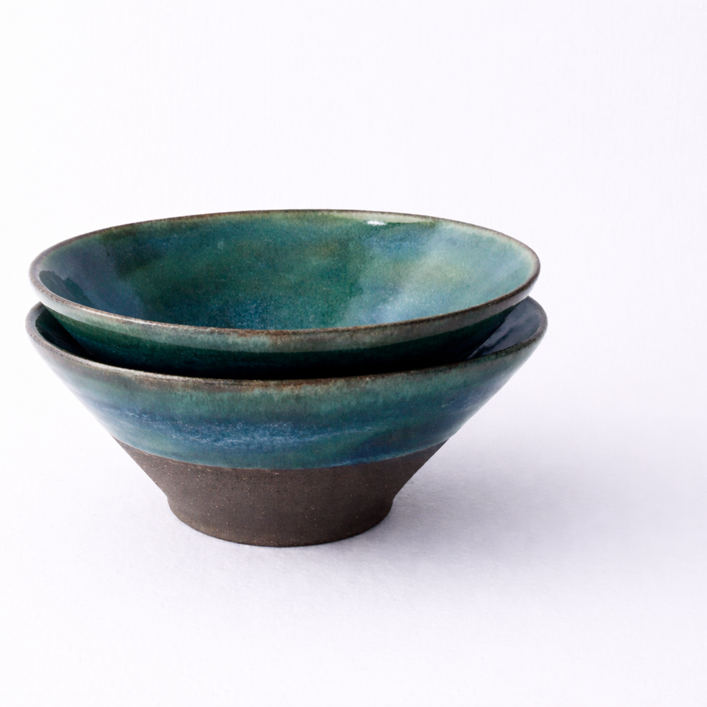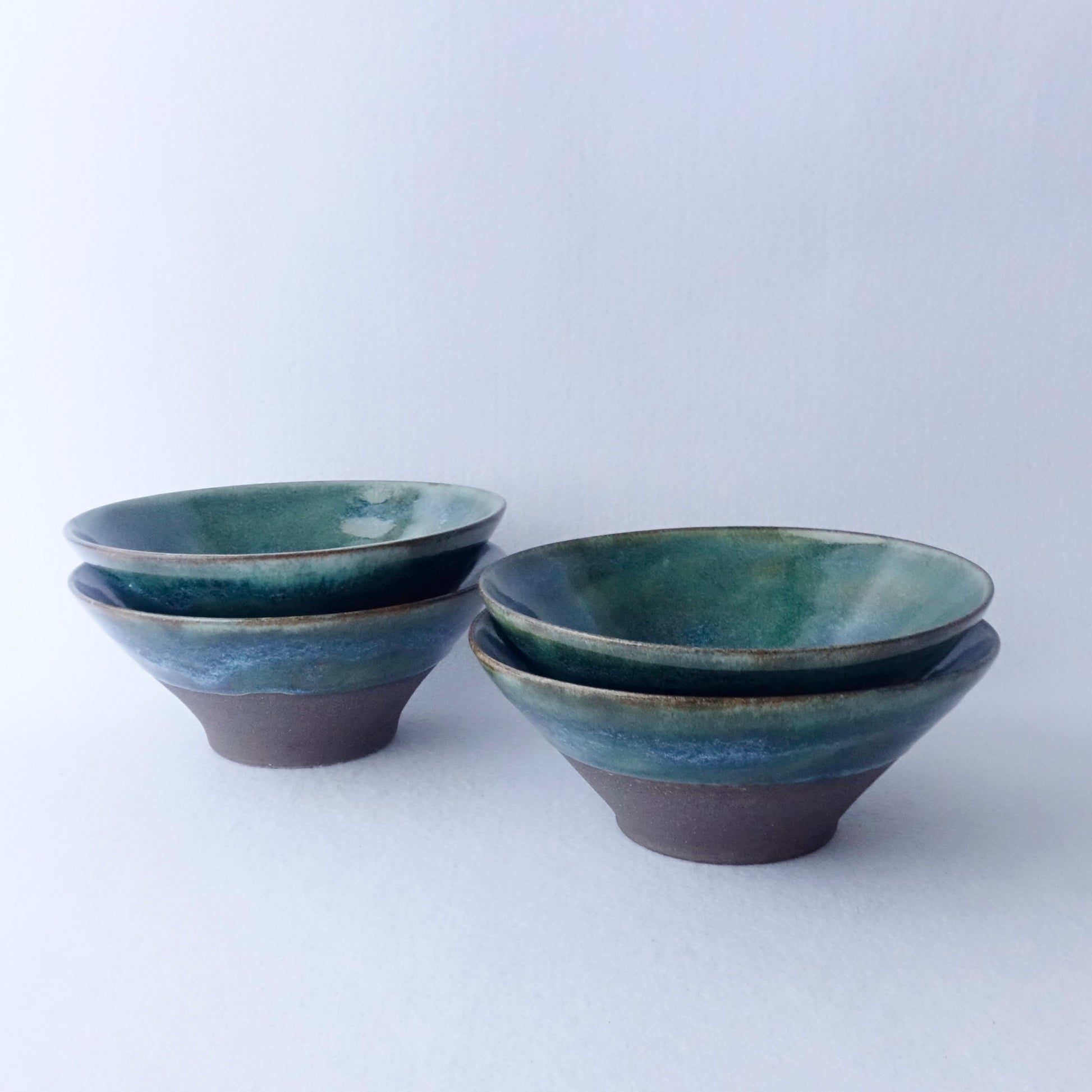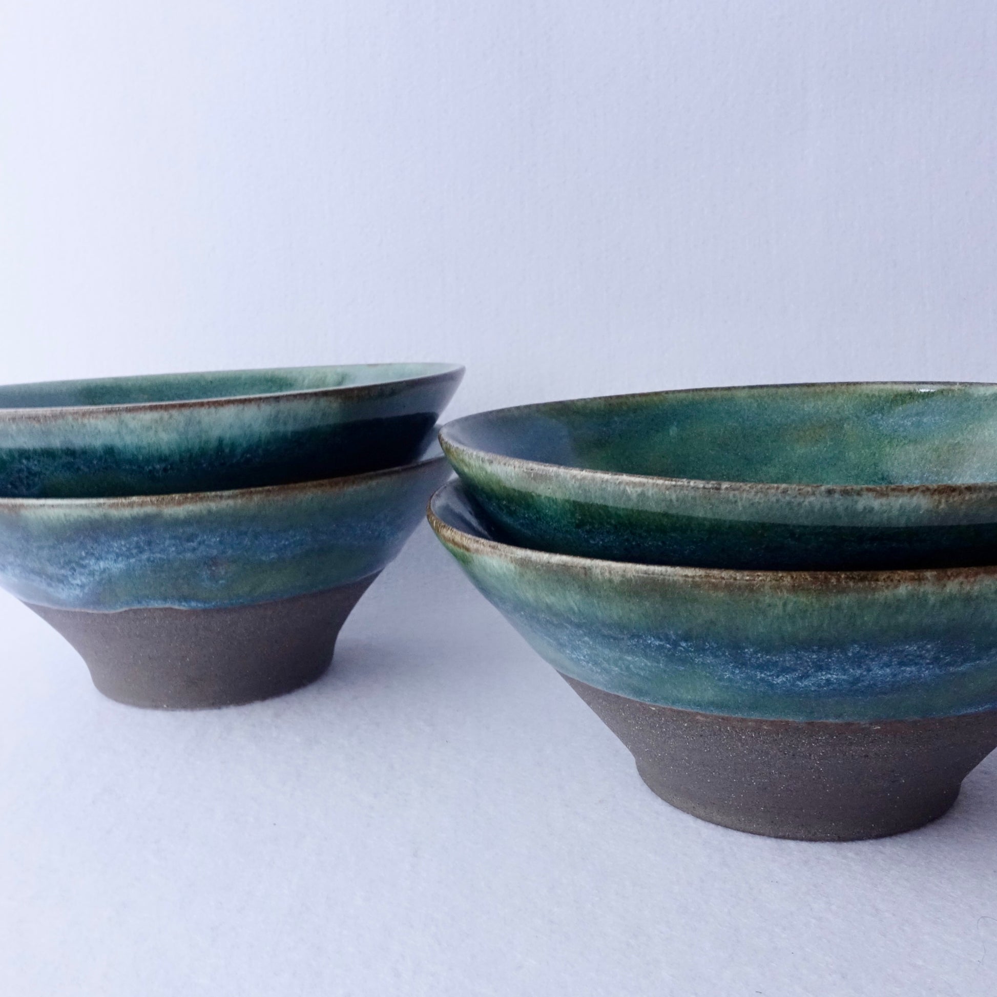 Dype, elegante skåler i mørk leire med glasur som spiller i blågrønne toner. Den glatte innsiden og det myke fargespillet minner om havets bevegelse, mens den solide foten gir et trygt og balansert uttrykk. Perfekte til varme supper, nudler eller en raus porsjon gryterett – og like fine til frokostblanding eller salat.