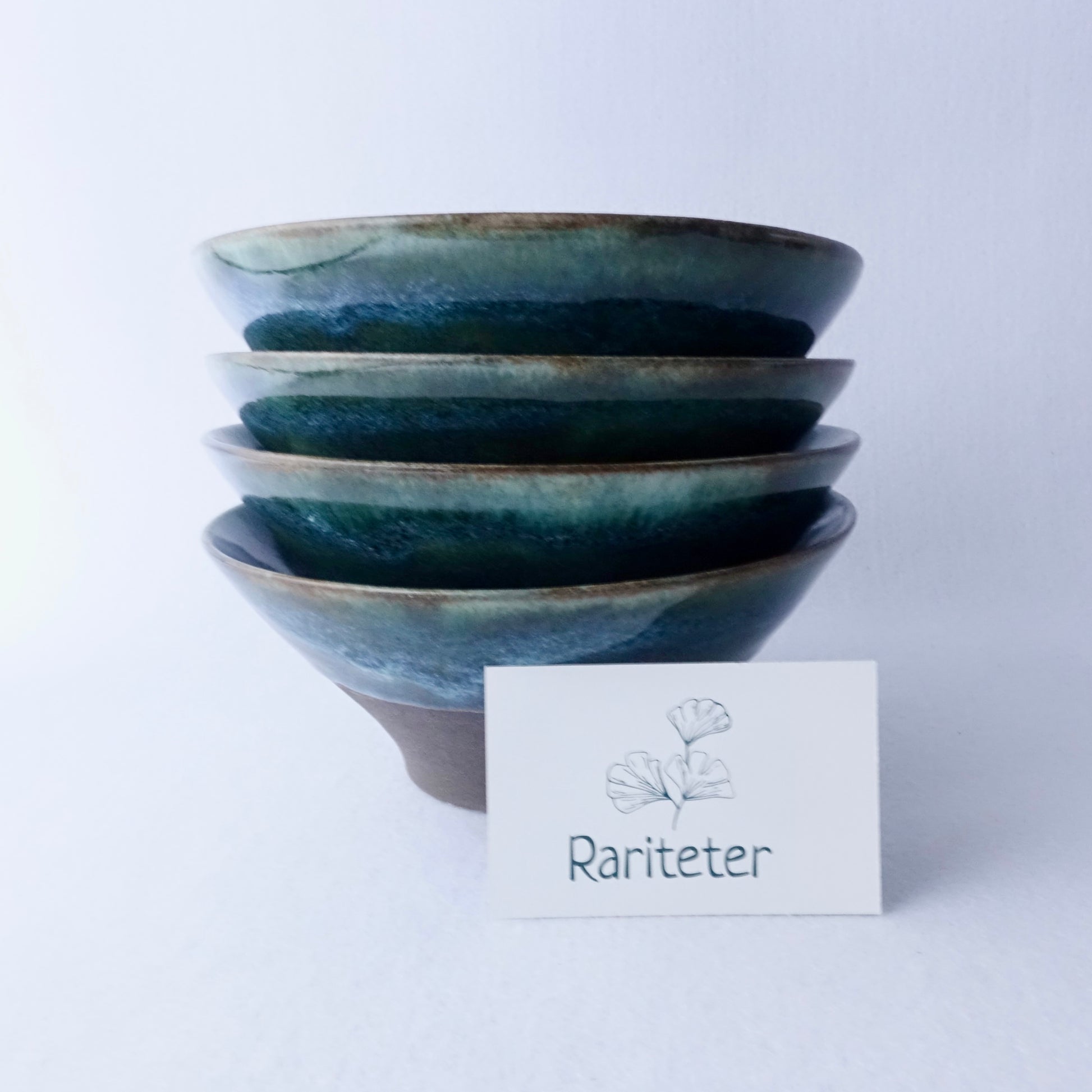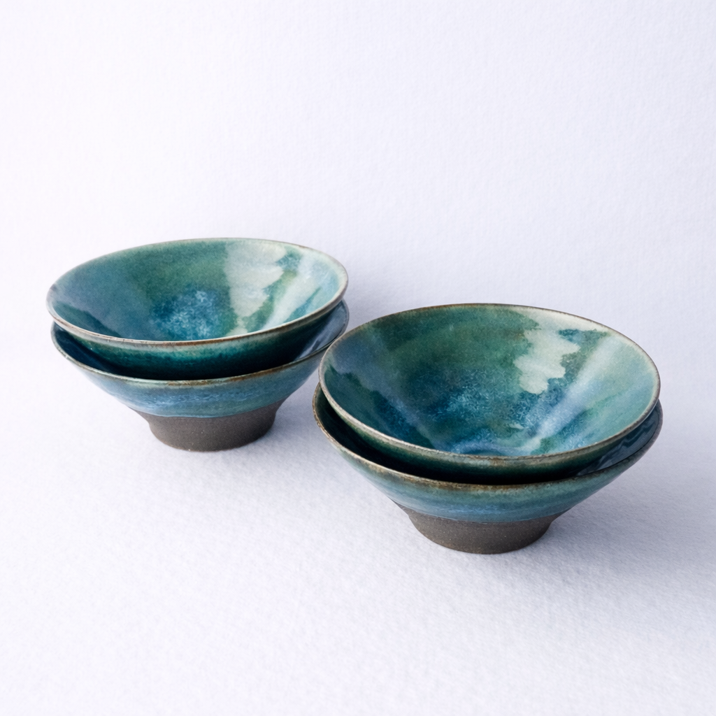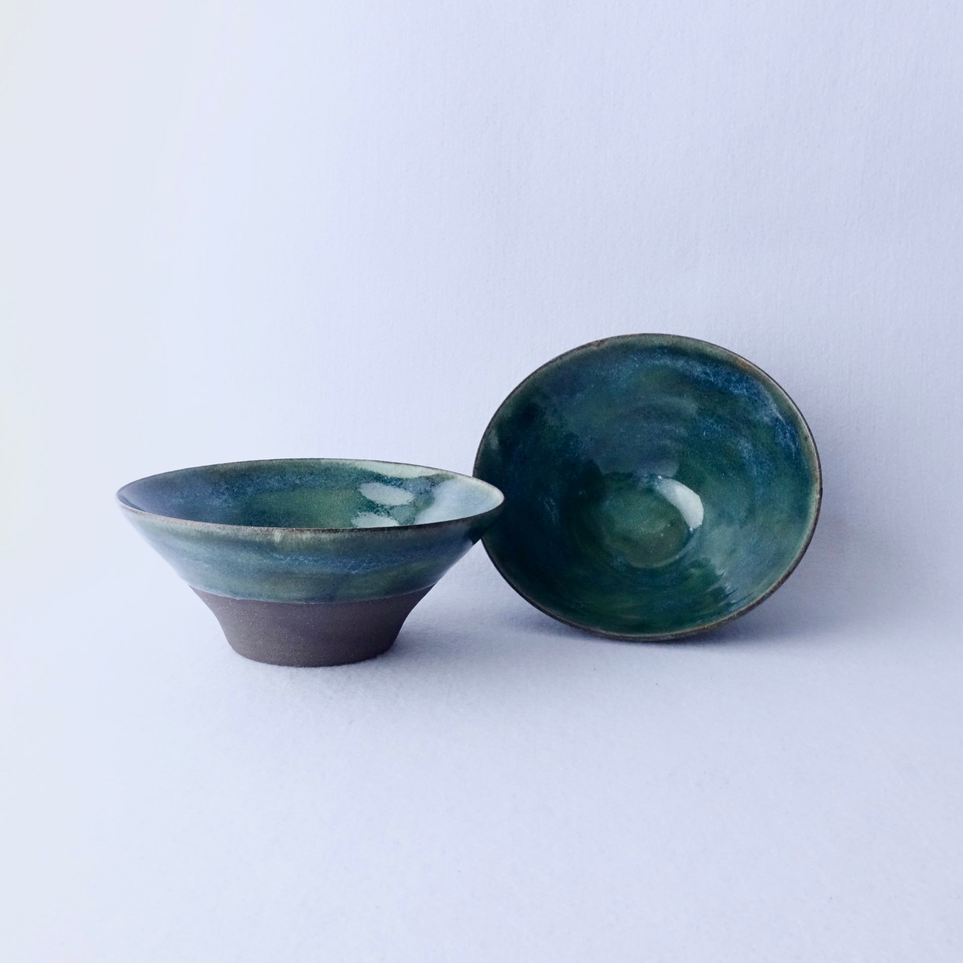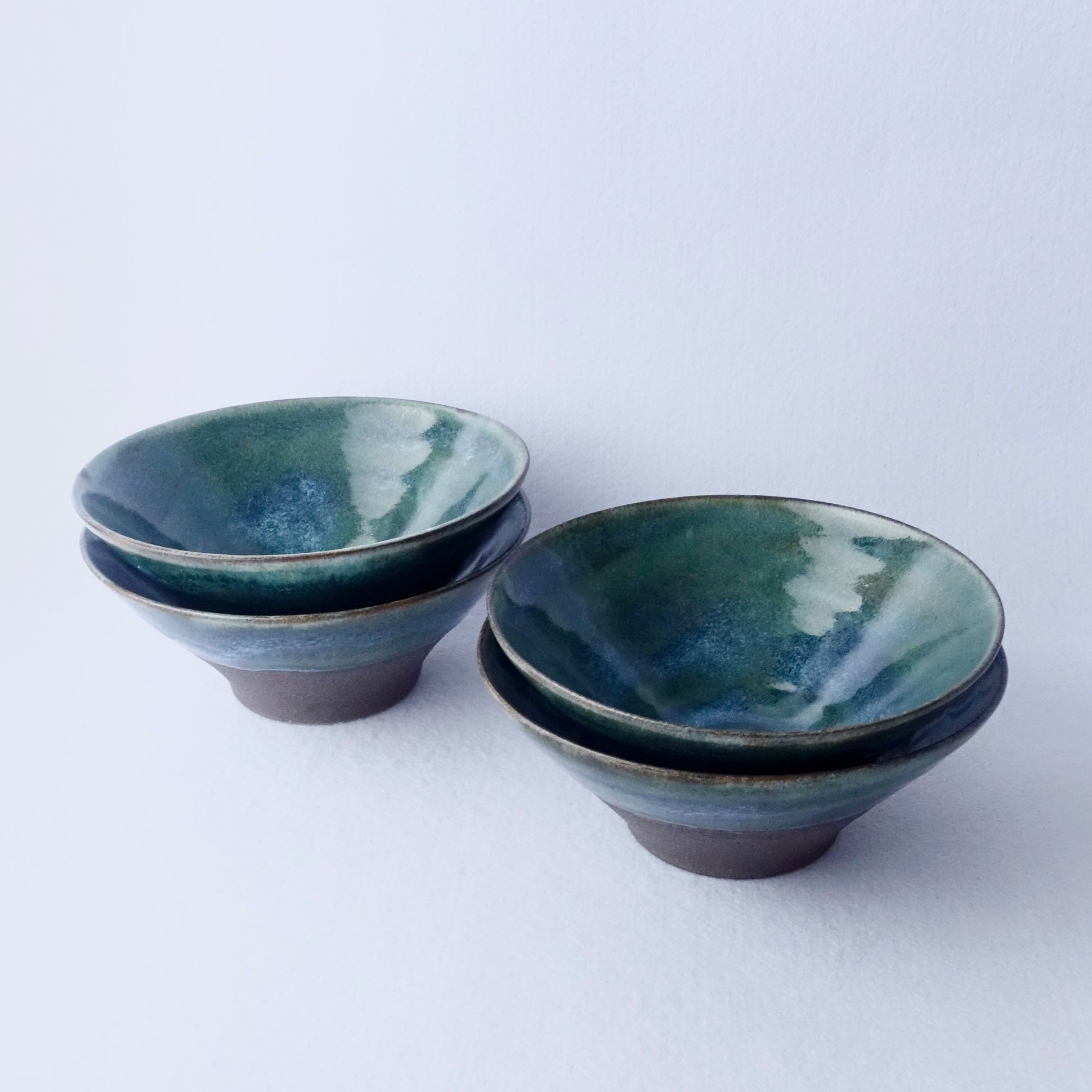 Dype, elegante skåler i mørk leire med glasur som spiller i blågrønne toner. Den glatte innsiden og det myke fargespillet minner om havets bevegelse, mens den solide foten gir et trygt og balansert uttrykk. Perfekte til varme supper, nudler eller en raus porsjon gryterett – og like fine til frokostblanding eller salat.