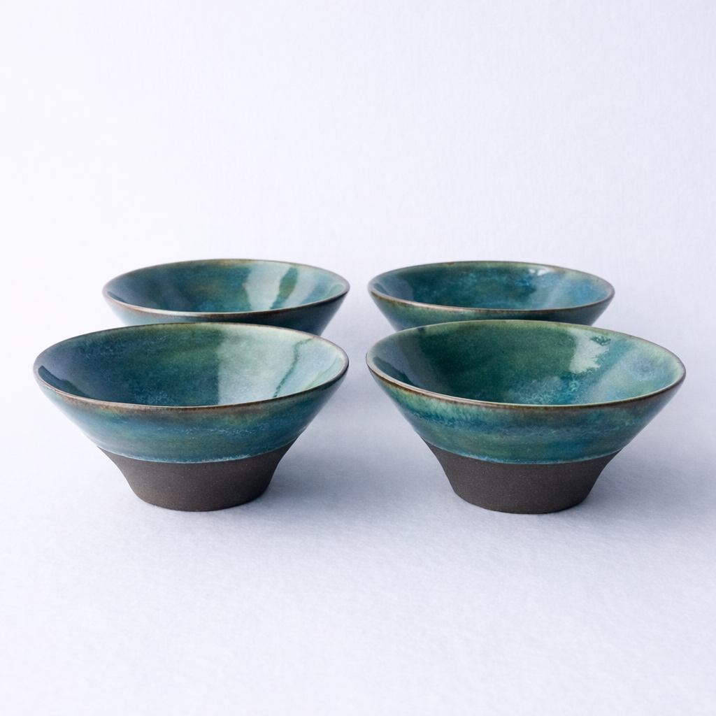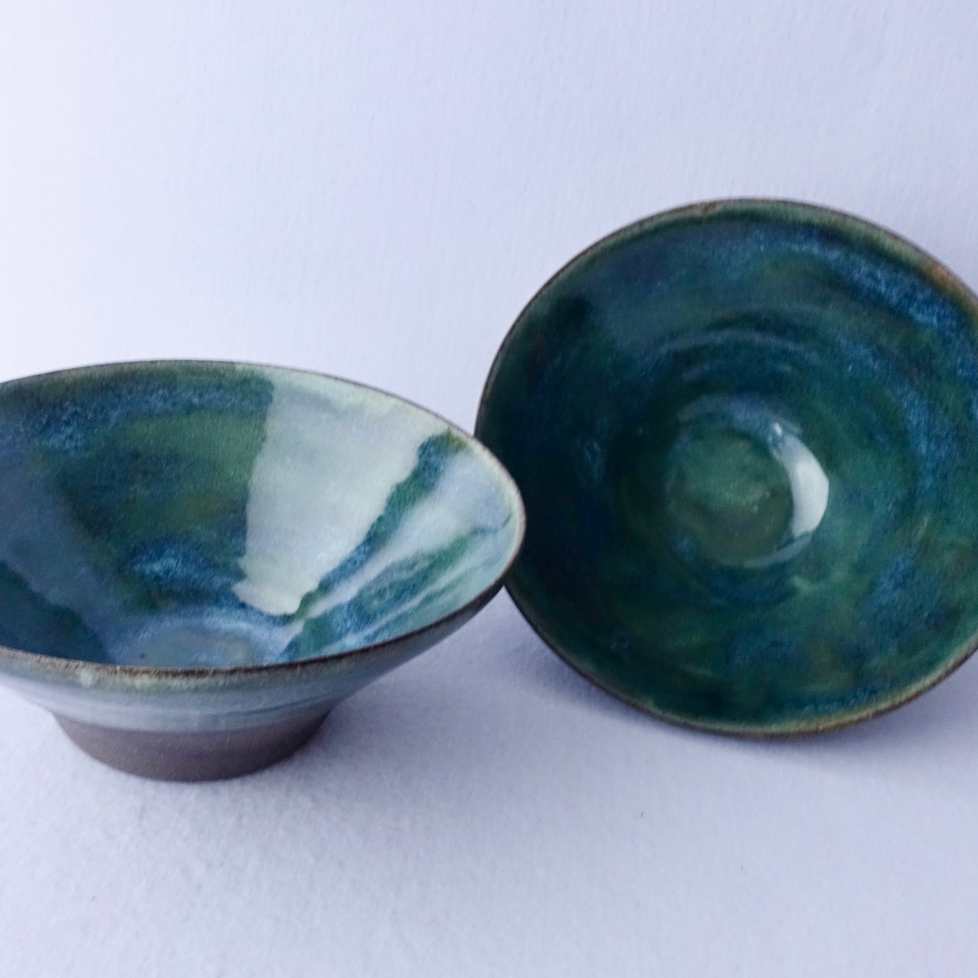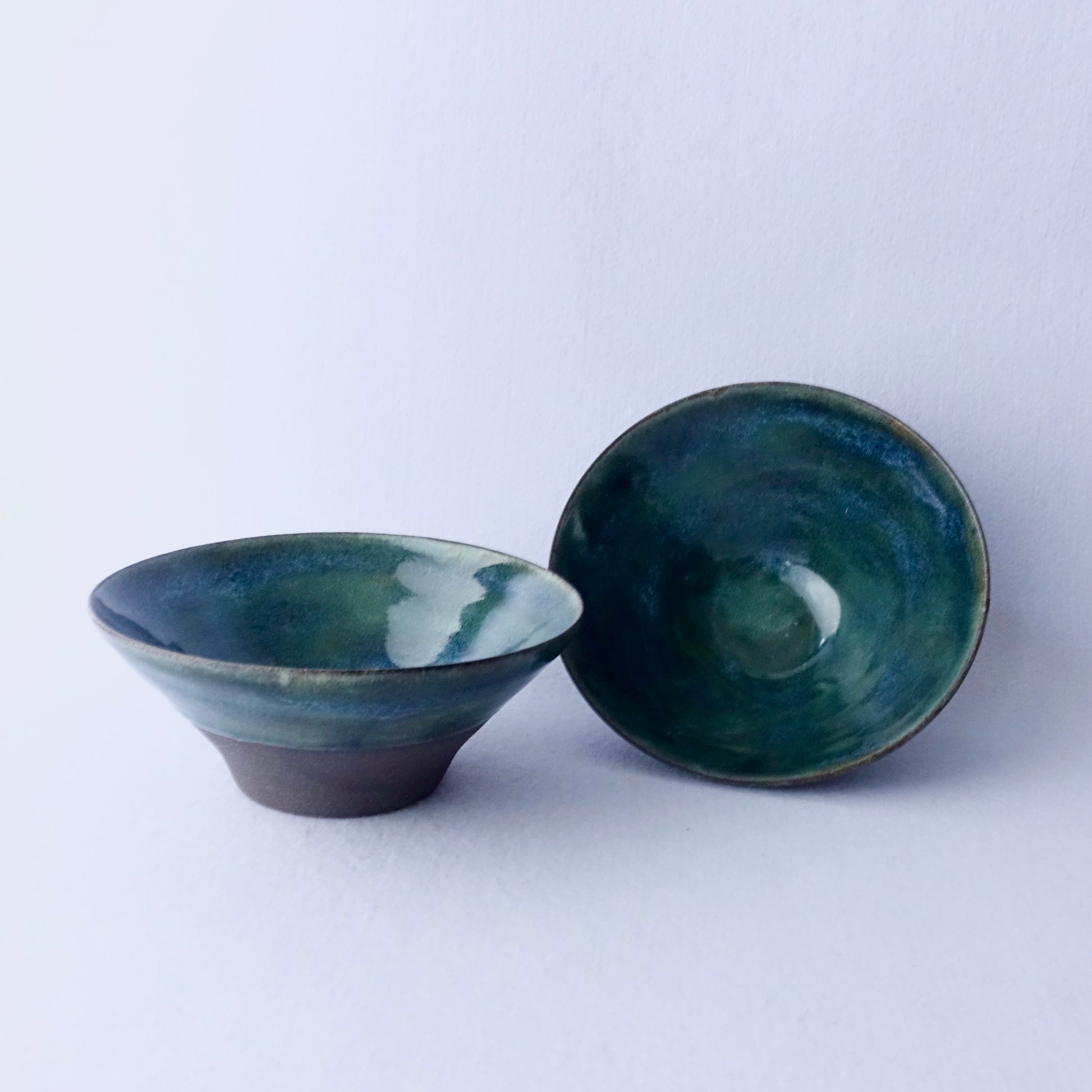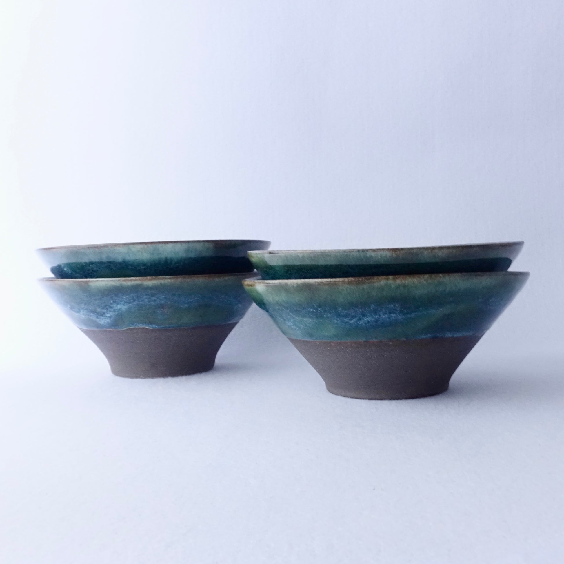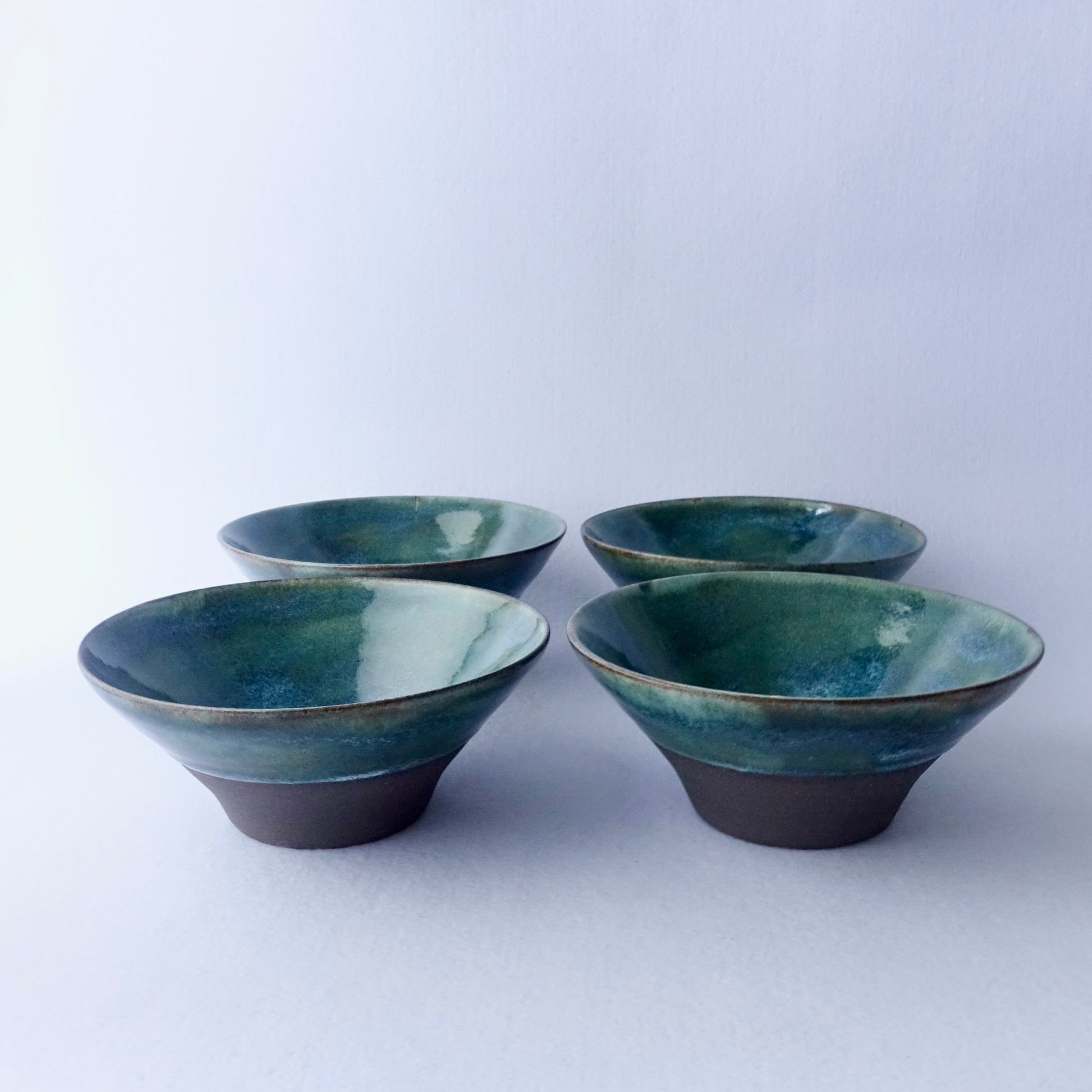 Dype, elegante skåler i mørk leire med glasur som spiller i blågrønne toner. Den glatte innsiden og det myke fargespillet minner om havets bevegelse, mens den solide foten gir et trygt og balansert uttrykk. Perfekte til varme supper, nudler eller en raus porsjon gryterett – og like fine til frokostblanding eller salat.