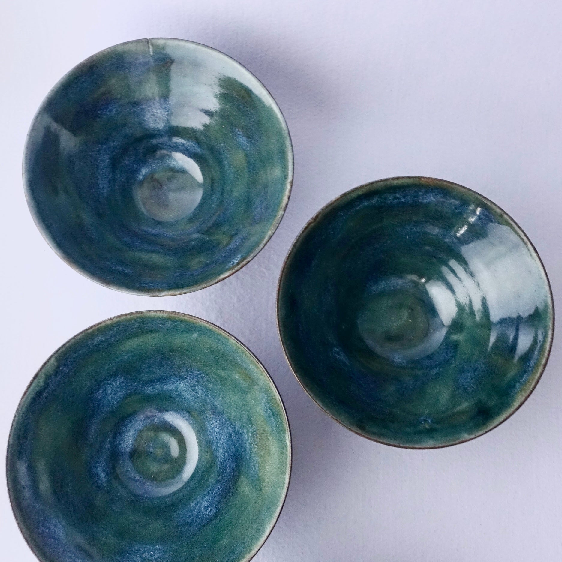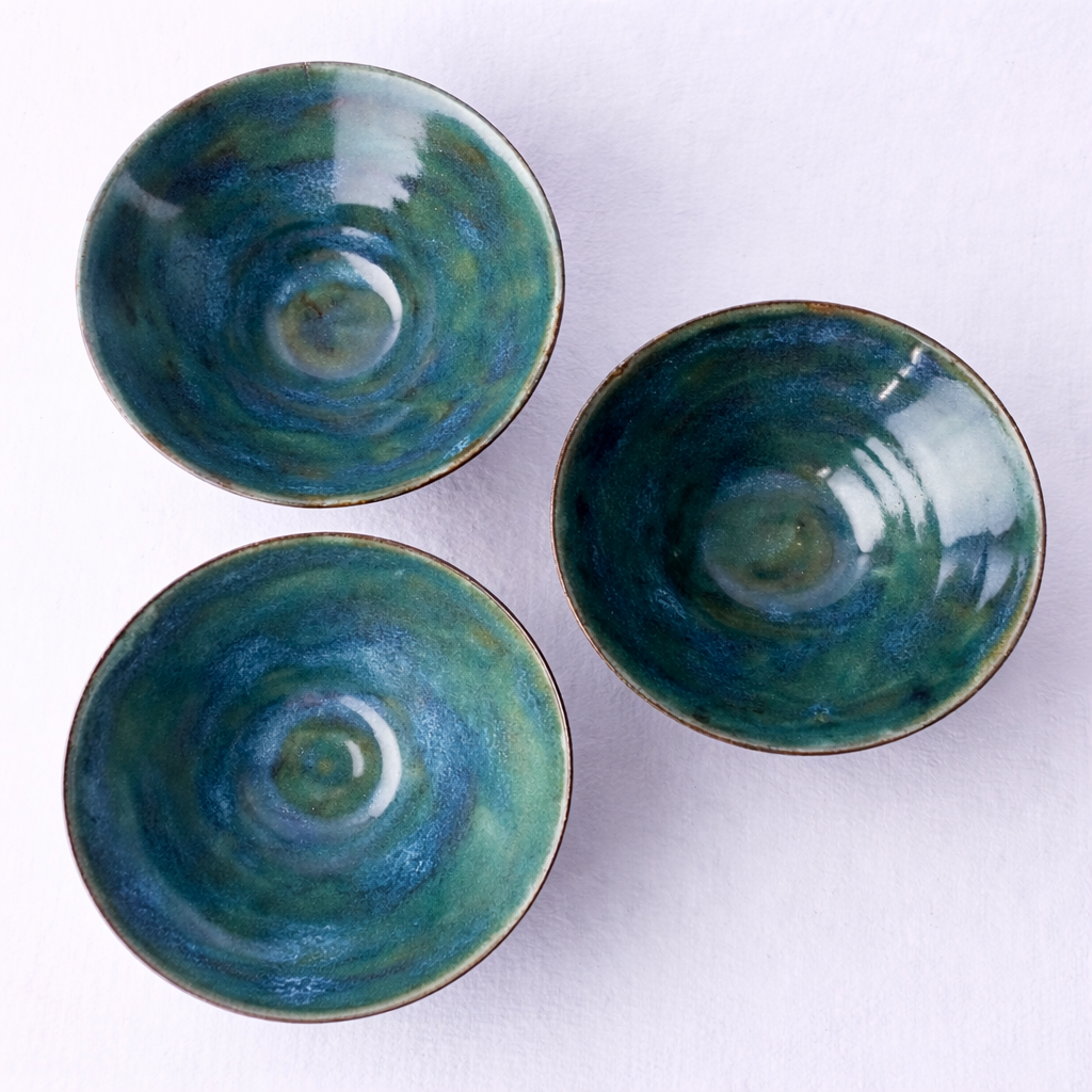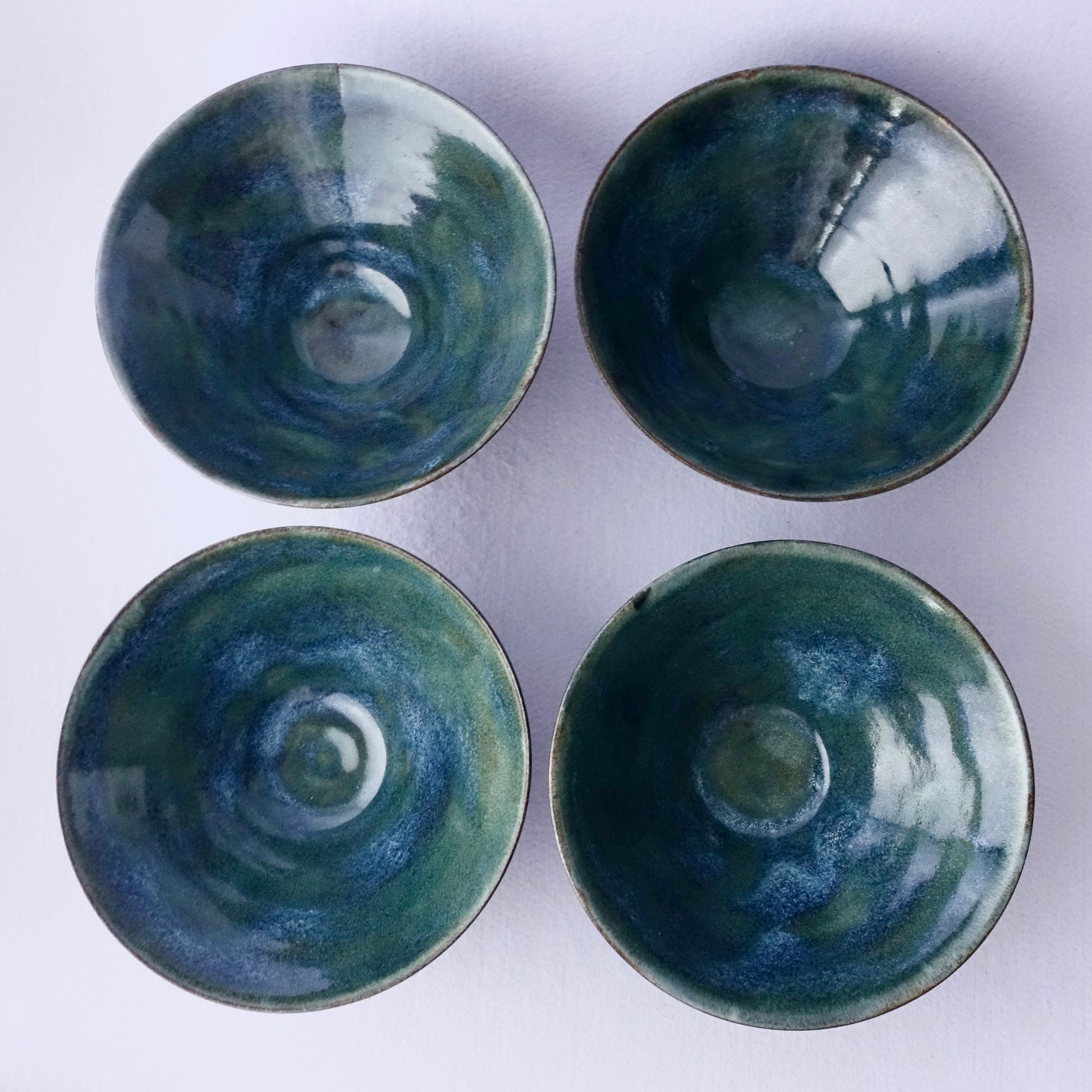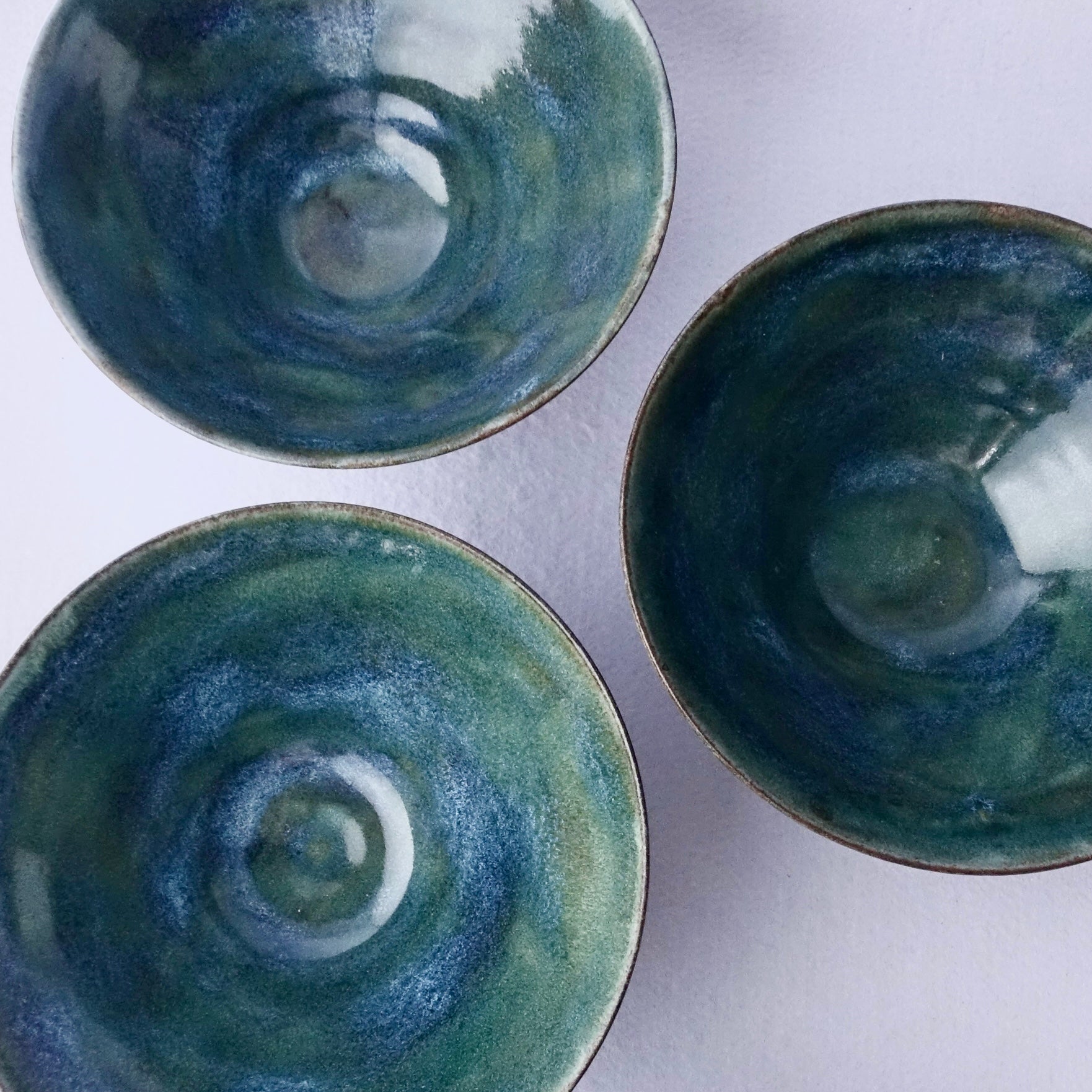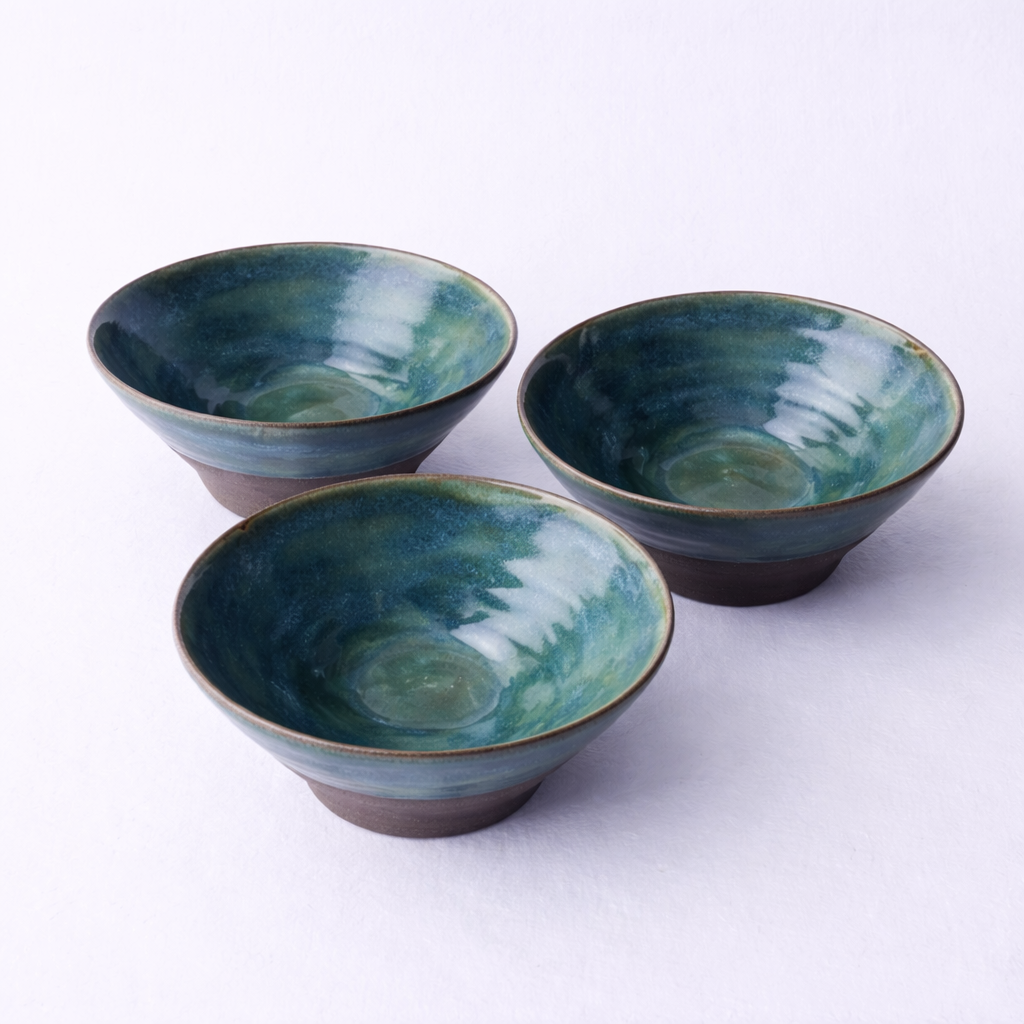Dype, elegante skåler i mørk leire med glasur som spiller i blågrønne toner. Den glatte innsiden og det myke fargespillet minner om havets bevegelse, mens den solide foten gir et trygt og balansert uttrykk. Perfekte til varme supper, nudler eller en raus porsjon gryterett – og like fine til frokostblanding eller salat.