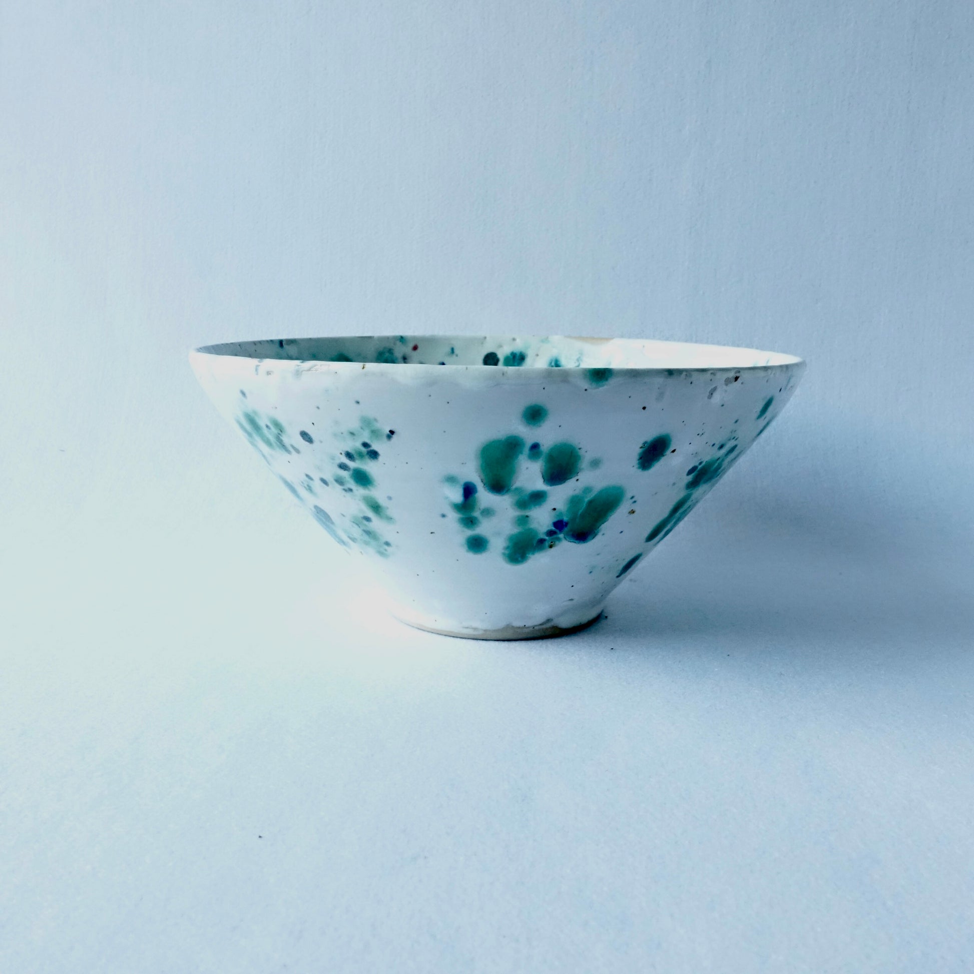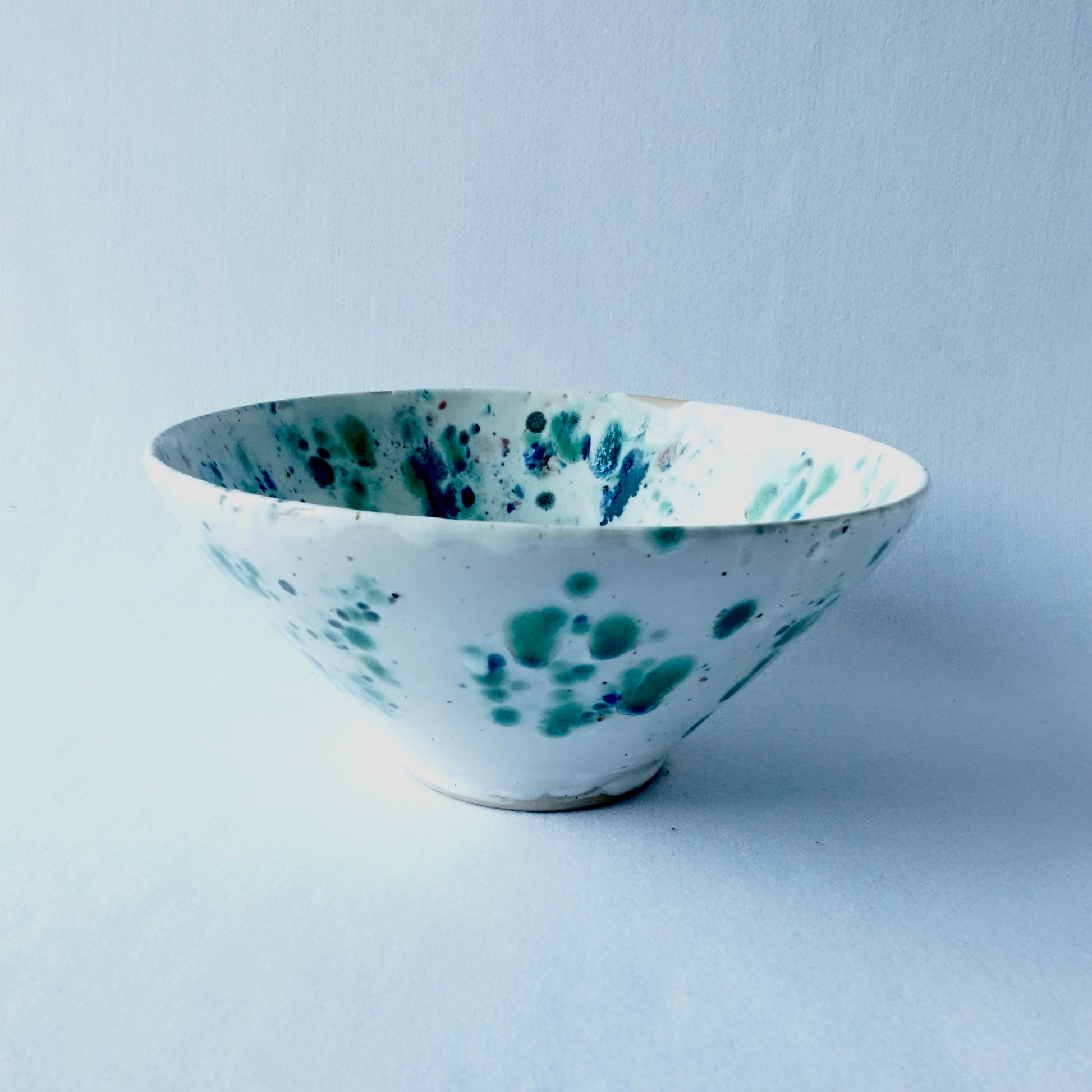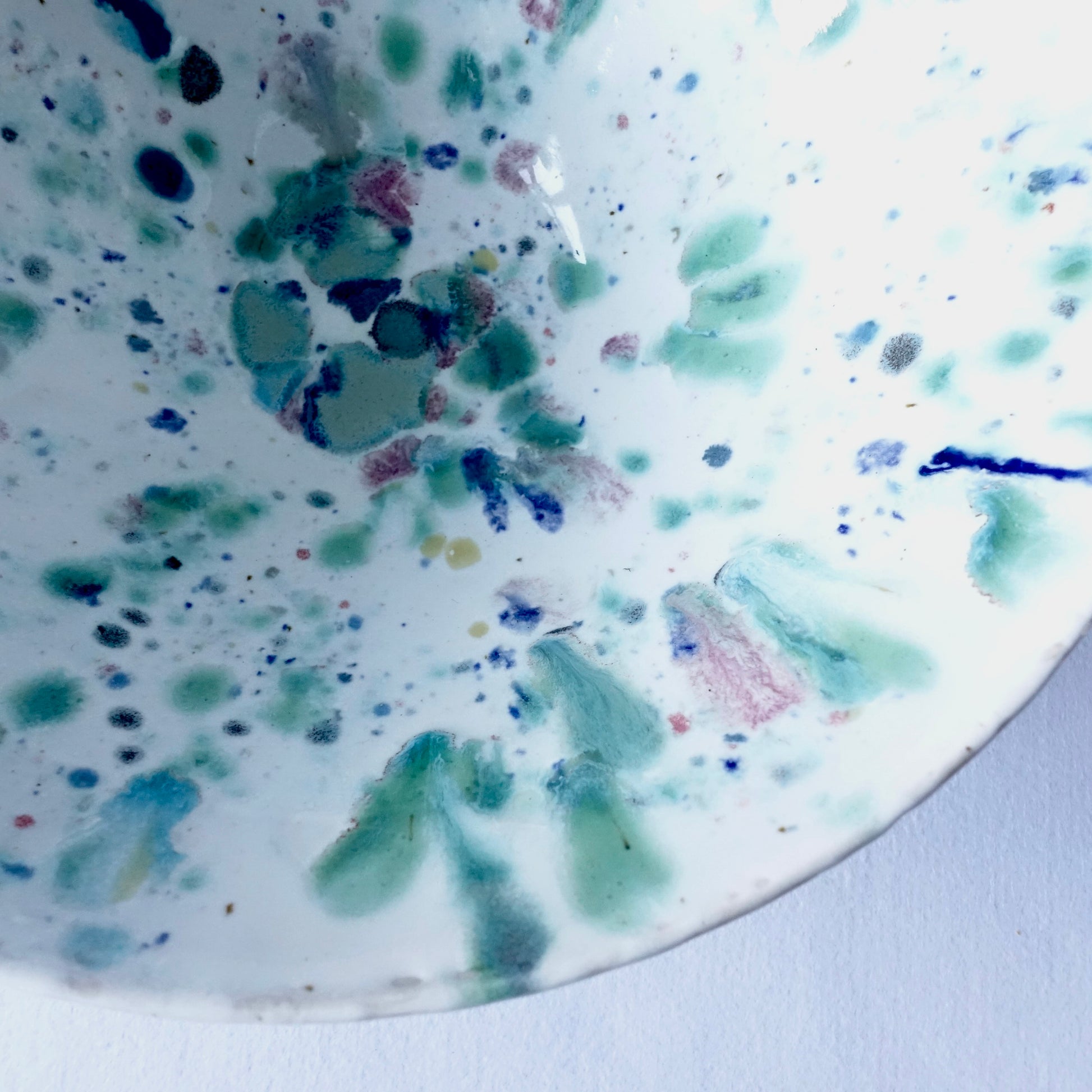 Håndlaget skål med lys bunn og levende innslag av grønne og blå glasursprut som gir et friskt, naturinspirert uttrykk. Skålen er dekorativ i seg selv, men også perfekt til småservering, frukt eller som et kunstnerisk element på bordet.