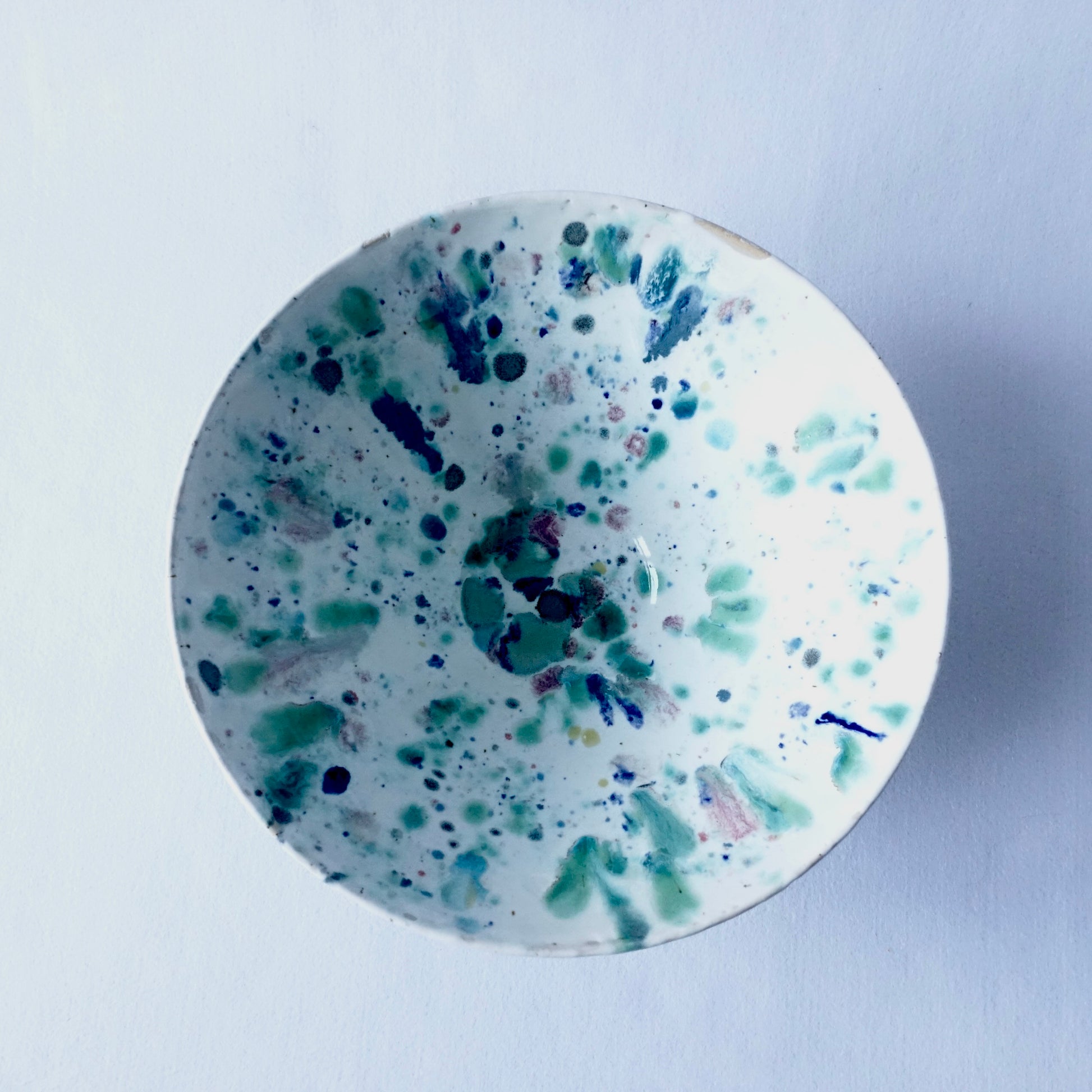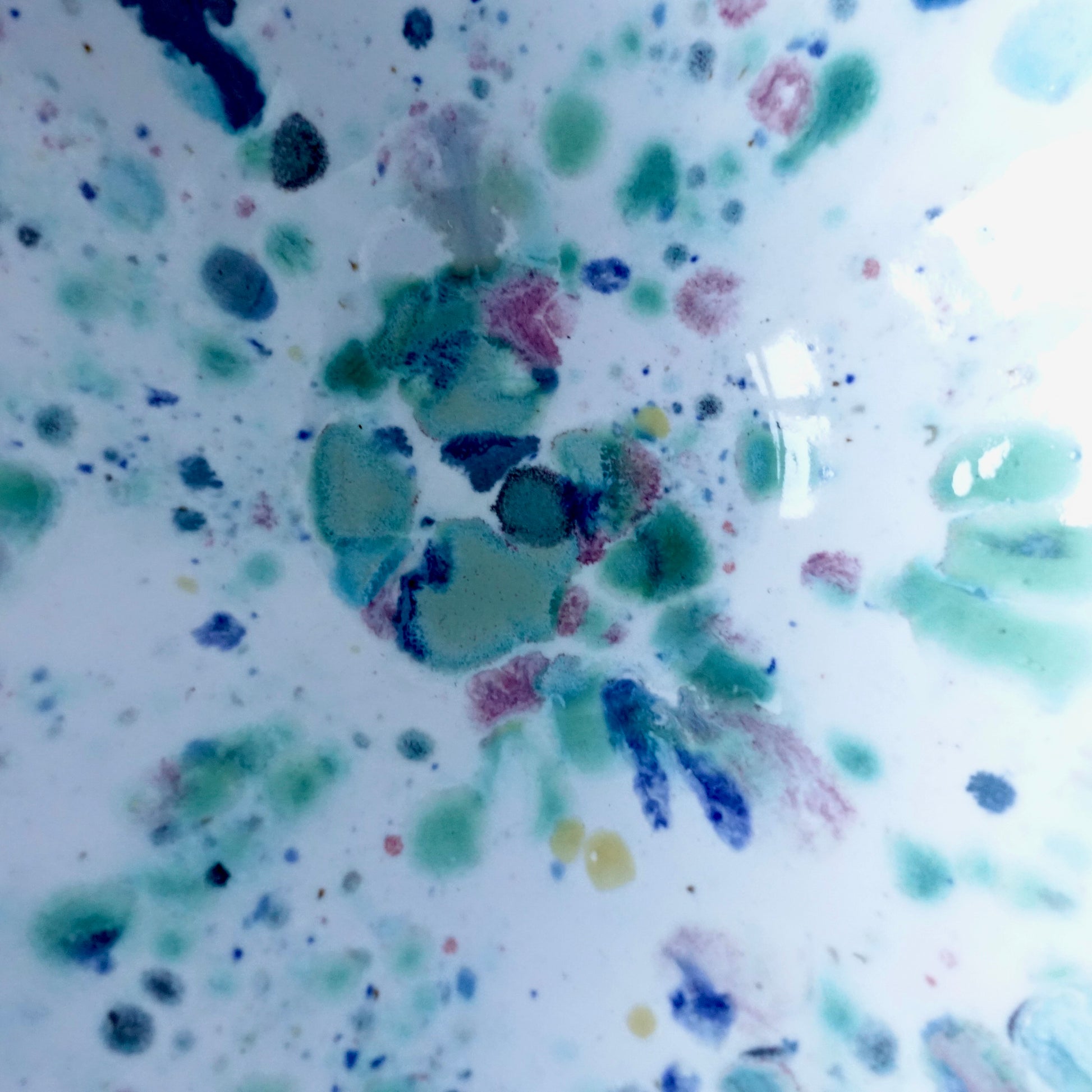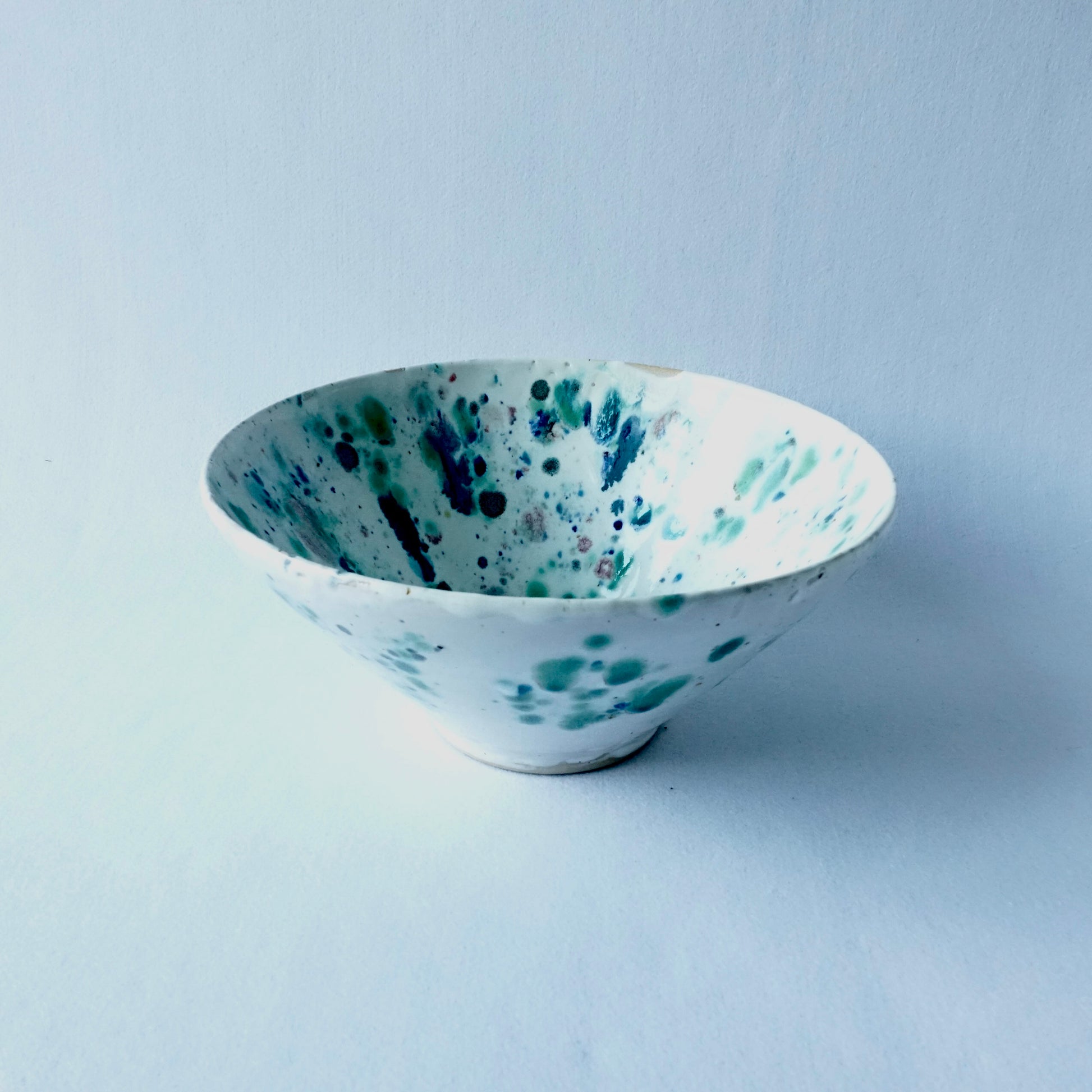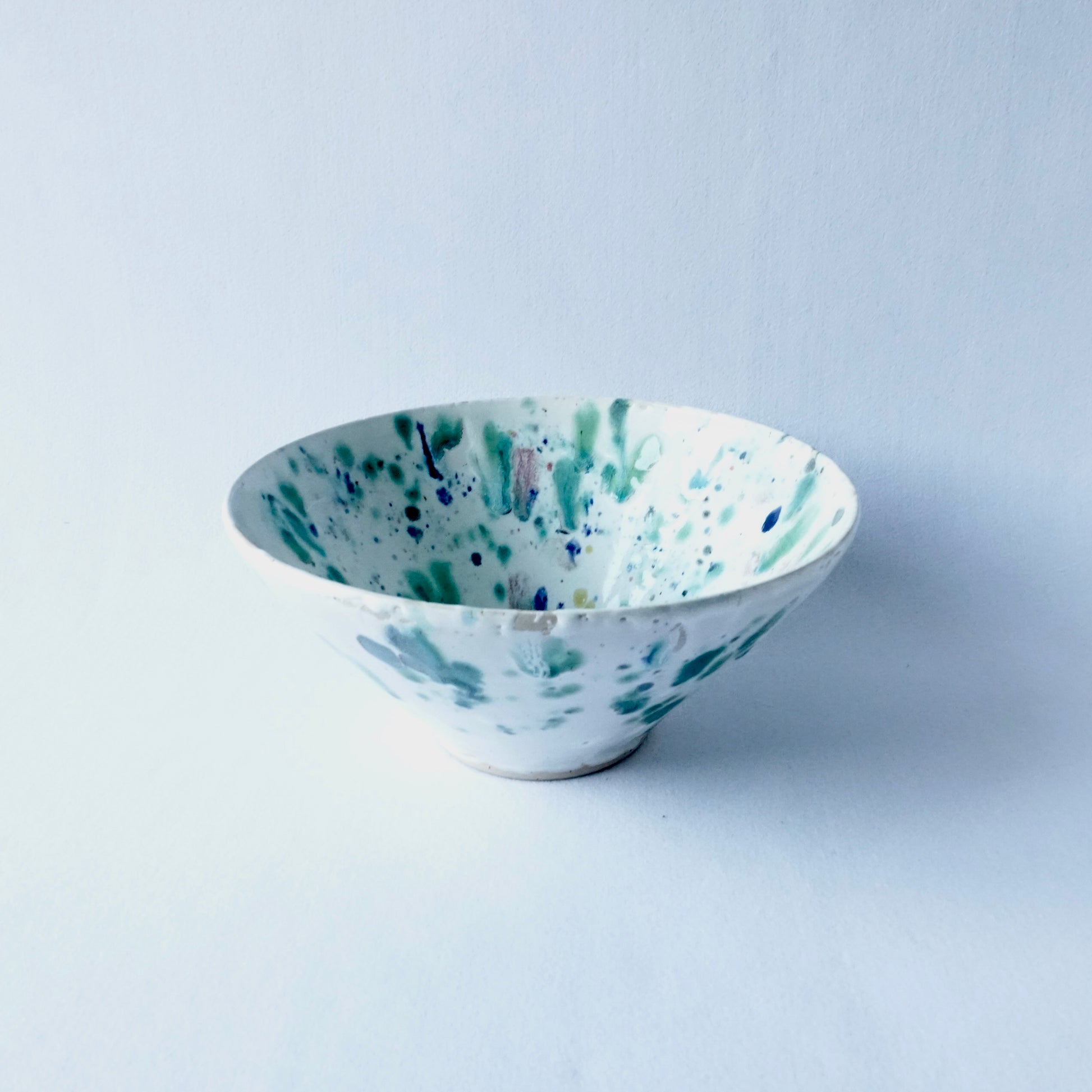 Håndlaget skål med lys bunn og levende innslag av grønne og blå glasursprut som gir et friskt, naturinspirert uttrykk. Skålen er dekorativ i seg selv, men også perfekt til småservering, frukt eller som et kunstnerisk element på bordet.