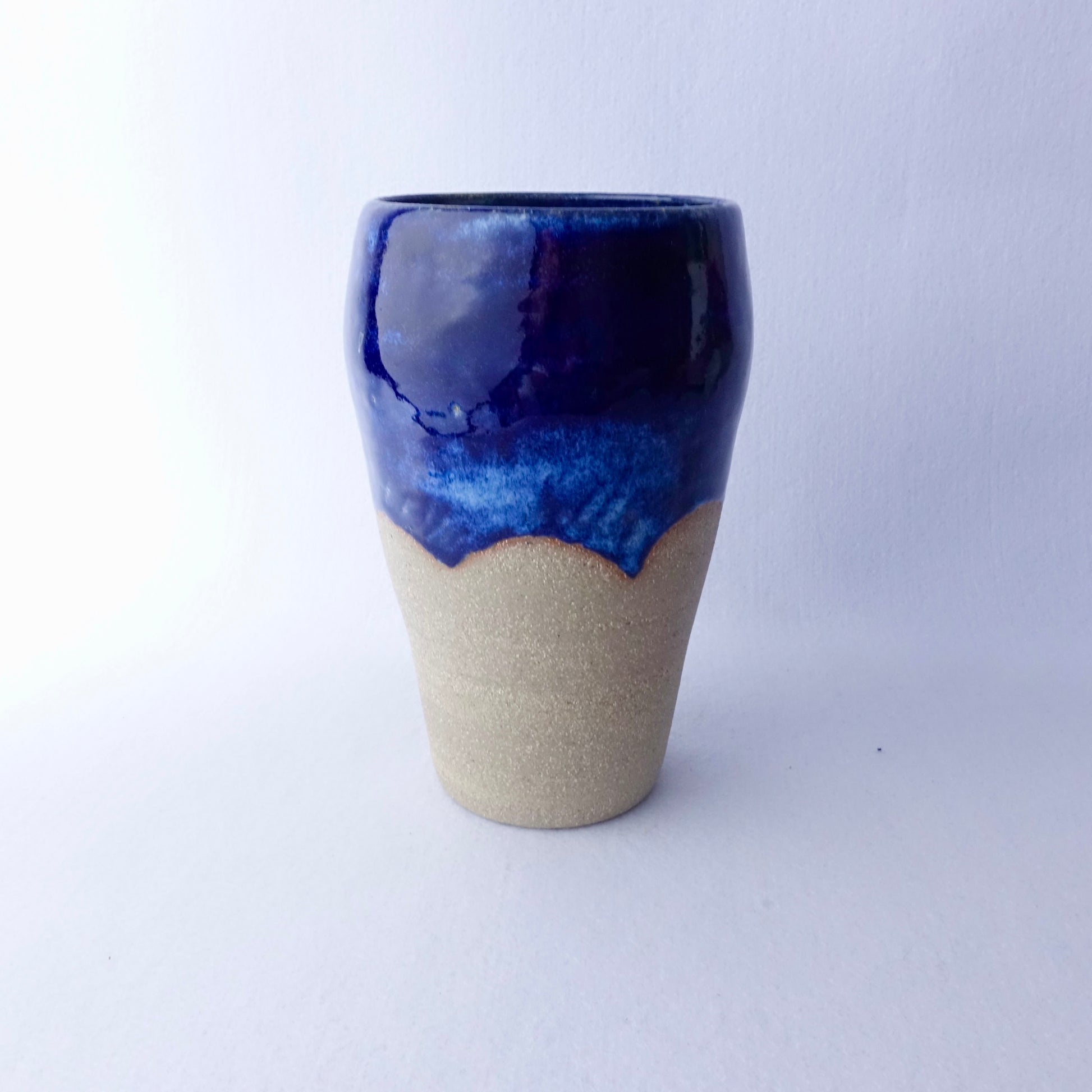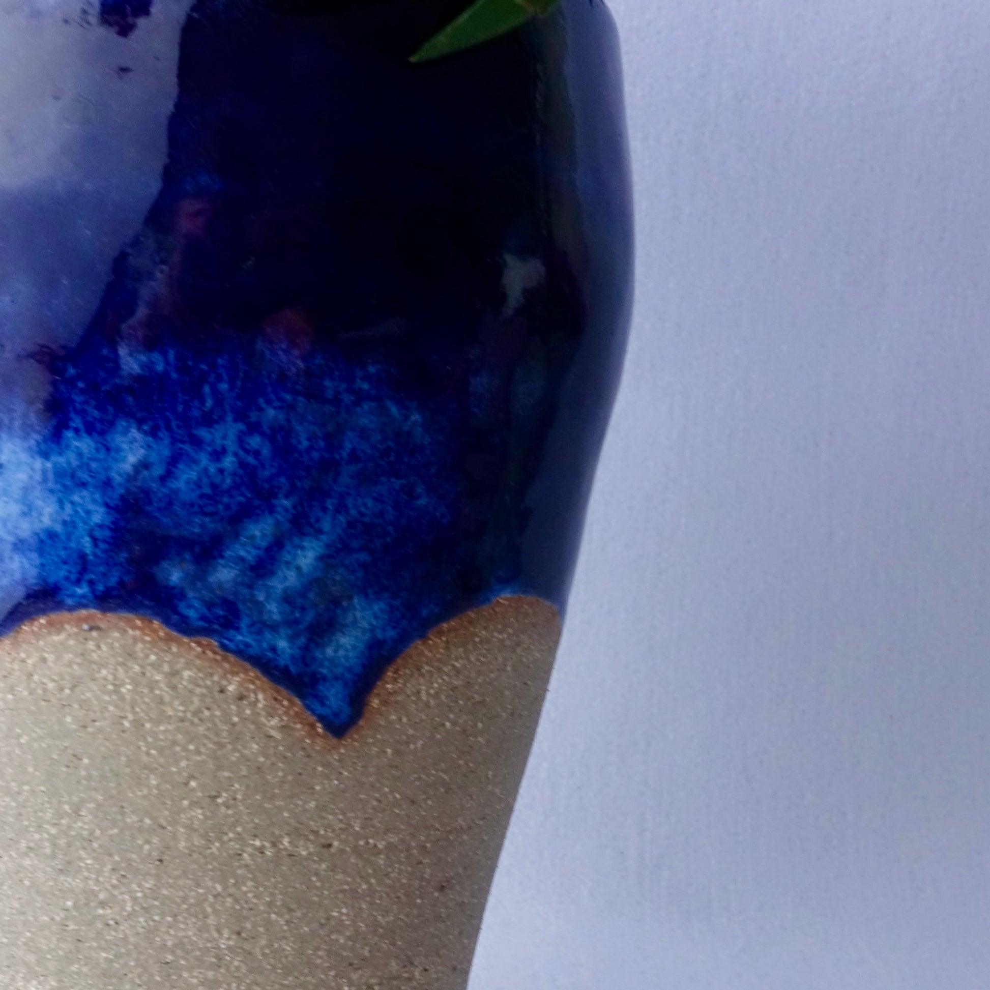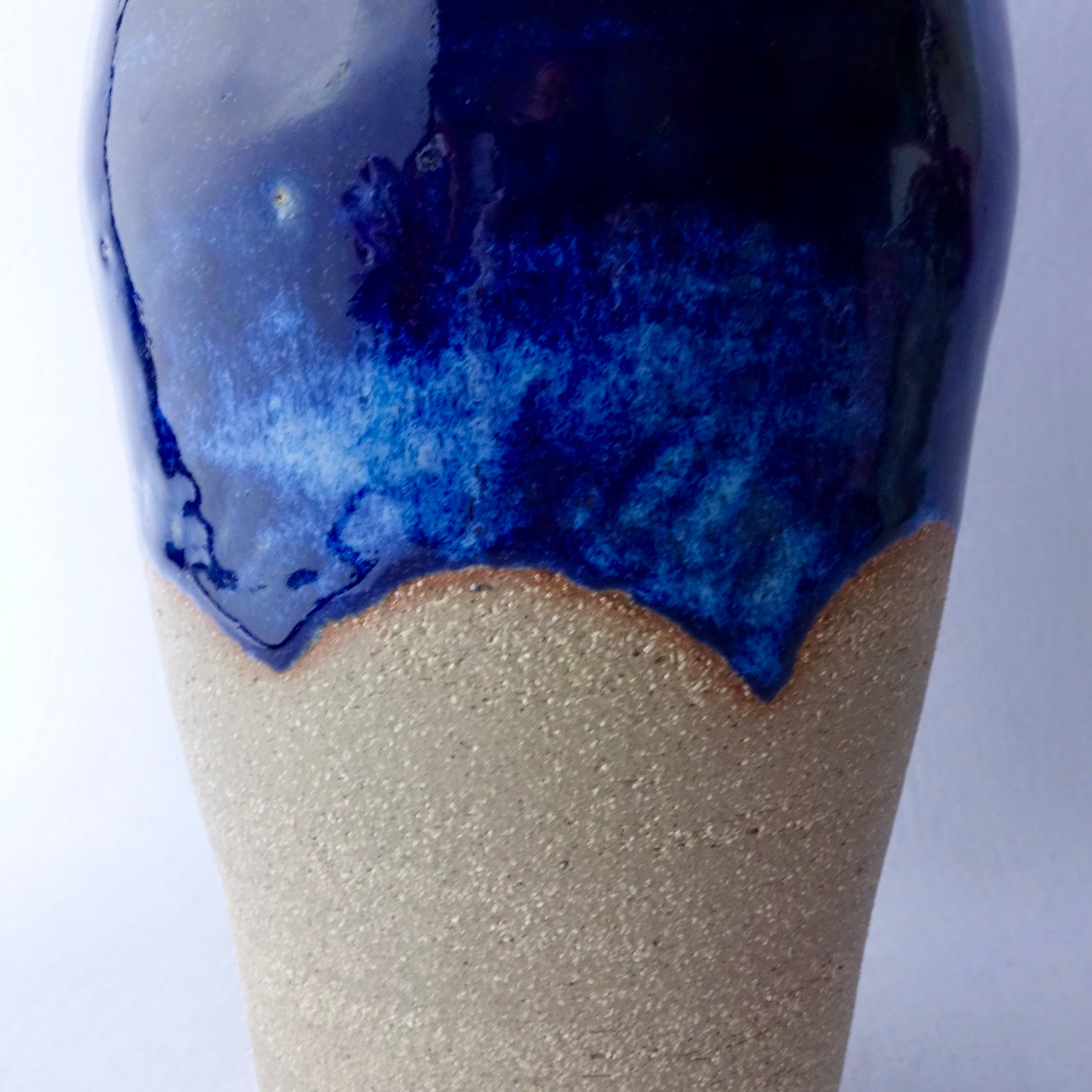 En hånddreid vase med en levende glasur i dyp blå og naturlig sandfarget leire. Overgangen mellom glasuren og den matte overflaten gir et inntrykk av fjell mot kveldshimmel – et vakkert blikkfang både med og uten blomster. Vasen passer like godt til fargerike buketter som til enkle grønne kvister.