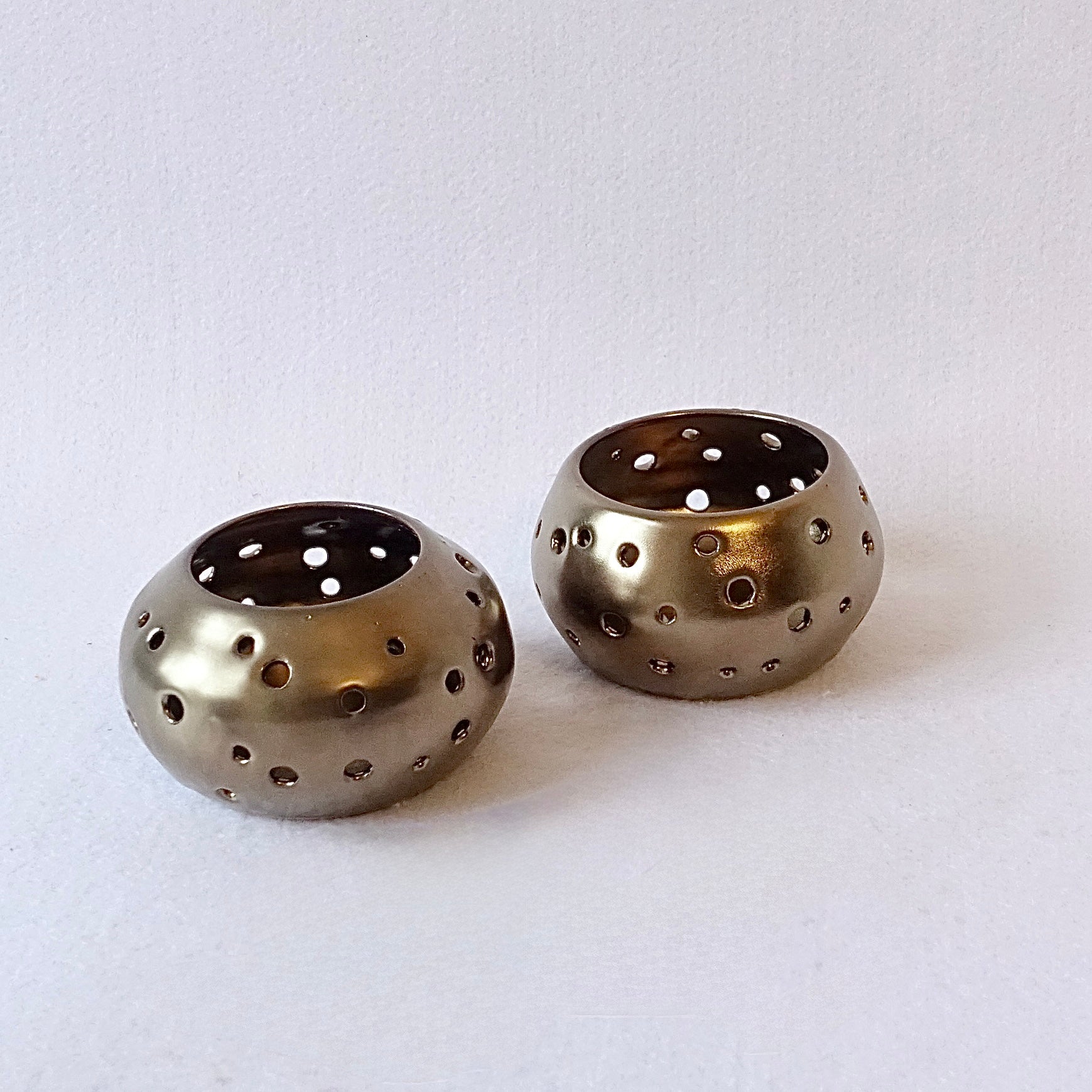 Unike lyslykter med organisk hullmønster som skaper vakre lysspill. Metallisk gullglasur gir et varmt og elegant preg. Passer perfekt til jul men også ellers i året.